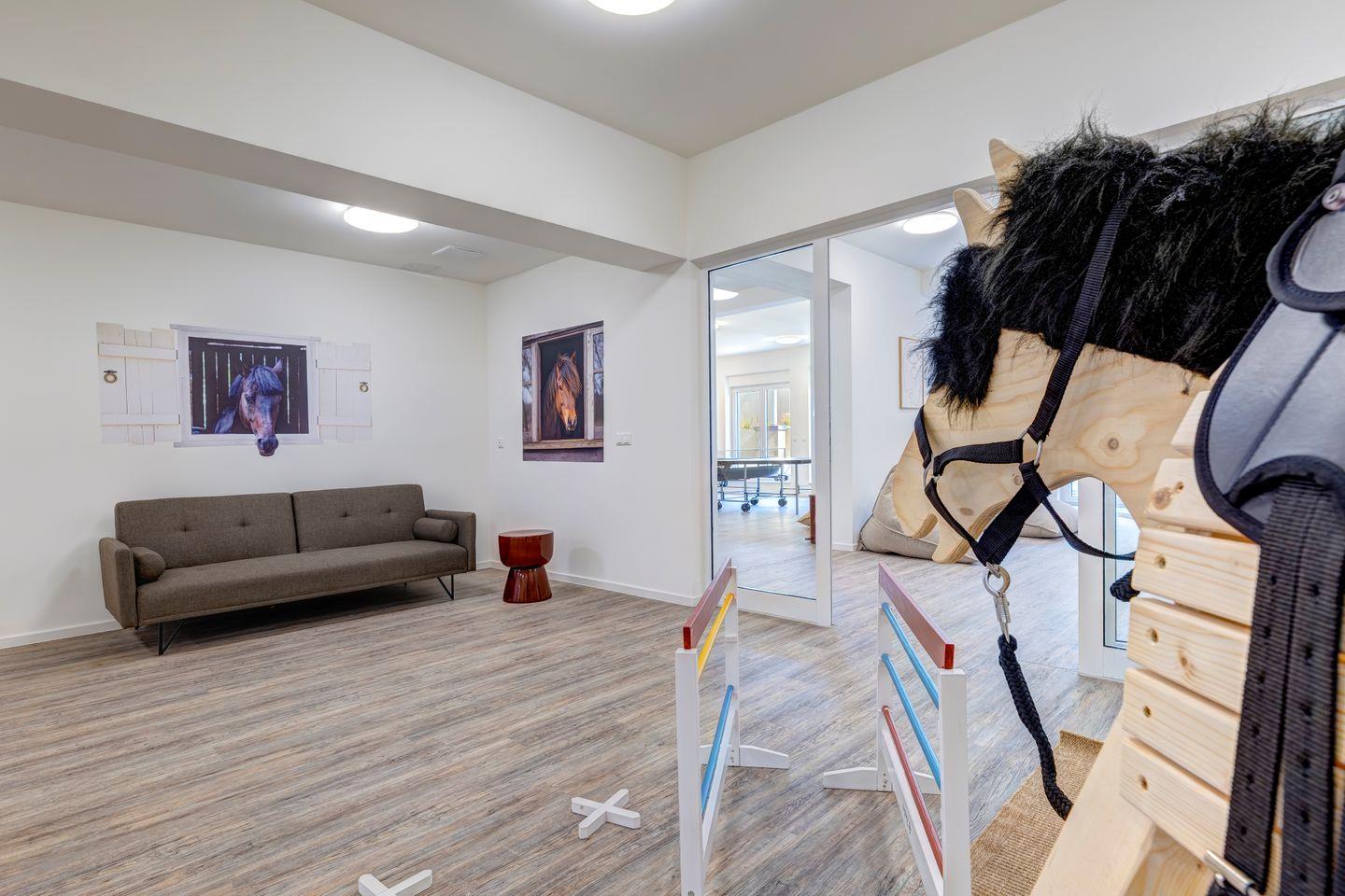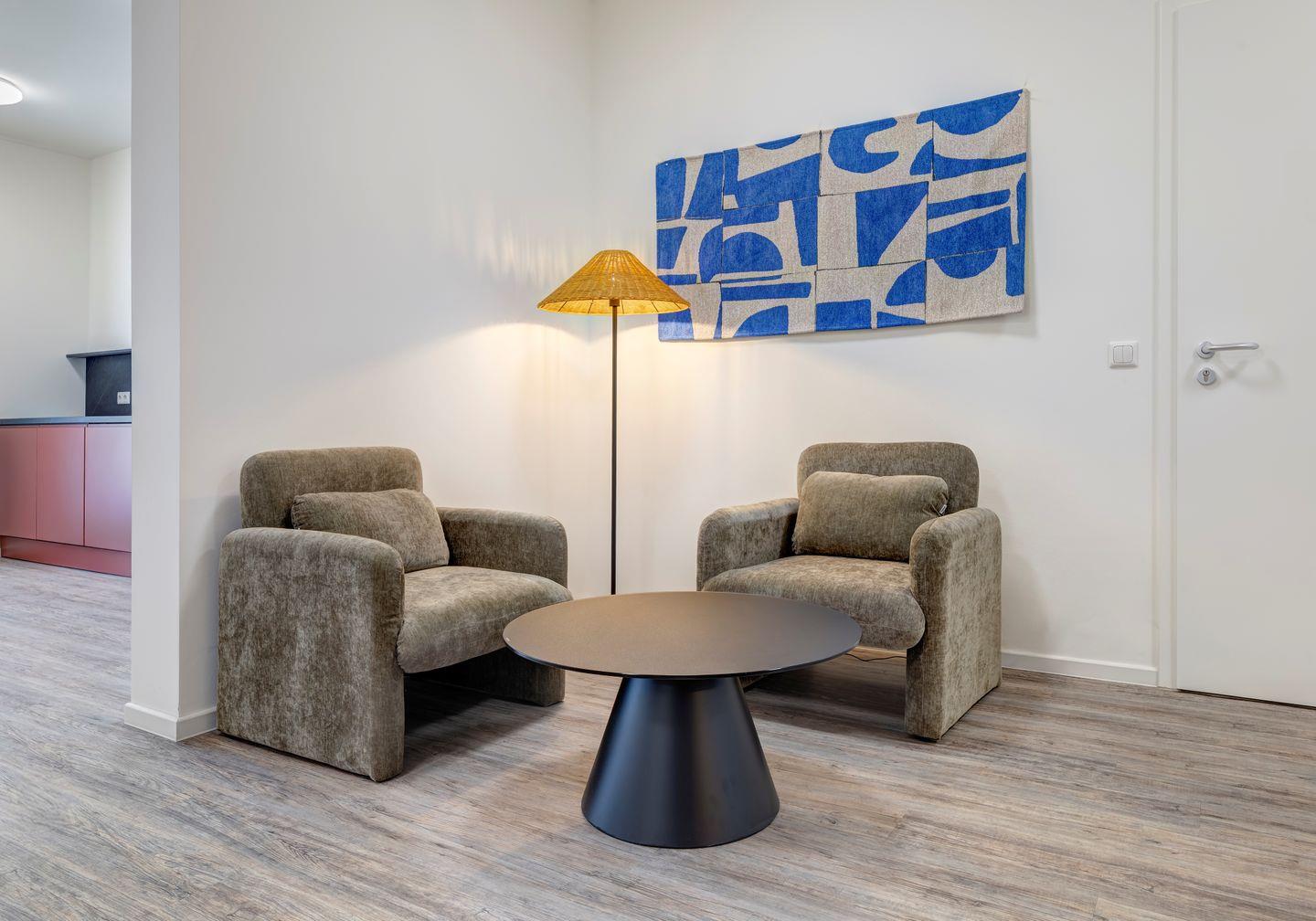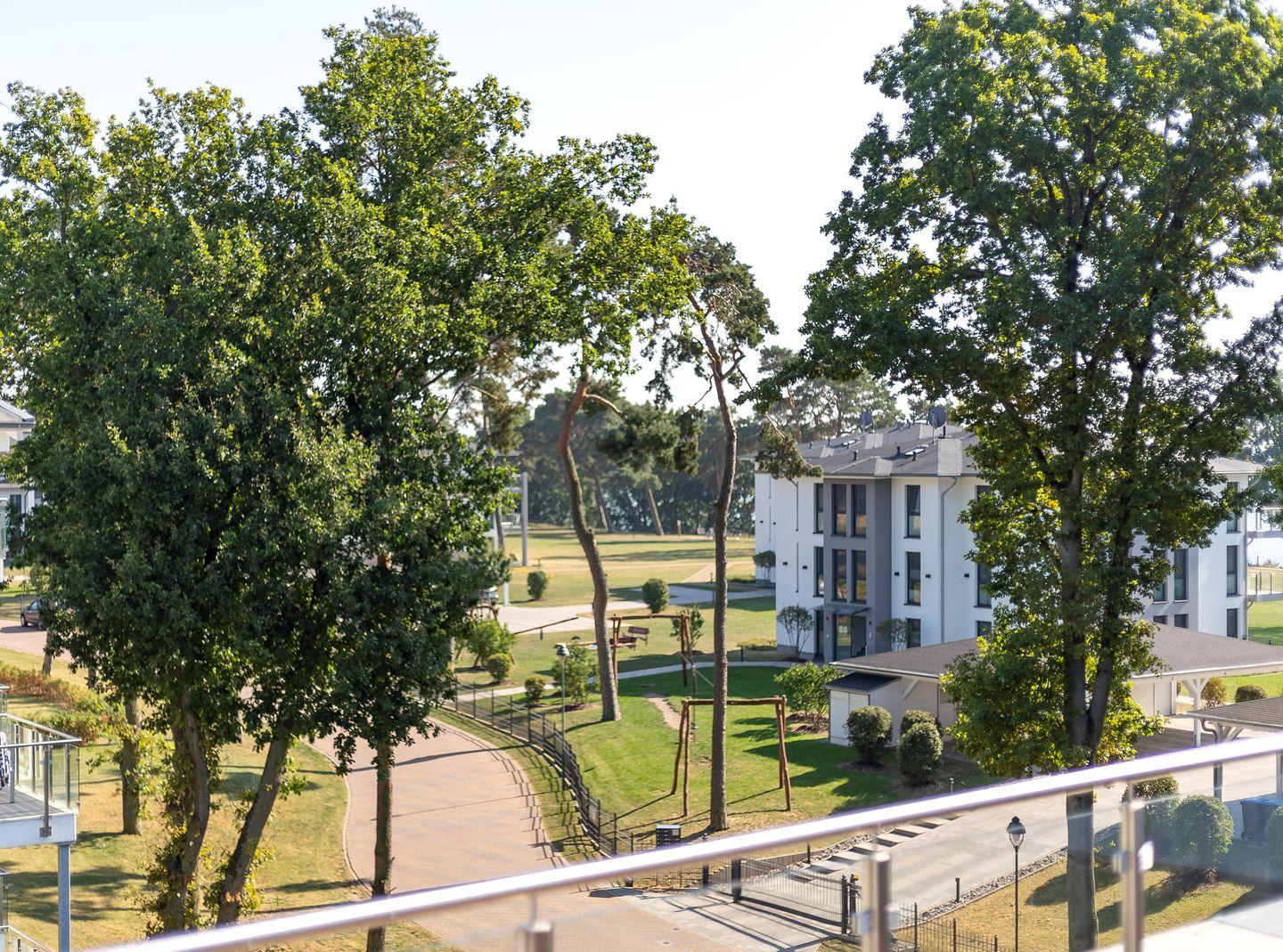 Das Wohnzimmer empfängt Sie mit gemütlichen Sitzgelegenheiten und großzügigen Fenstern, die einen herrlichen Ausblick auf das Grüne und das Haff bieten, und lädt zum entspannten Verweilen ein.