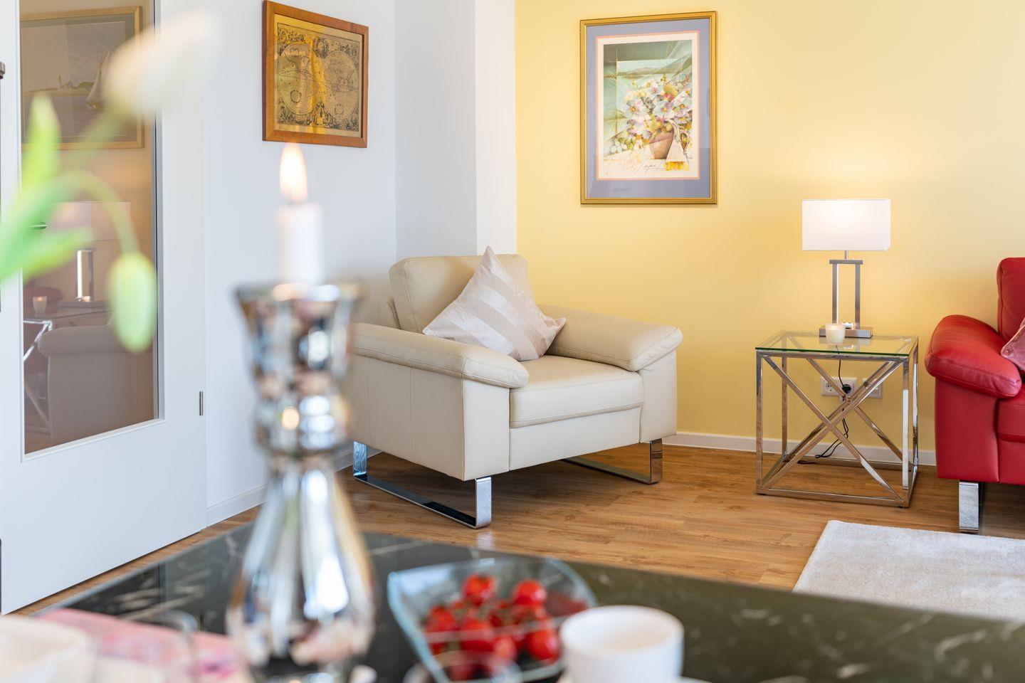 Das Apartment mit Balkon und Haffblick verfügt über 2 Schlafzimmer, 1 Wohnzimmer mit Kamin, Smart-TV, eine vollständig ausgestattete Küche mit Geschirrspüler und Backofen sowie 2 Badezimmern mit einer ebenerdigen Dusche. Handtücher und Bettwäsche werden im Apartment gestellt. Die komfortablen Boxspringbett bieten erholsame Nächte.