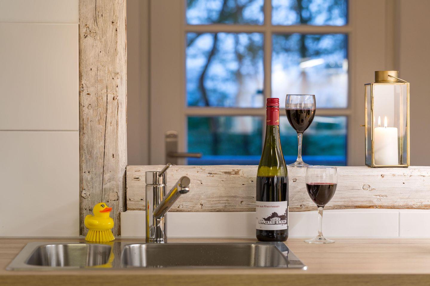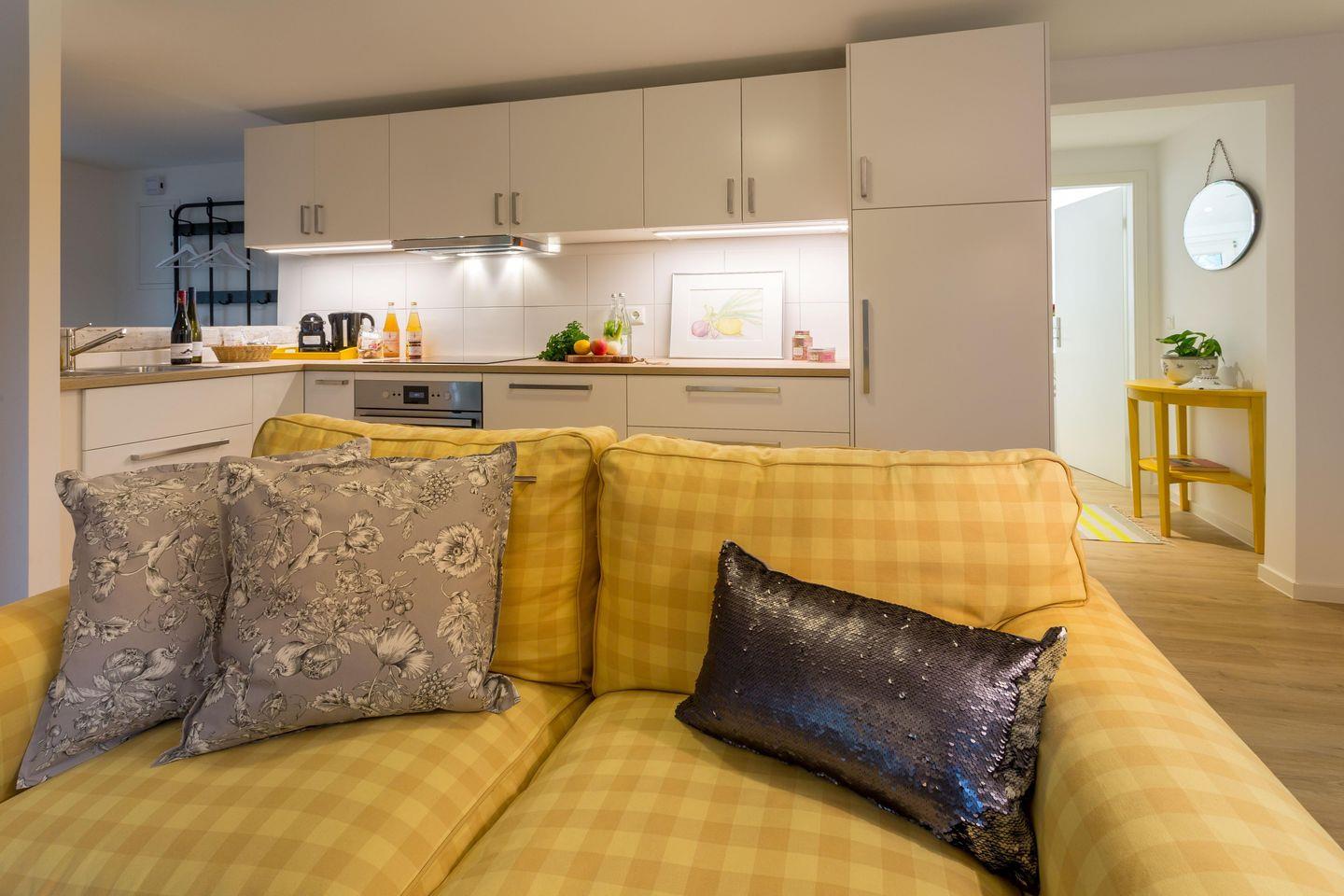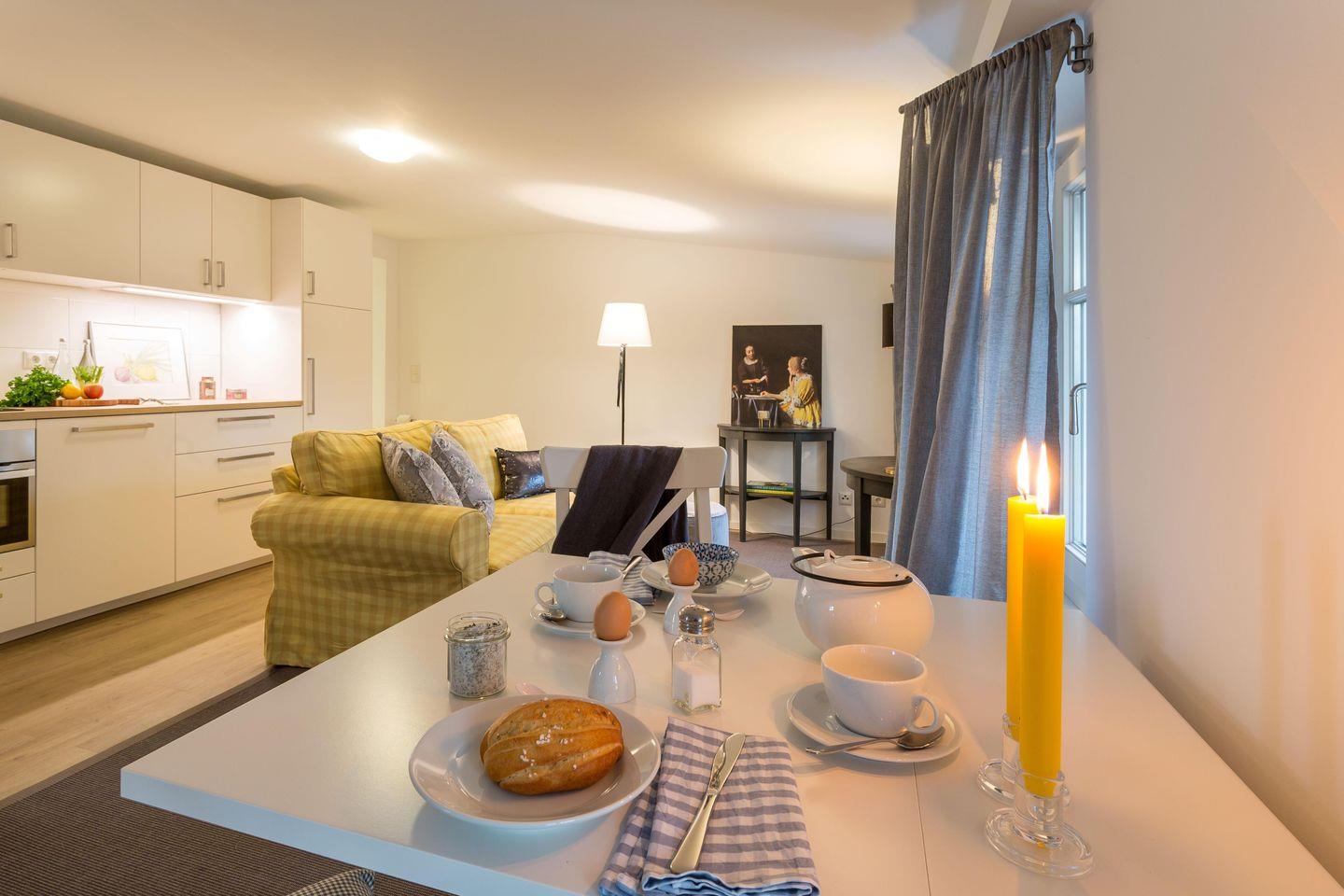 Auf 45 m² finden Sie eine offene, voll ausgestattete Wohnküche mit Backofen/Mikrowelle, Kühlschrank mit Gefrierkombination und einem Esstisch.