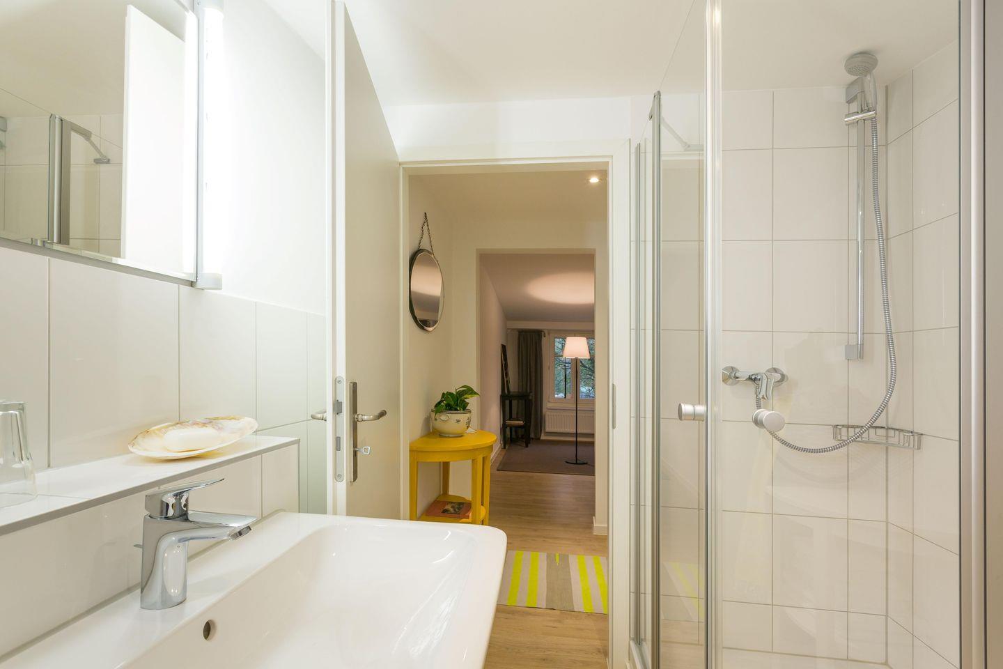 Das separate Bad umfasst Dusche, WC, Waschbecken und Ablagemöglichkeiten. Im Schlafzimmer gibt es einen Kleiderschrank und ein großzügiges Doppelbett (180x200).