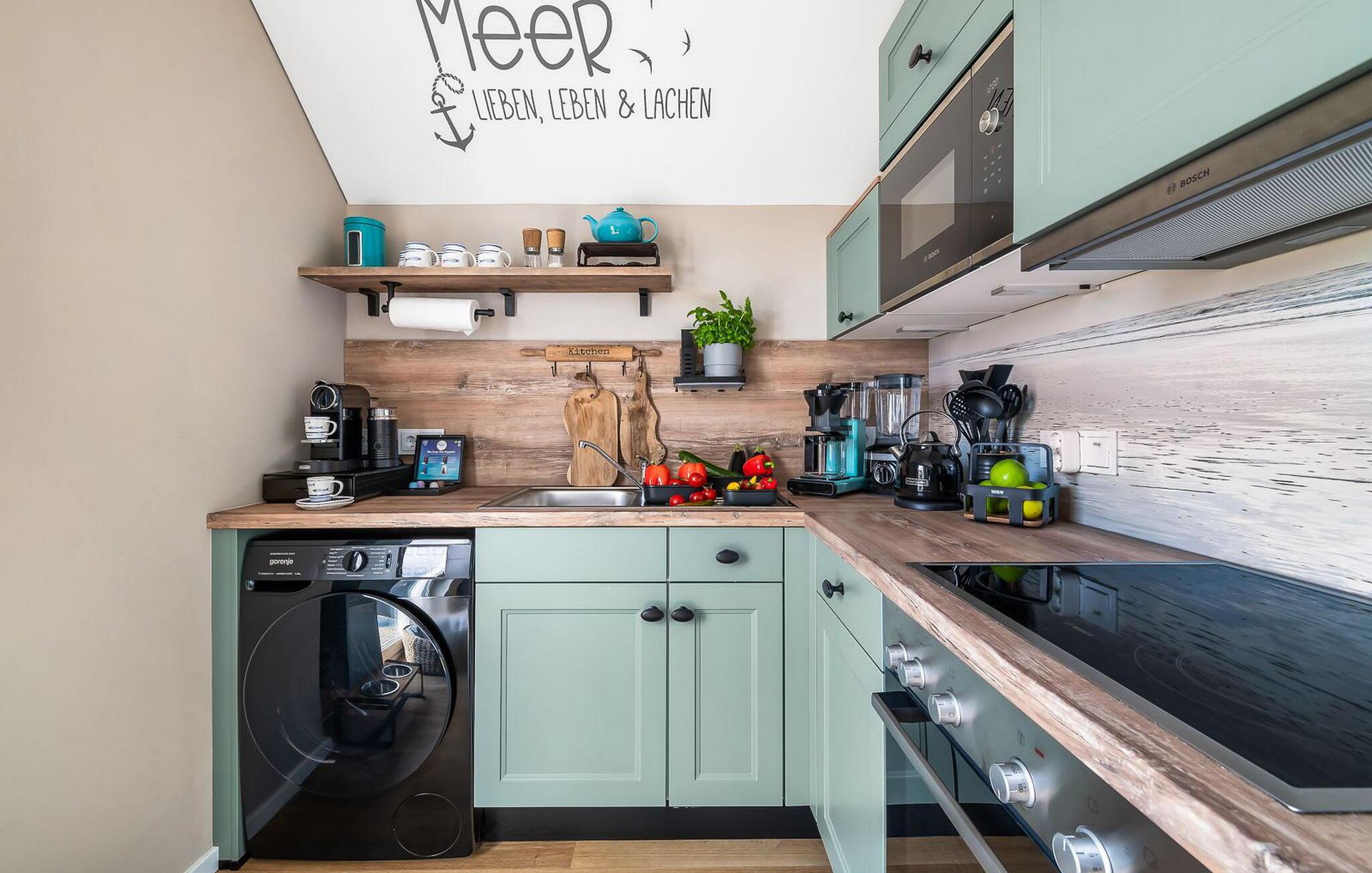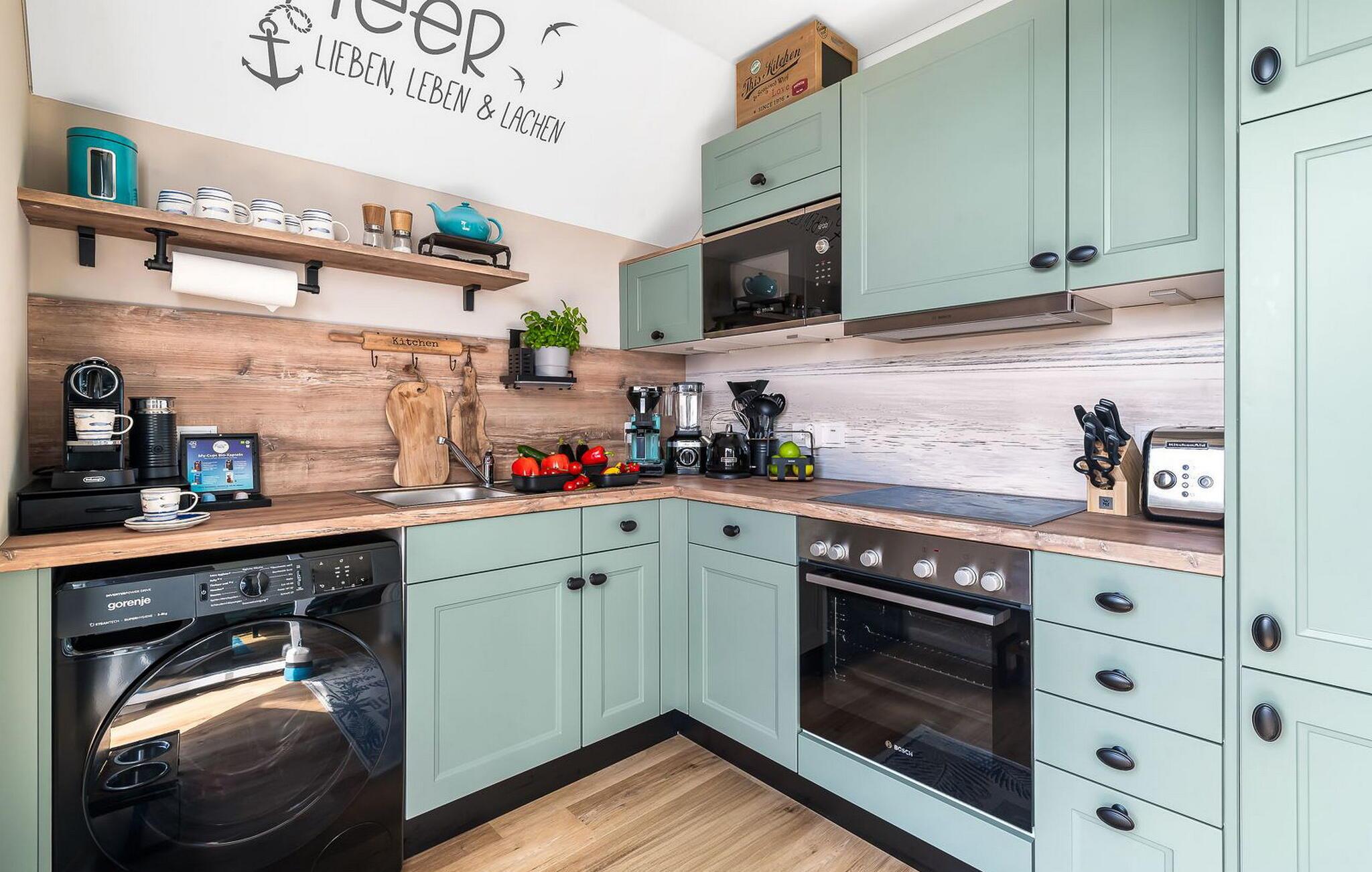 I det farvekoordinerede køkken med mærkevareapparater finder amatørkokke alt, hvad de har brug for til kulinariske udflugter.