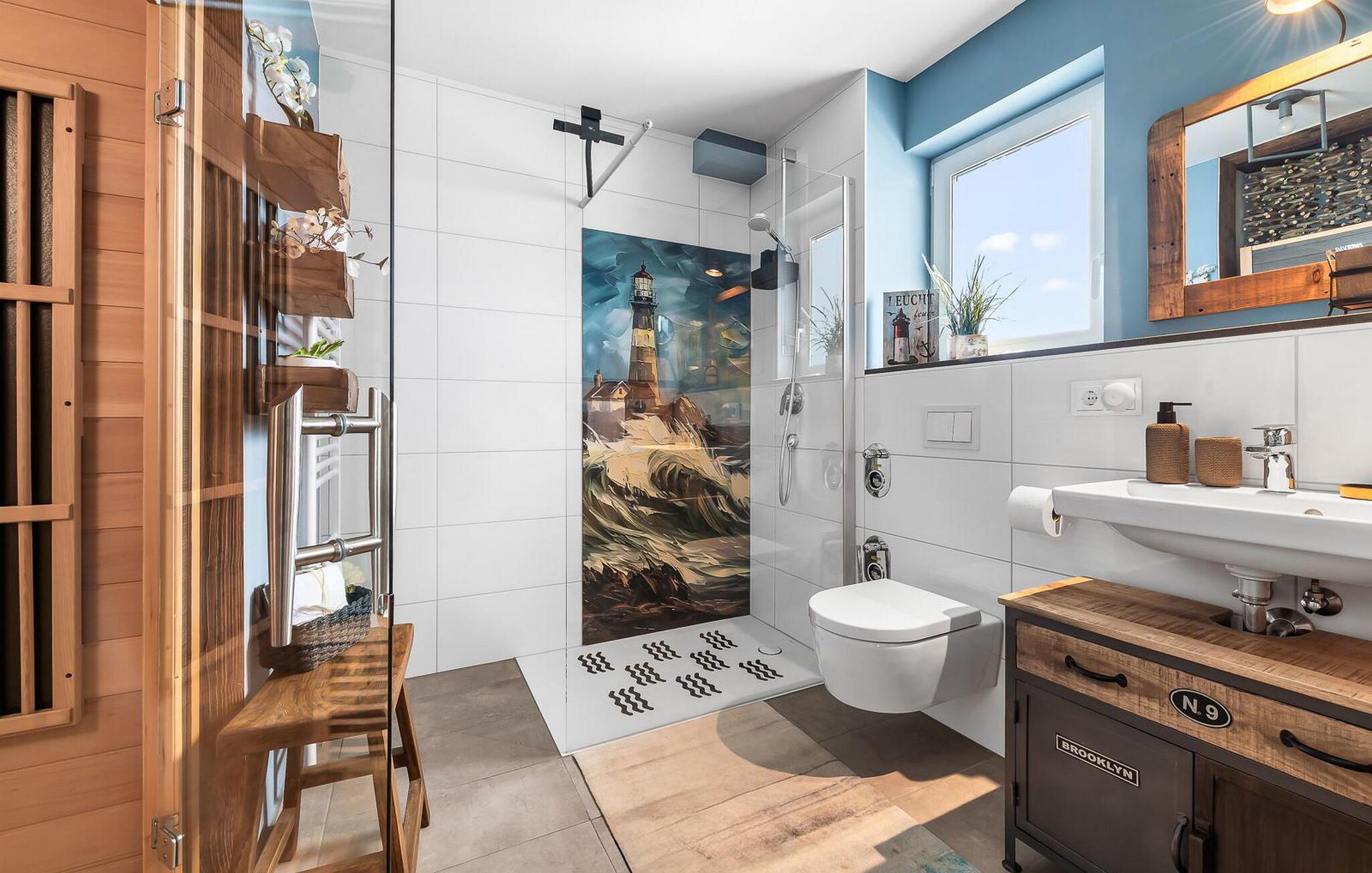 Ferier forsømmes heller ikke her. Den individuelle indretning og udstyr af høj kvalitet inviterer jer til at nyde hvert øjeblik af jeres ferie fuldt ud, uanset hvordan vejret er. På køligere dage kan I føle jer godt tilpas foran den knitrende pejs eller bruge den infrarøde sauna til hyggelig varme. Når solen skinner, venter den store altan på jer med udsigt til Schleiwiesen, hvor I kan nyde morgen- og middagssolen. Senere kan I slappe af i den hyggelige lounge på den anden altan eller have en grillaften sammen.