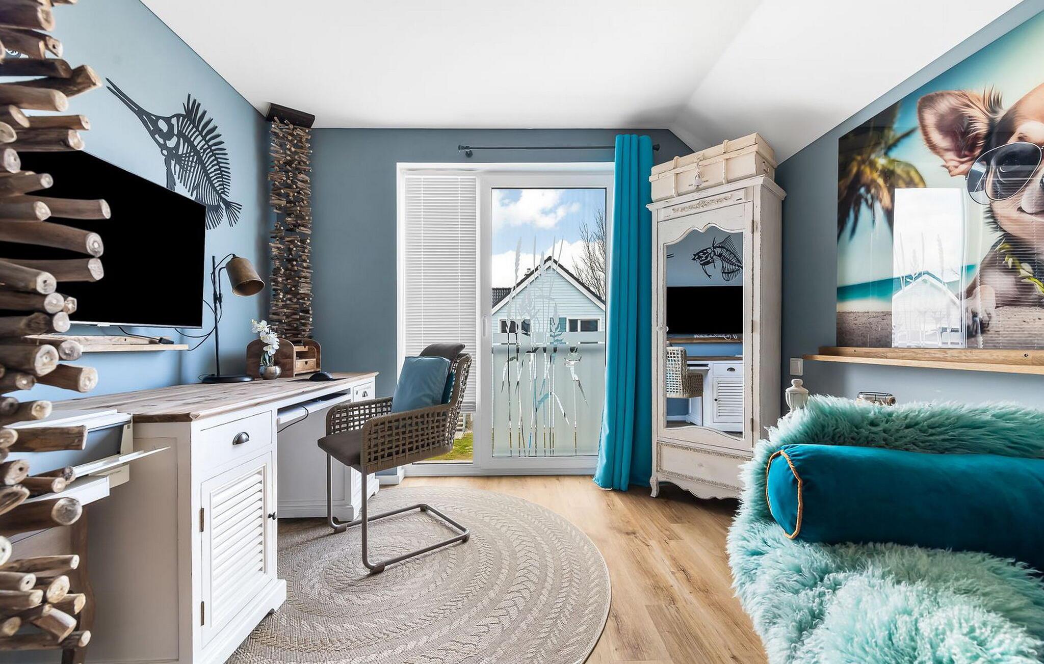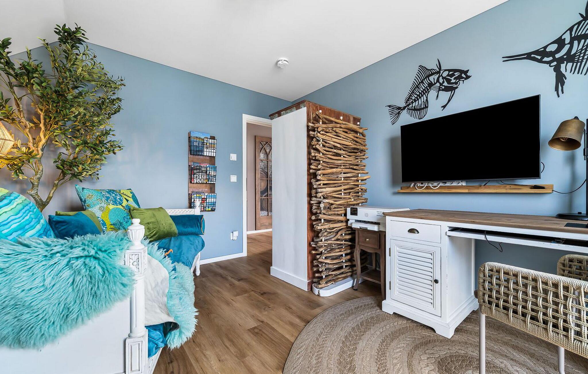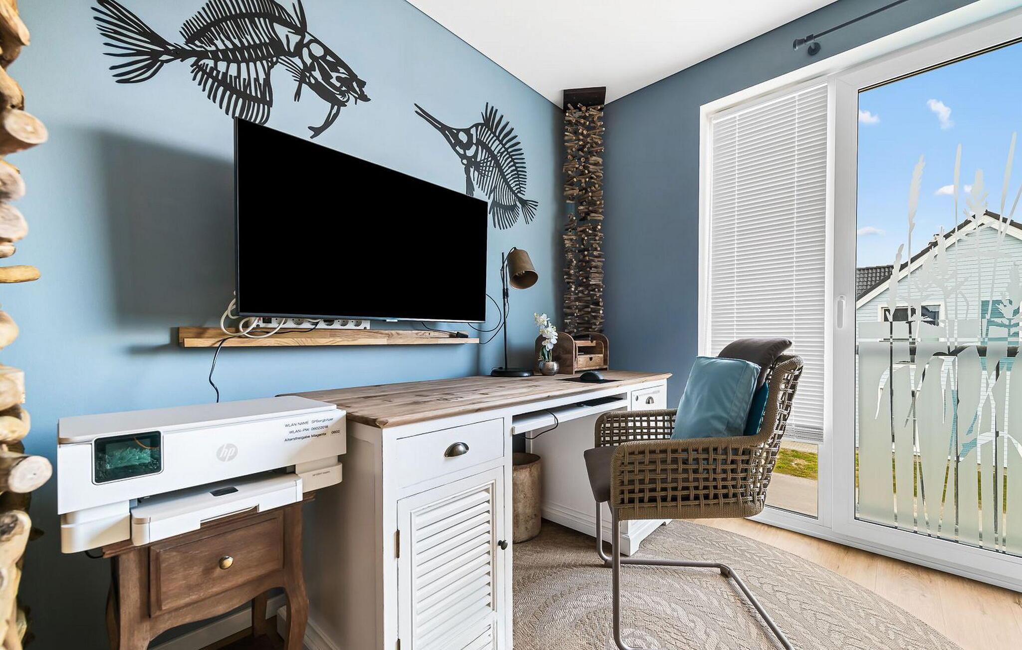 Nyd en workation her, den perfekte kombination af arbejde og ferie. Et rum venter på dig, hvor balancen i WORKLIFE er meget vigtig. Her finder I alt, hvad I behøver for at arbejde effektivt: et skrivebord med kontorudstyr, hurtig WiFi og en printer. Hvis I vil, kan tv'et blive en anden skærm til jeres bærbare computer. Det betyder, at I kan deltage i jeres møder fra jeres sofa.