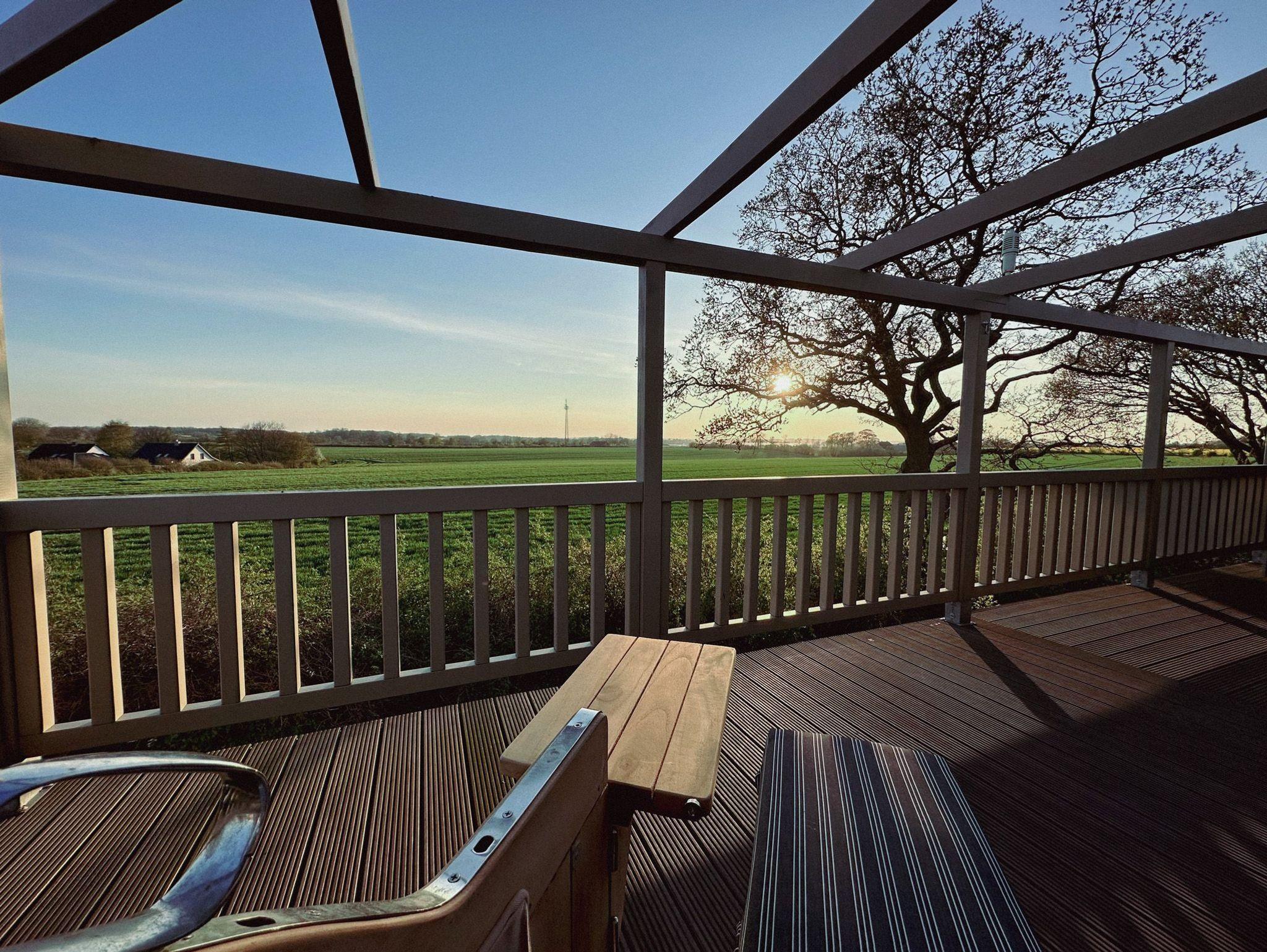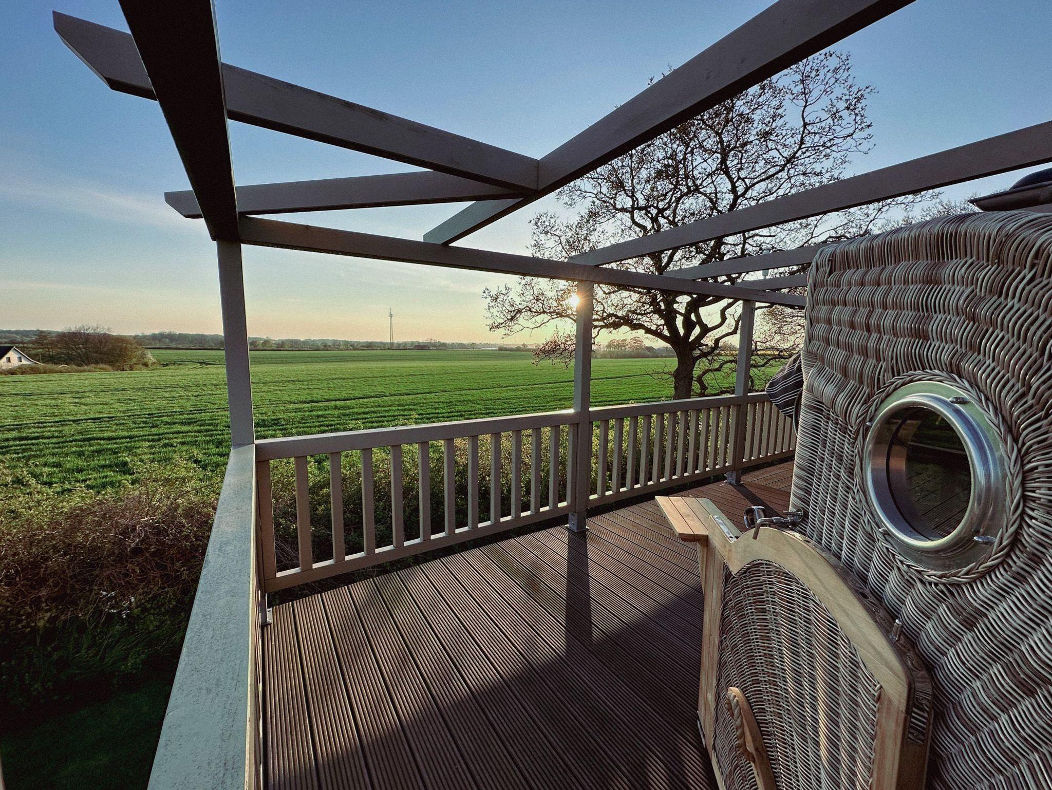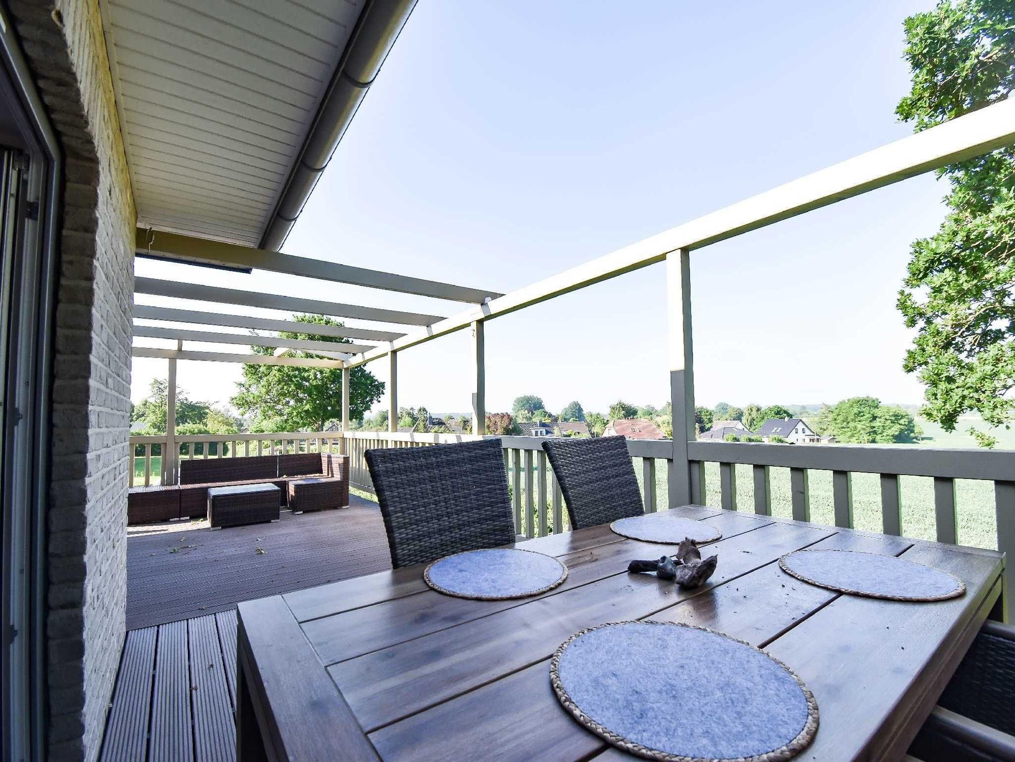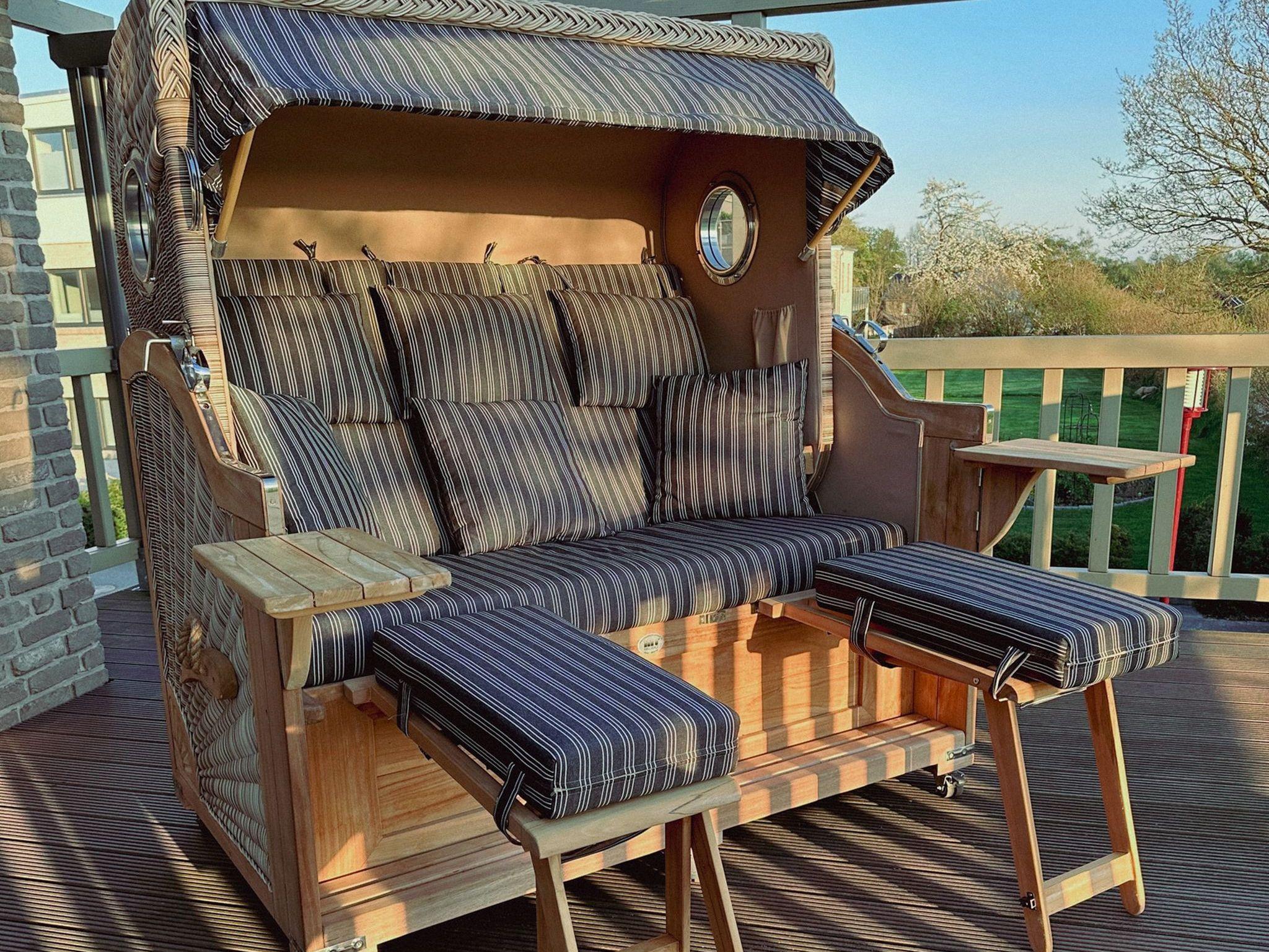 - große Terrasse mit Strandkorb, Essbereich, Loungemöbeln und Ausblick auf die Ostsee und den Yachthafen Wackerballig;