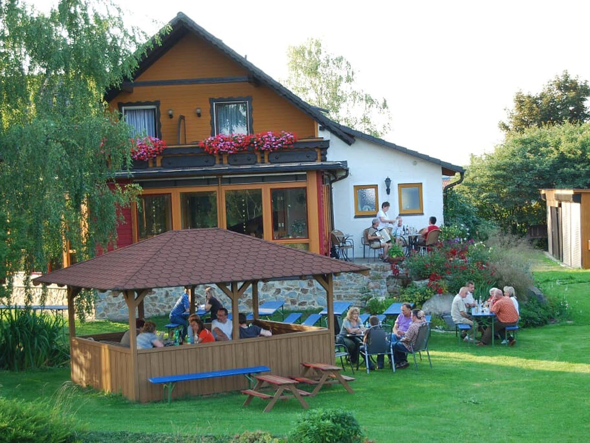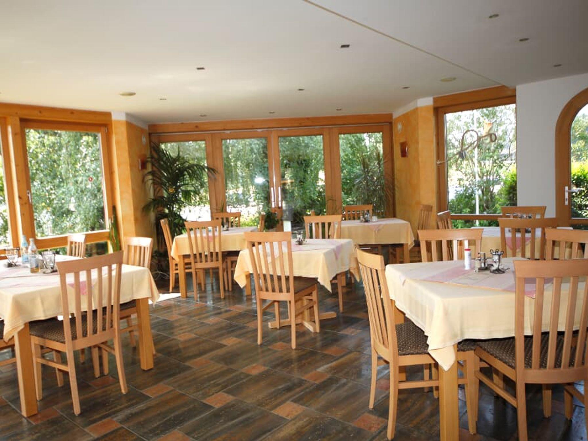 Im Haupthaus befinden sich der Ess- und Aufenthaltsbereich mit großem, hellem Wintergarten, in dem Sie Ihr Frühstück, Kaffee und Kuchen sowie Ihr Abendessen einnehmen.