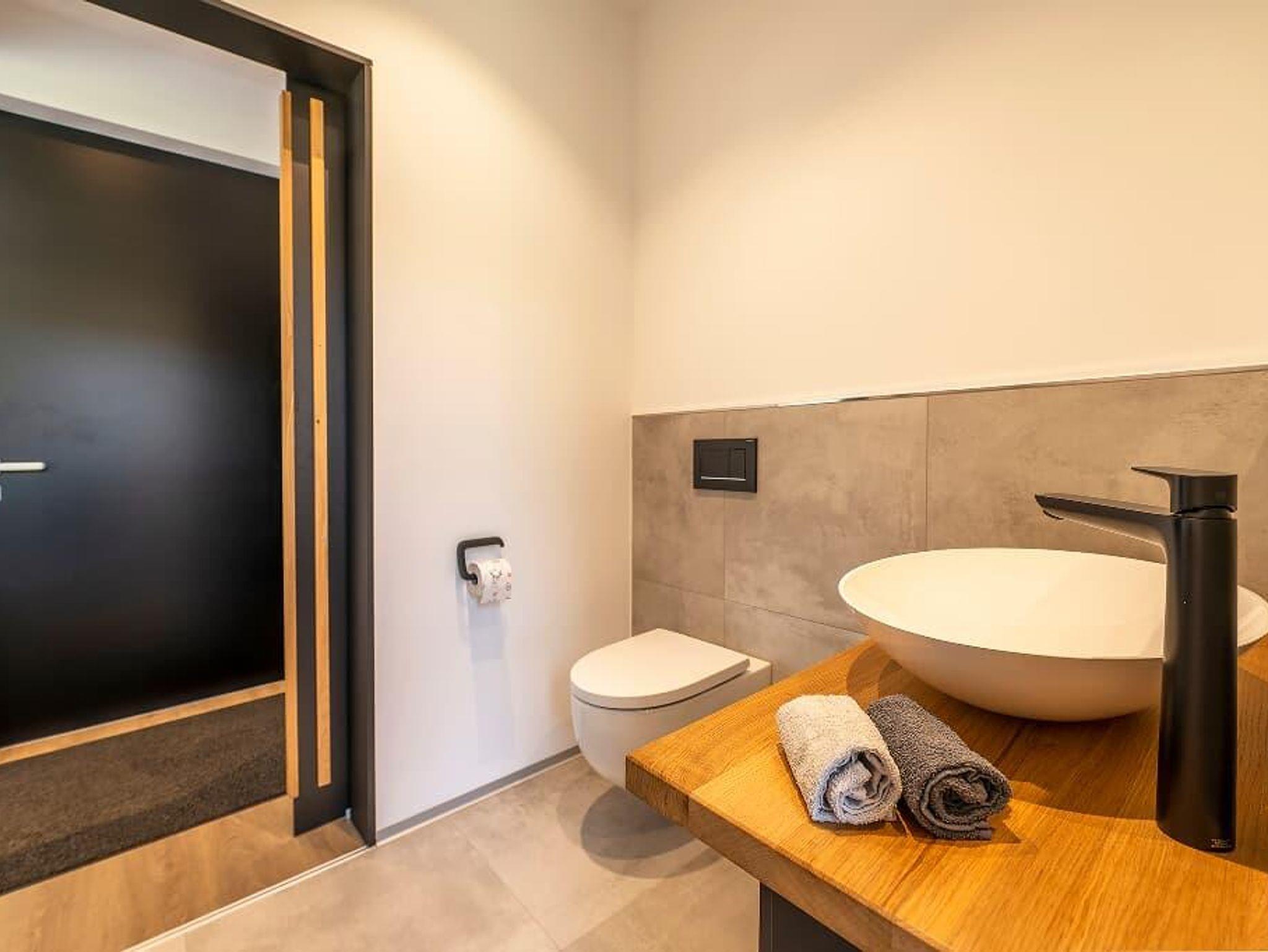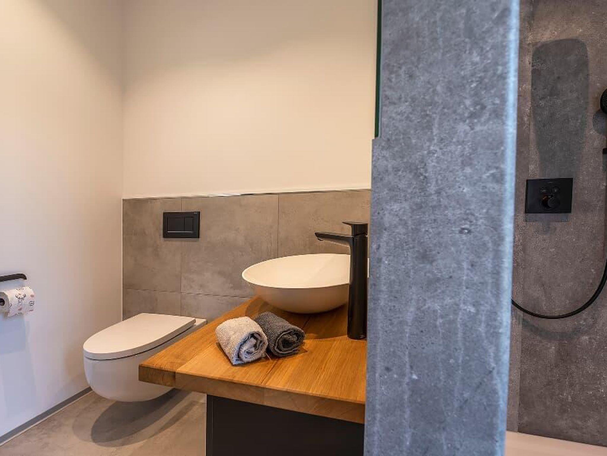 Bad mit großzügiger barrierefreier Dusche, Waschbecken und WC. 1 Satz Handtücher wird gestellt.