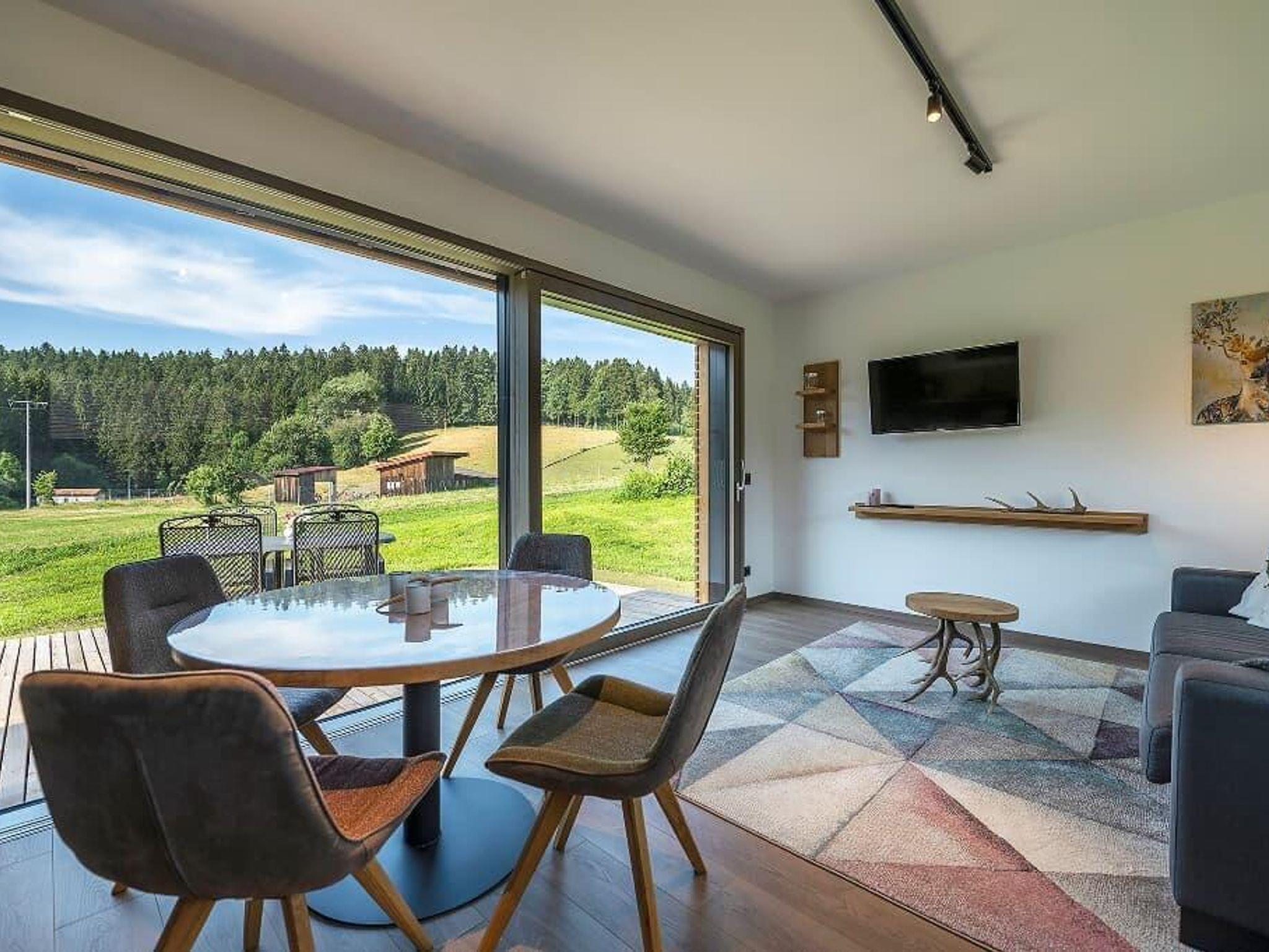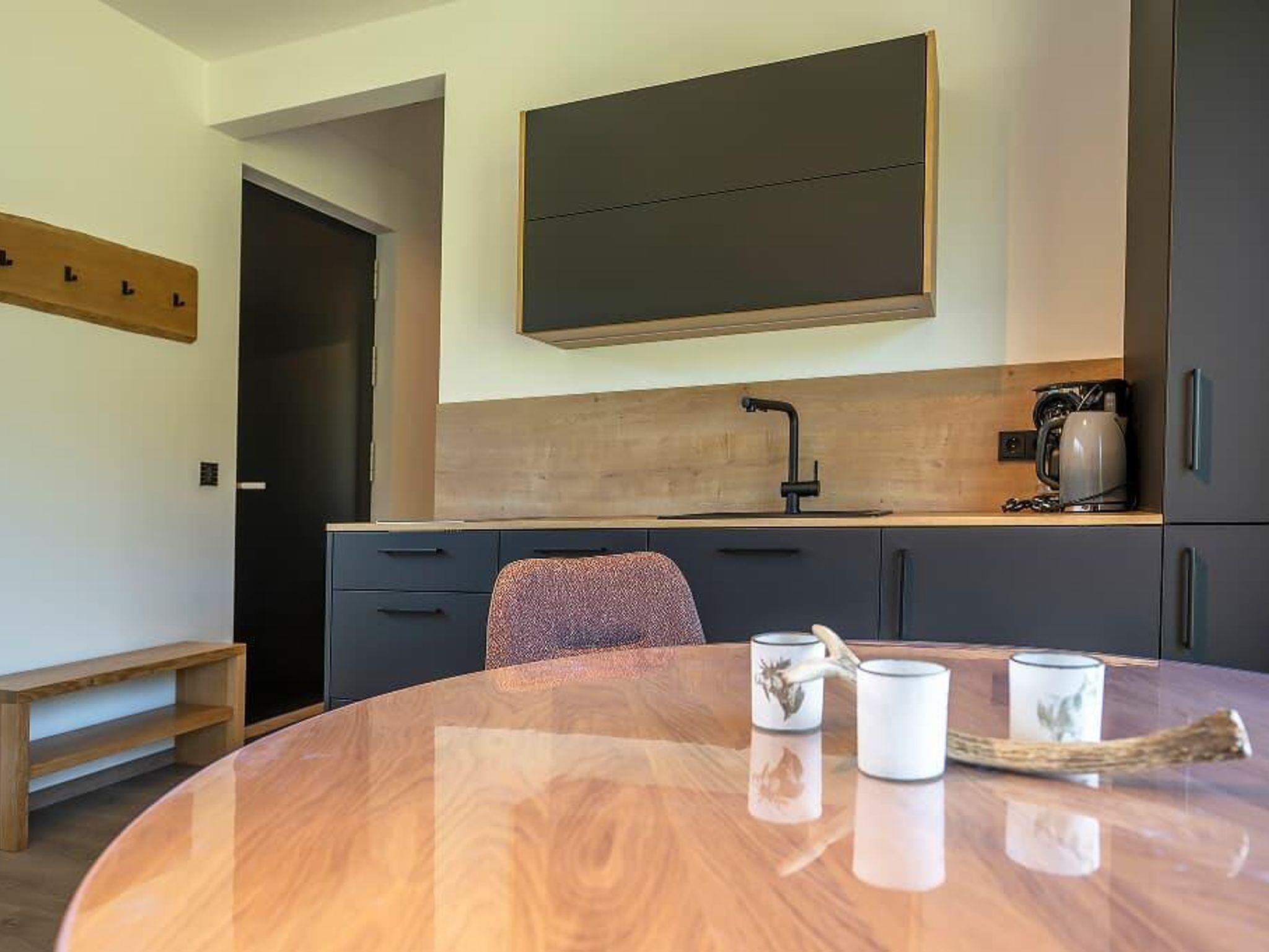 Großzügige Wohn-Ess-Küche mit großem Esstisch für 4 Personen, Zugang zur Terrasse mit Blick auf unser Hirschgehege. Kühlschrank, Spülmaschine, Ceranfeld mit 2 Kochstellen, Filterkaffeemaschine, Wasserkocher, Toaster und reichhaltiges Geschirr. Geschirrtücher werden gestellt.