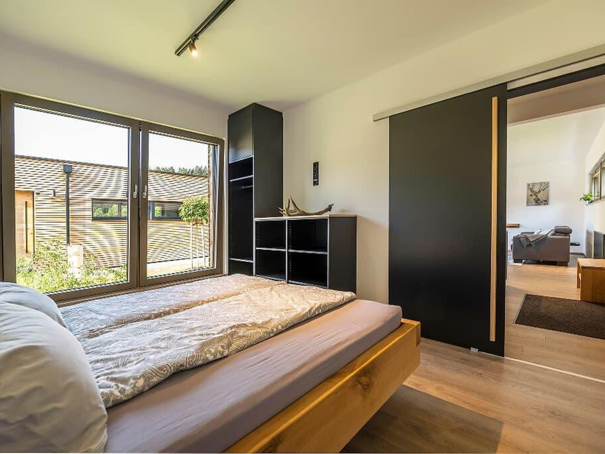 1 großes, helles Schlafzimmer mit einem Doppelbett und großzügigem Schrank. Schlafcouch für weitere 2 Personen im Wohnbereich. Bettwäsche wird gestellt. Auf Anfrage stellen wir auch ein Babyreisebett.