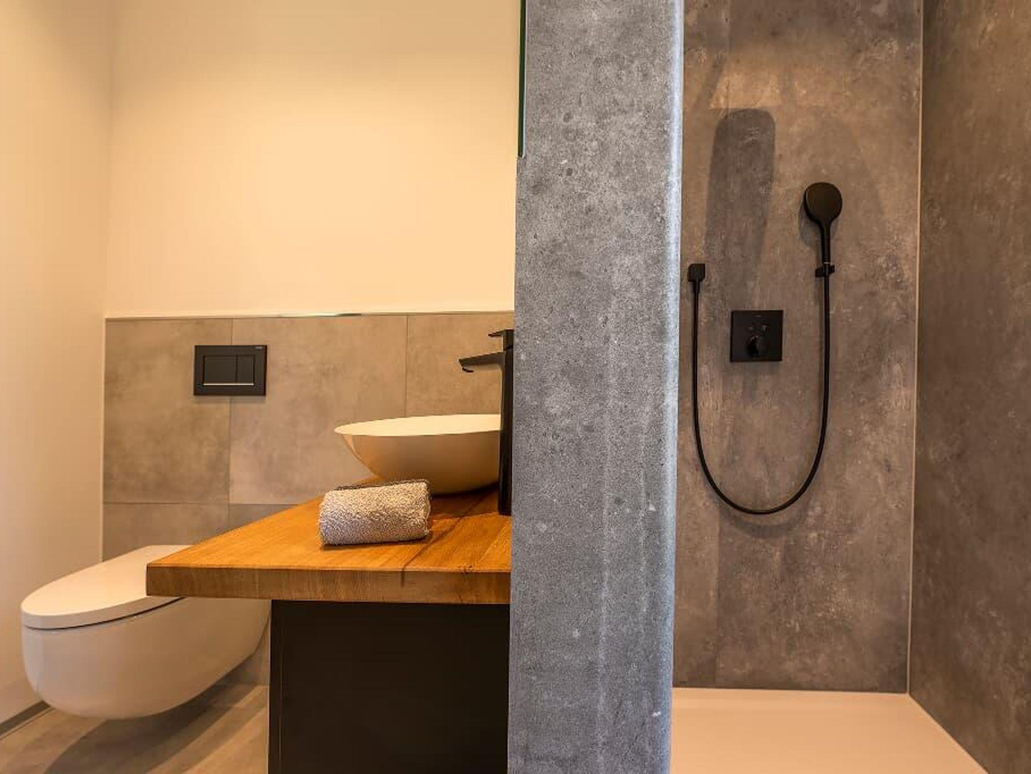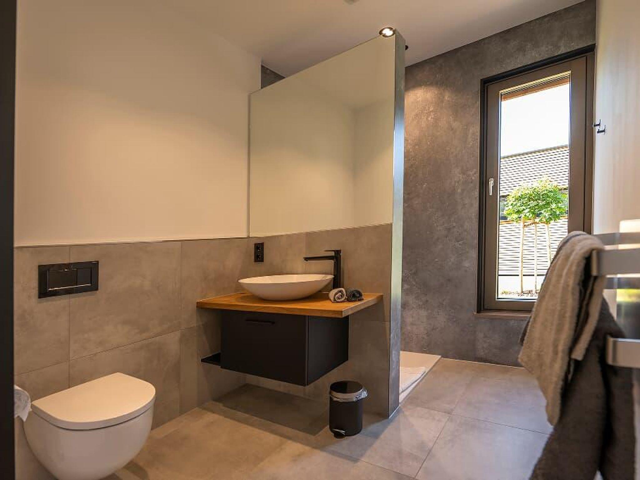 Bad mit großzügiger barrierefreier Dusche, Waschbecken und WC. 1 Satz Handtücher wird gestellt.