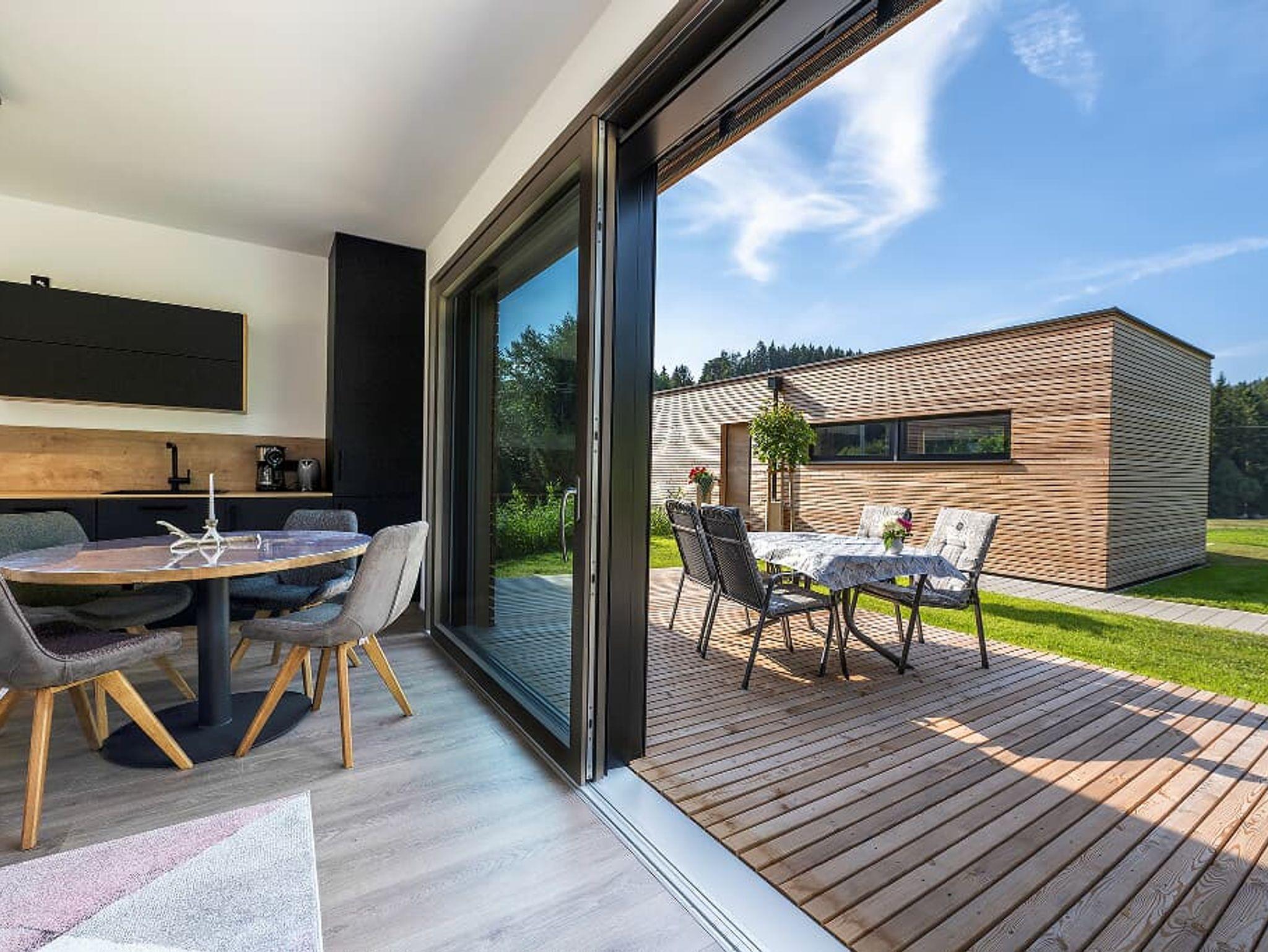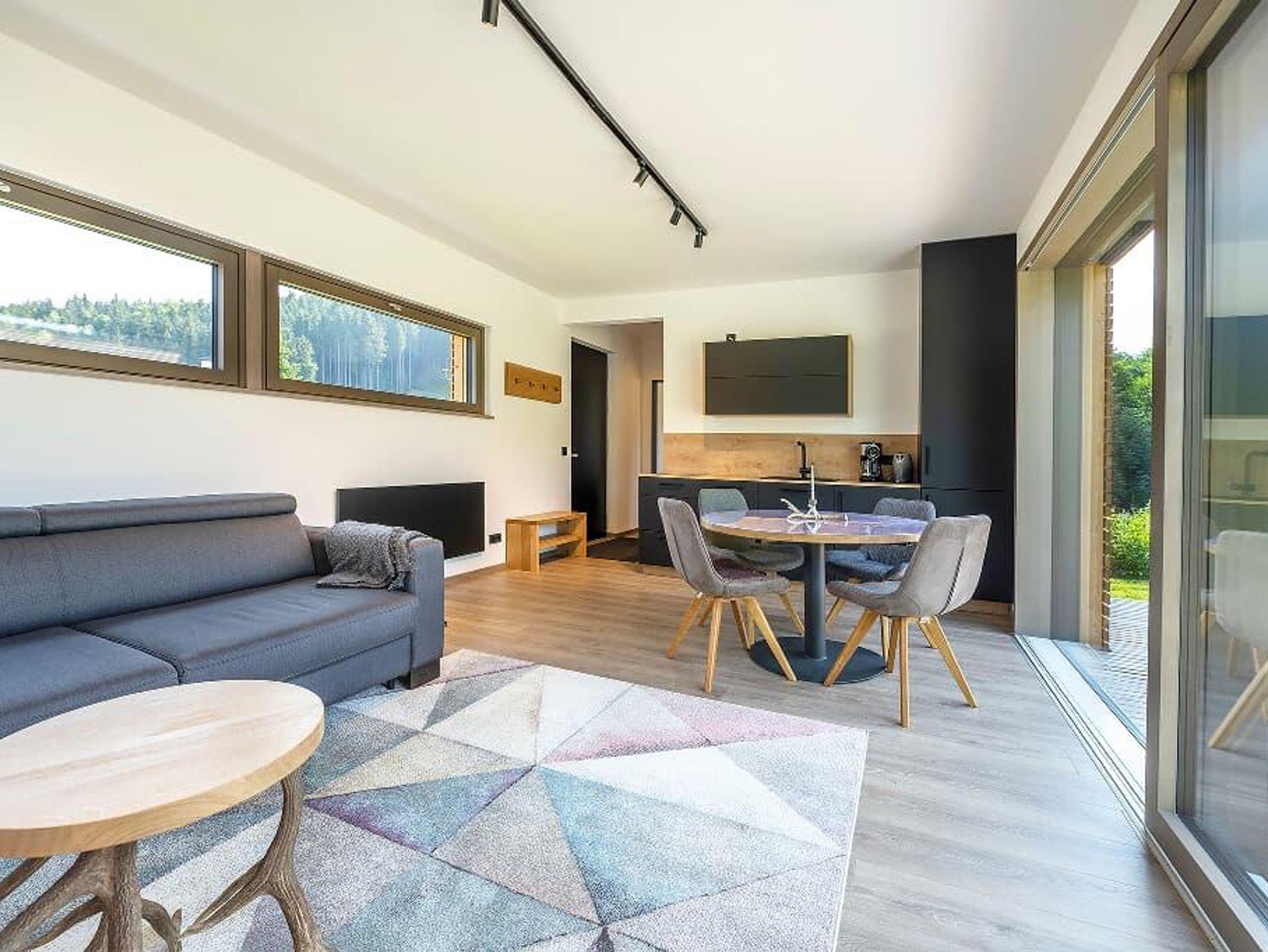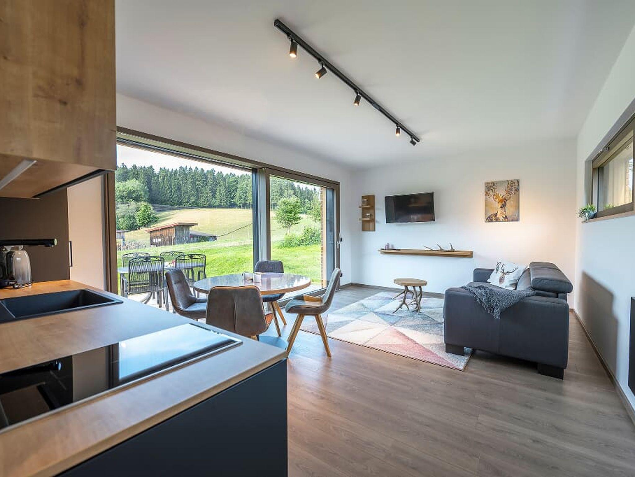 Großzügige Wohn-Ess-Küche mit großem Esstisch für 4 Personen, Zugang zur Terrasse mit Blick auf unser Hirschgehege. Kühlschrank, Spülmaschine, Ceranfeld mit 2 Kochstellen, Filterkaffeemaschine, Wasserkocher, Toaster und reichhaltiges Geschirr. Geschirrtücher werden gestellt.