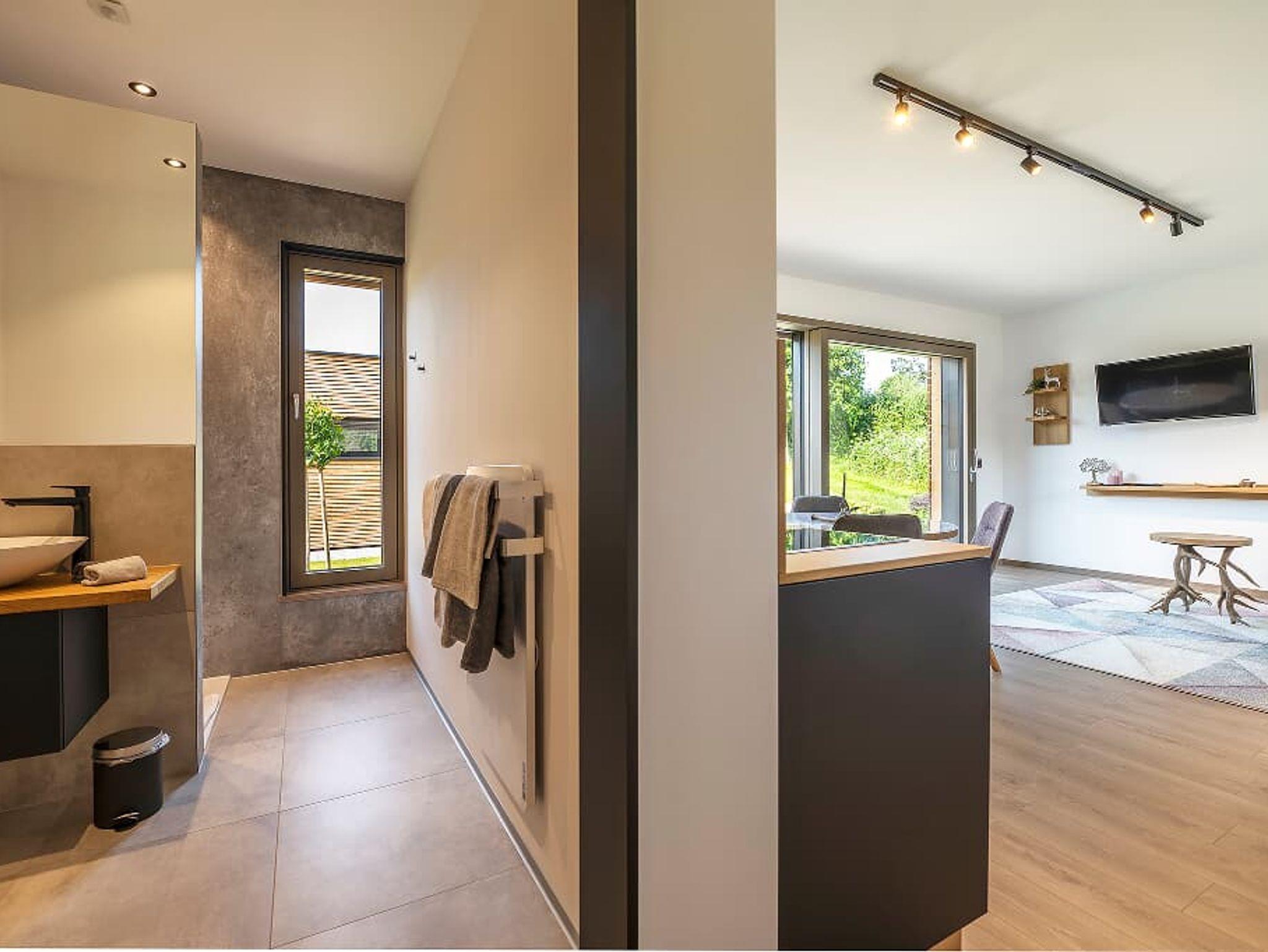 DIe Ferienwohnung verfügt über 1 großes, helles Schlafzimmer mit einem Doppelbett und großzügigem Schrank. Schlafcouch für weitere 2 Personen im Wohnbereich. Bettwäsche wird gestellt. Auf Anfrage stellen wir auch ein Babyreisebett. Großzügige Wohn-Ess-Küche mit großem Esstisch für 4 Personen, Kochfeld mit zwei Kochplatten, Zugang zur Terrasse mit Blick auf unser Hirschgehege. Kühlschrank, Spülmaschine, Ceranfeld mit 2 Kochstellen, Filterkaffeemaschine, Wasserkocher, Toaster und reichhaltiges Geschirr. Geschirrtücher werden gestellt. Terrasse ca. 18 qm zum Relaxen. Gartentisch und Stühle sind vorhanden. Bad mit großzügiger barrierefreier Dusche, Waschbecken und WC. 1 Satz Handtücher wird gestellt.