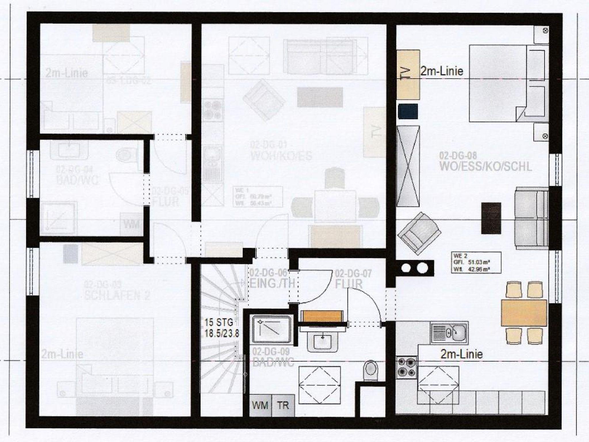 Dieses Appartment befindet sich im ersten Stock und eignet sich mit seinen rund 43 qm für 1-2 Personen.