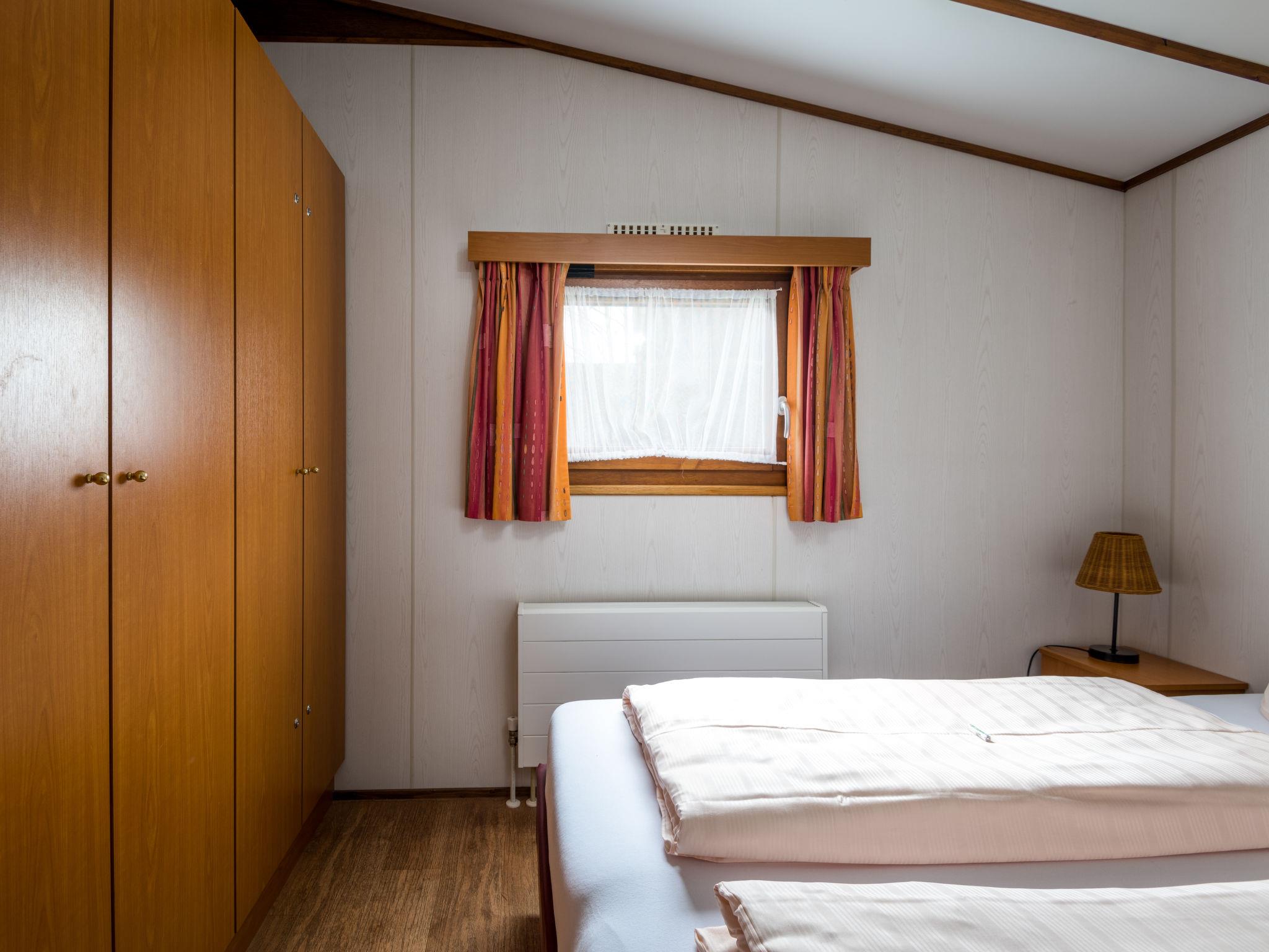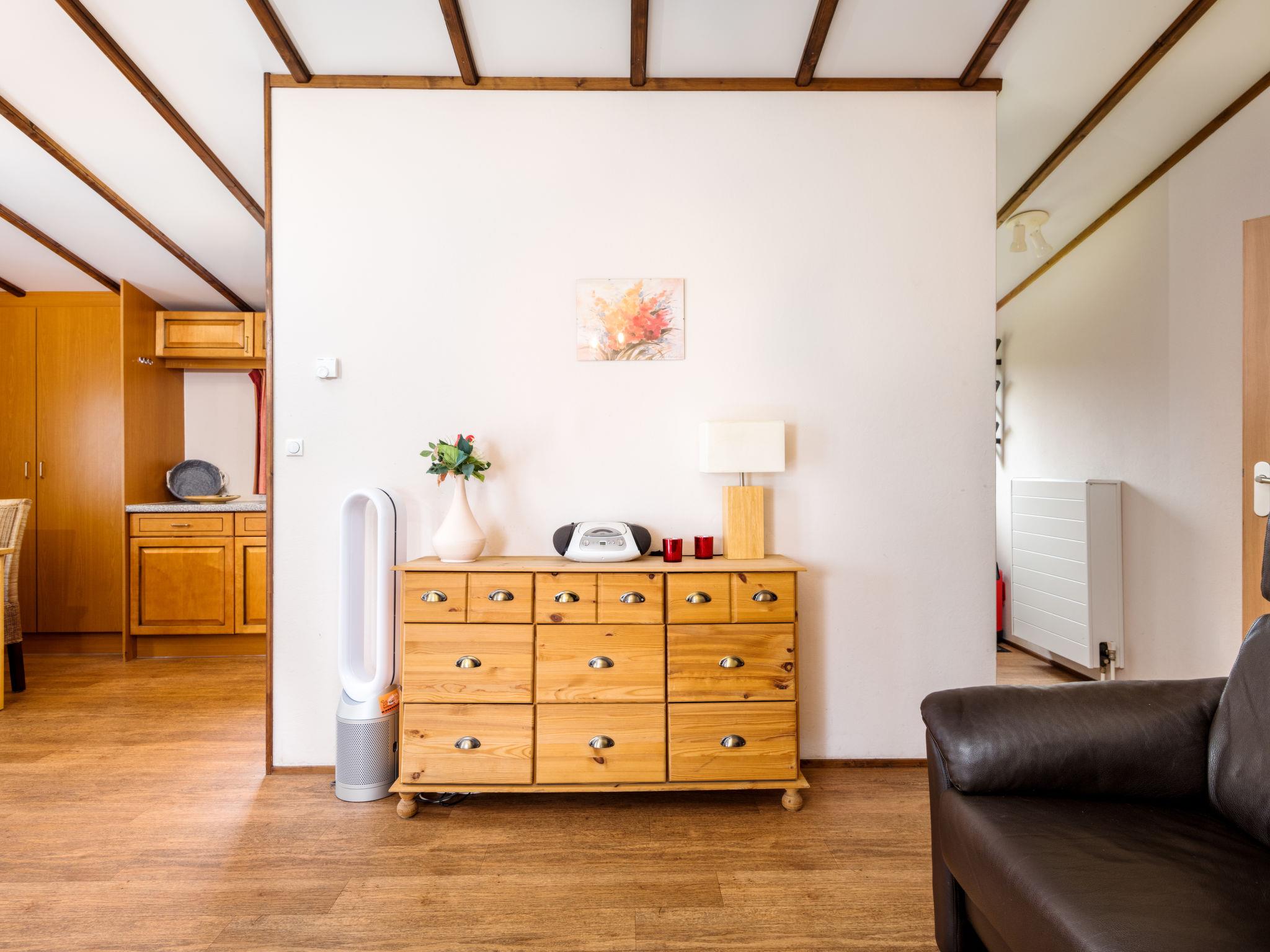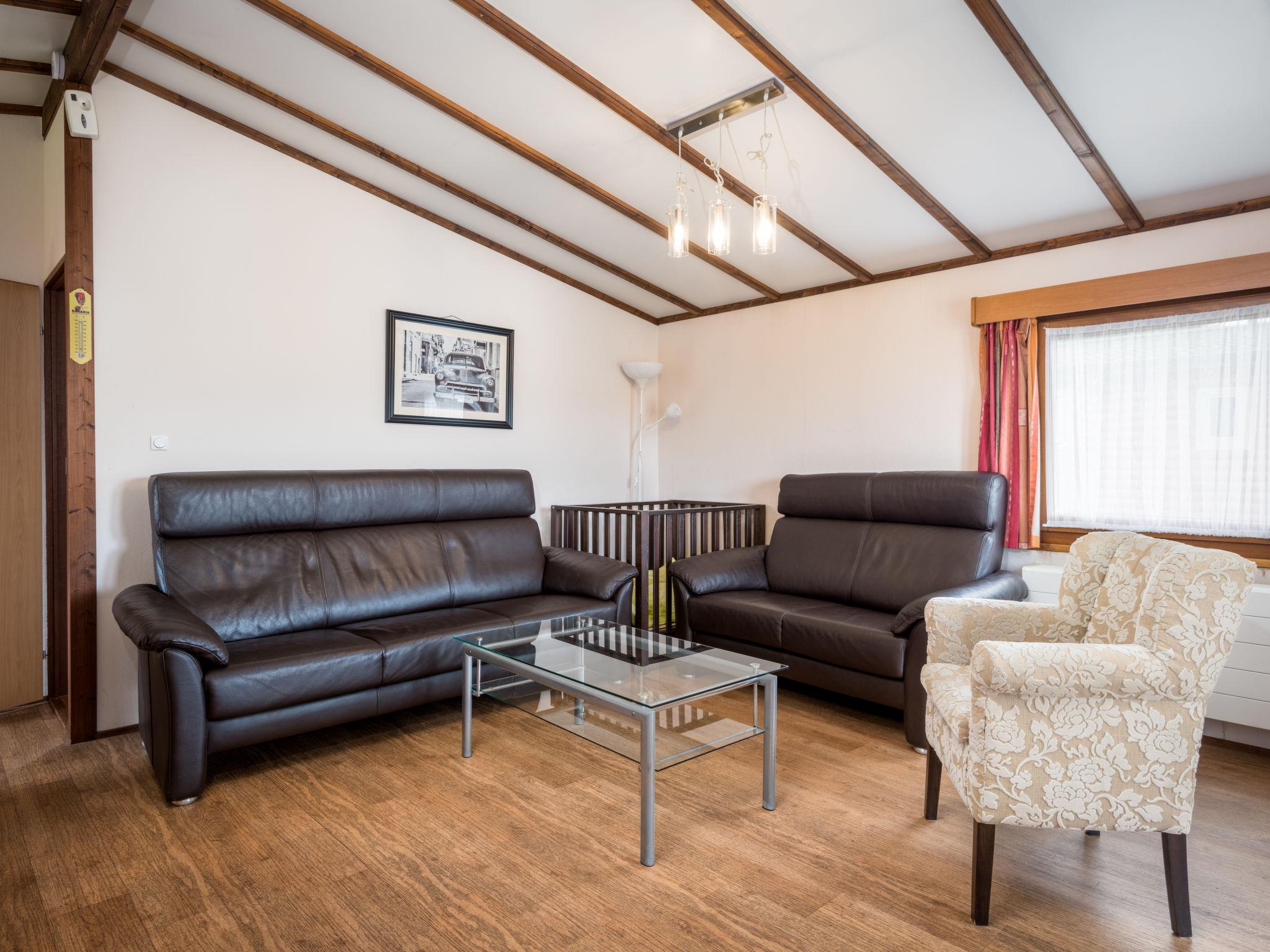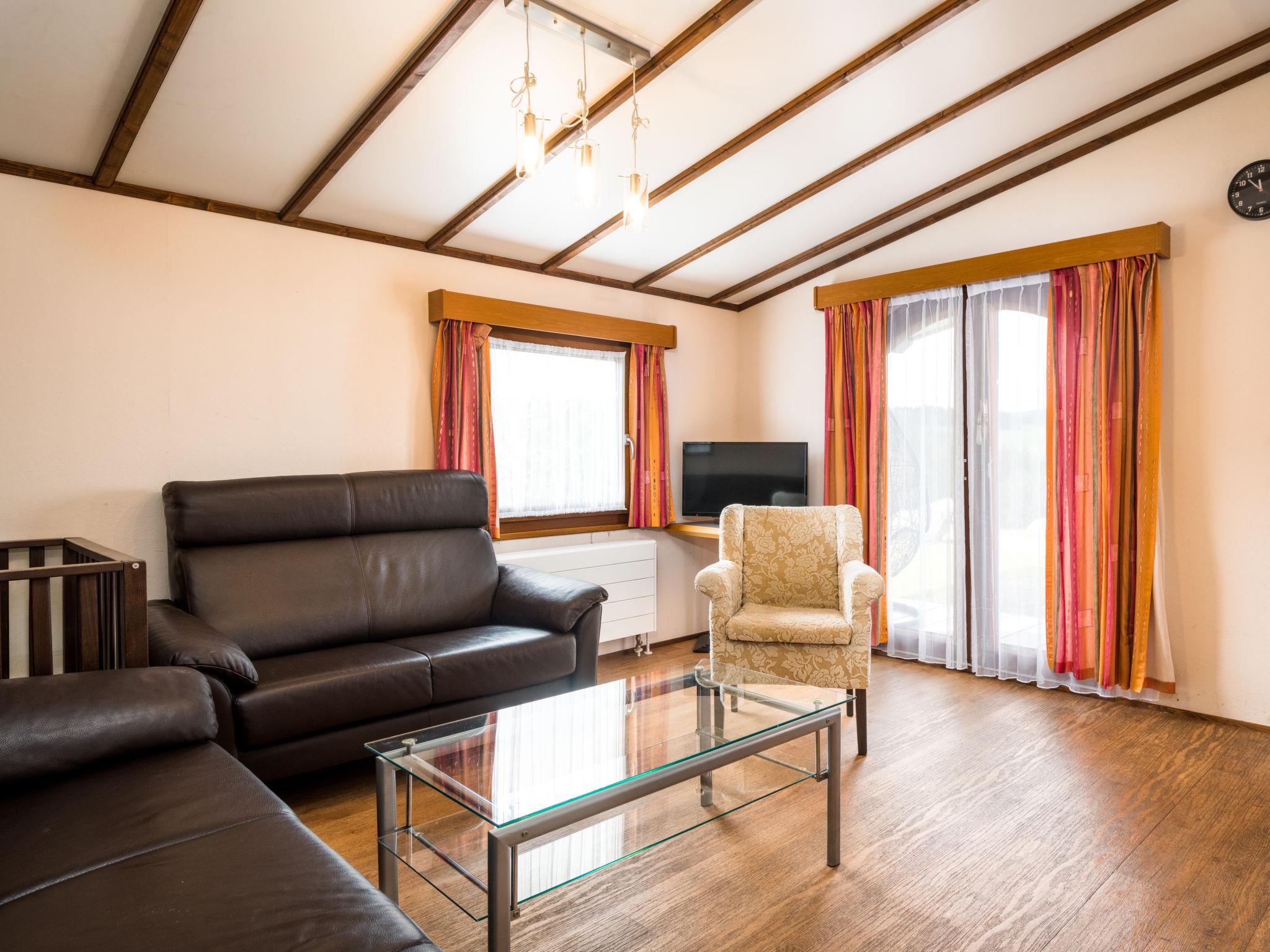 "Holzchalet A-D", 3-room bungalow 55 m2. Rustic and cosy furnishings: living/dining room 32 m2 with satellite TV (flat screen). Exit to the terrace. 1 room 6 m2 with 1 double bed (160 cm, length 190 cm). 1 room 6 m2 with 2 beds (80 cm, length 190 cm). Kitchenette (4 hot plates, dishwasher, kettle, microwave, electric coffee machine). Shower, sep. WC. Gas heating. Terrace 15 m2 partly roofed. Terrace furniture. Marvellous panoramic view of the mountains and the countryside. Facilities: baby cot (extra). Please note: non-smoking house. Maximum 2 pets/ dogs allowed. Smoke alarm, fire extinguisher. Four bungalows in wood construction. The pictures are only sample photos.