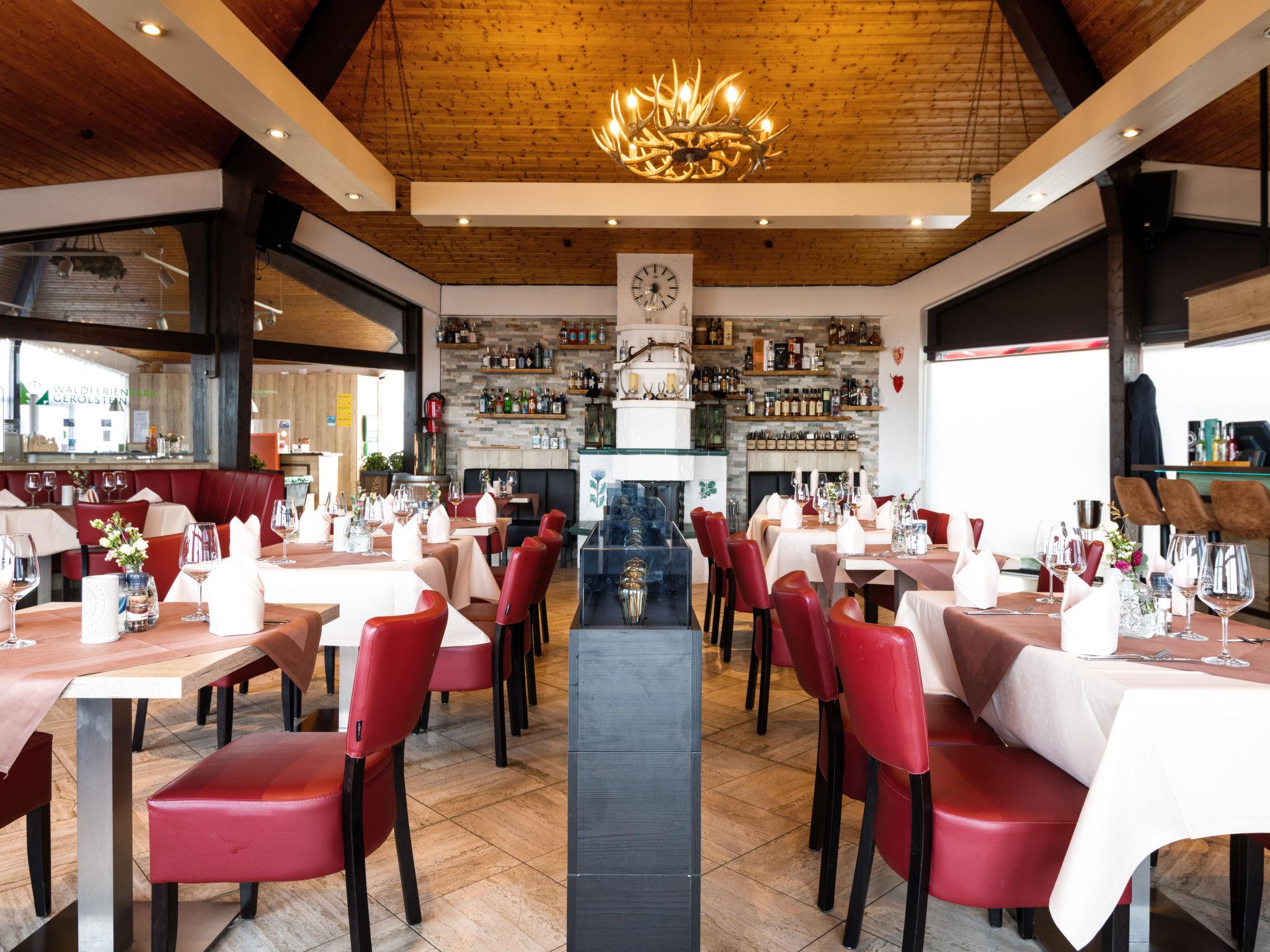 Resort "Waldferienpark Gerolstein". Outside the resort, 3 km from the centre of Gerolstein, in a secluded, quiet position on top of a hill, 100 m from the edge of the forest, 24 km from the lake, 100 m from the stream, in the countryside. For shared use: indoor pool heated (70 m2, depth 130 cm) with internal staircase. Shower/WC in the pool area, children's playground (slide, swing, sandbox), petting farm. Private: garden with lawn. In the complex: restaurant, bar, breakfast room, lounge, billiard table, trampoline, sun terrace. Bread roll service possible (extra). Stepped path to the house. Parking on the premises. Shop 3 km, grocery 2.5 km, supermarket 2.5 km, shopping centre 3 km, bicycle rental 6 km, bus stop "Gerolstein" 3 km, railway station "Gerolstein" 3 km, outdoor swimming pool 3 km, bathing lake 3.2 km. Golf course (18 hole) 18 km, tennis 3 km, minigolf 50 m, riding stable 4 km, walking paths from the house 50 m. Nearby attractions: Kylltal, Burg Eltz. Well-known lakes can easily be reached: Pulvermaar 24 km. Please note: car recommended. The forest holiday park also has air hockey and outdoor chess. Facilities for shared use (some extra). Wood for the fireplace in the properties can be purchased at reception for an additional charge.