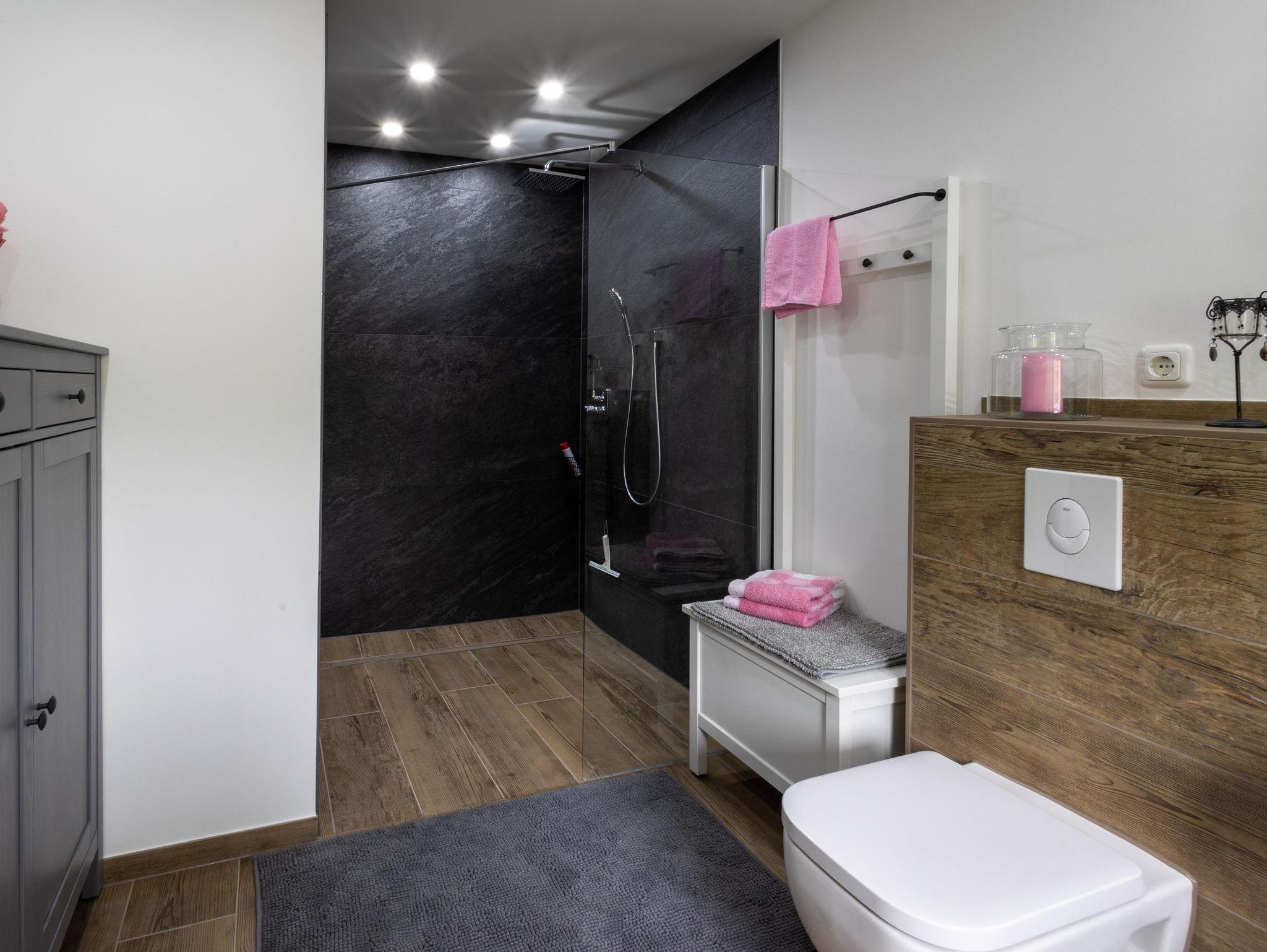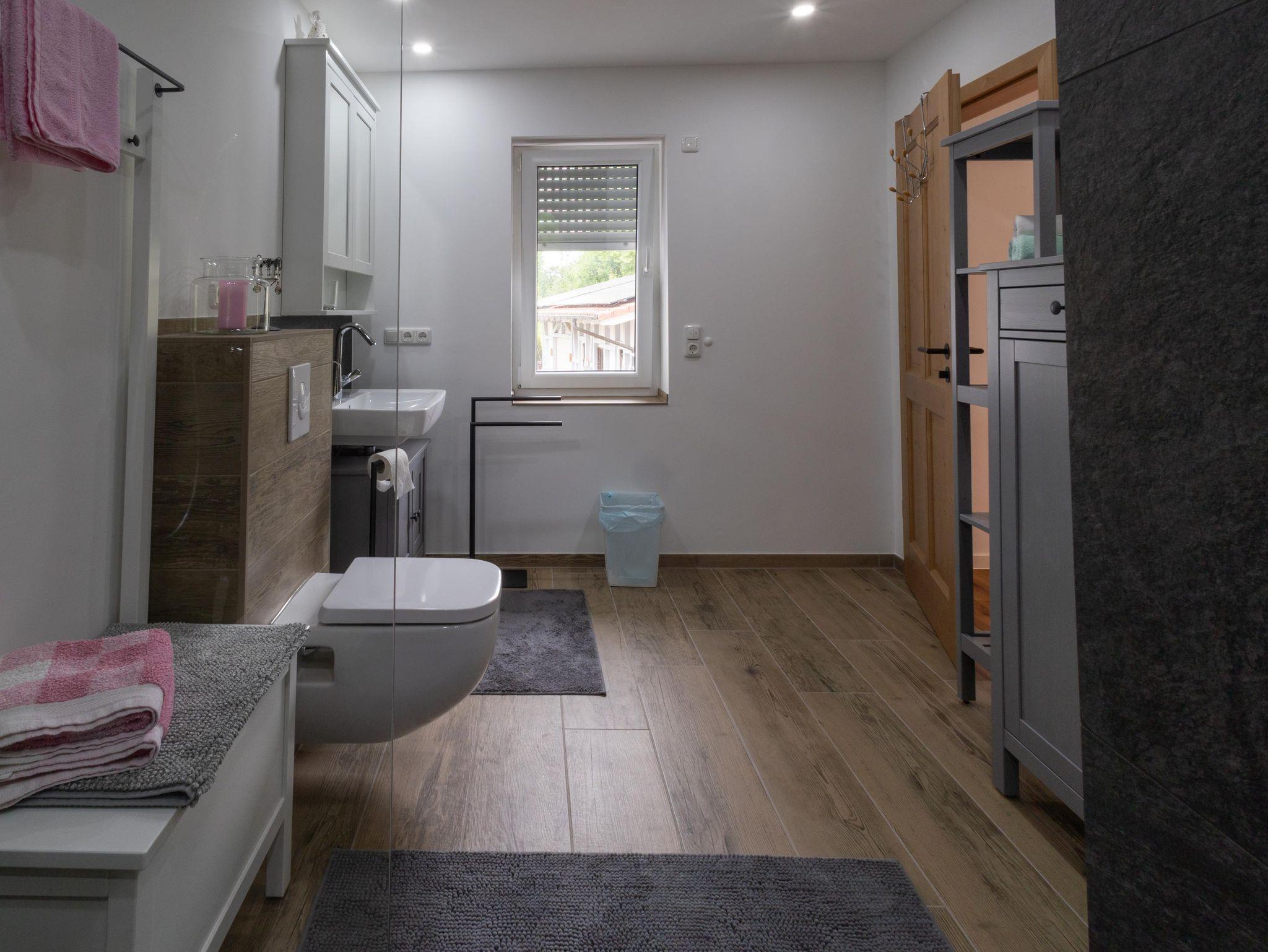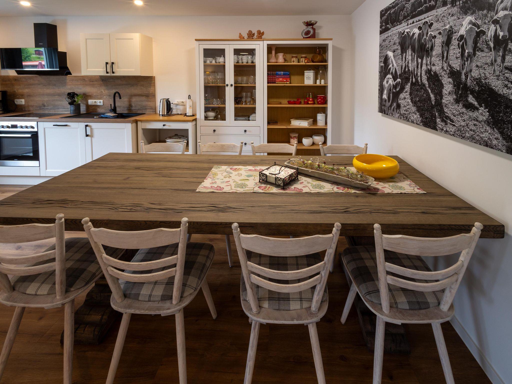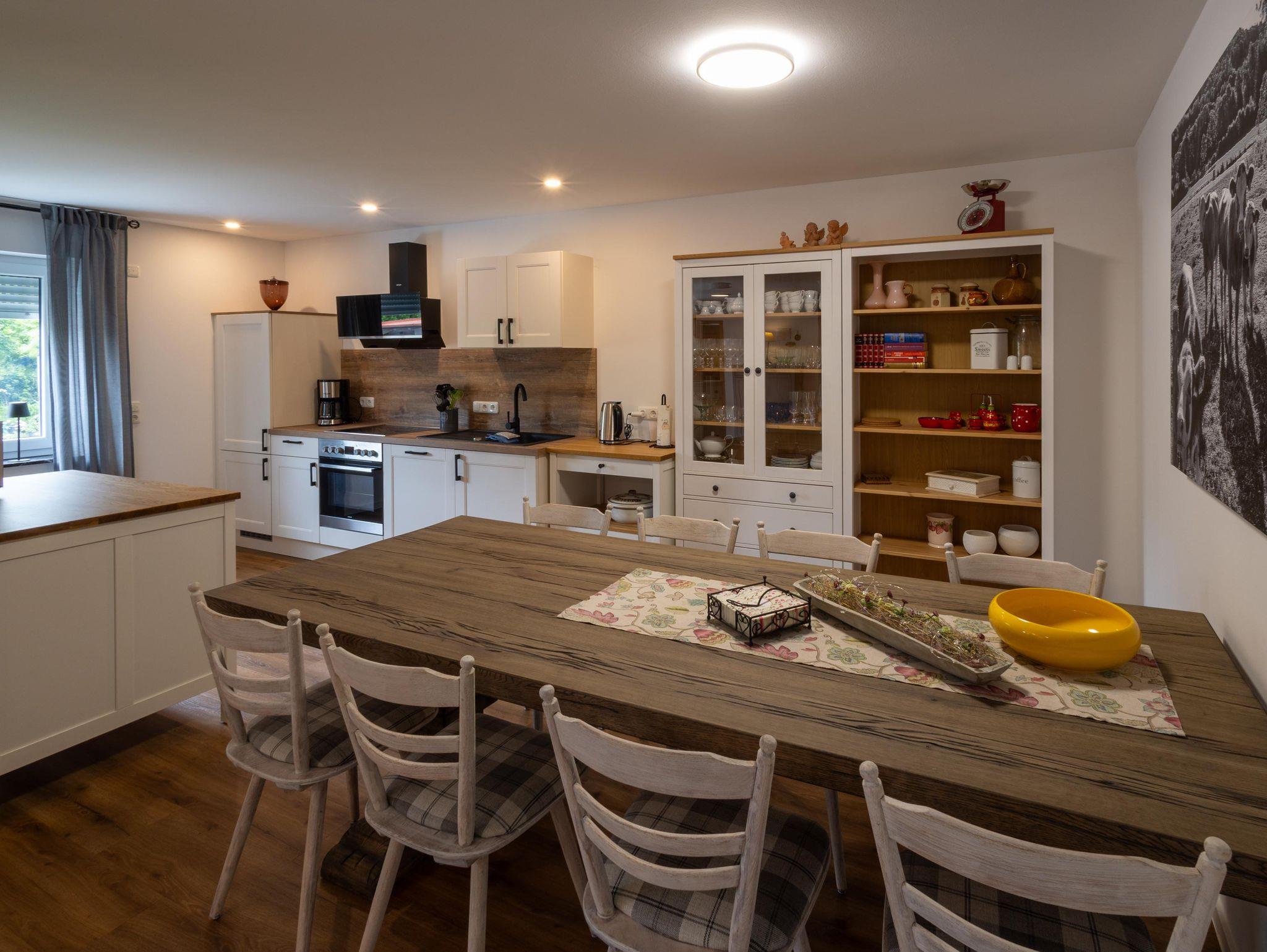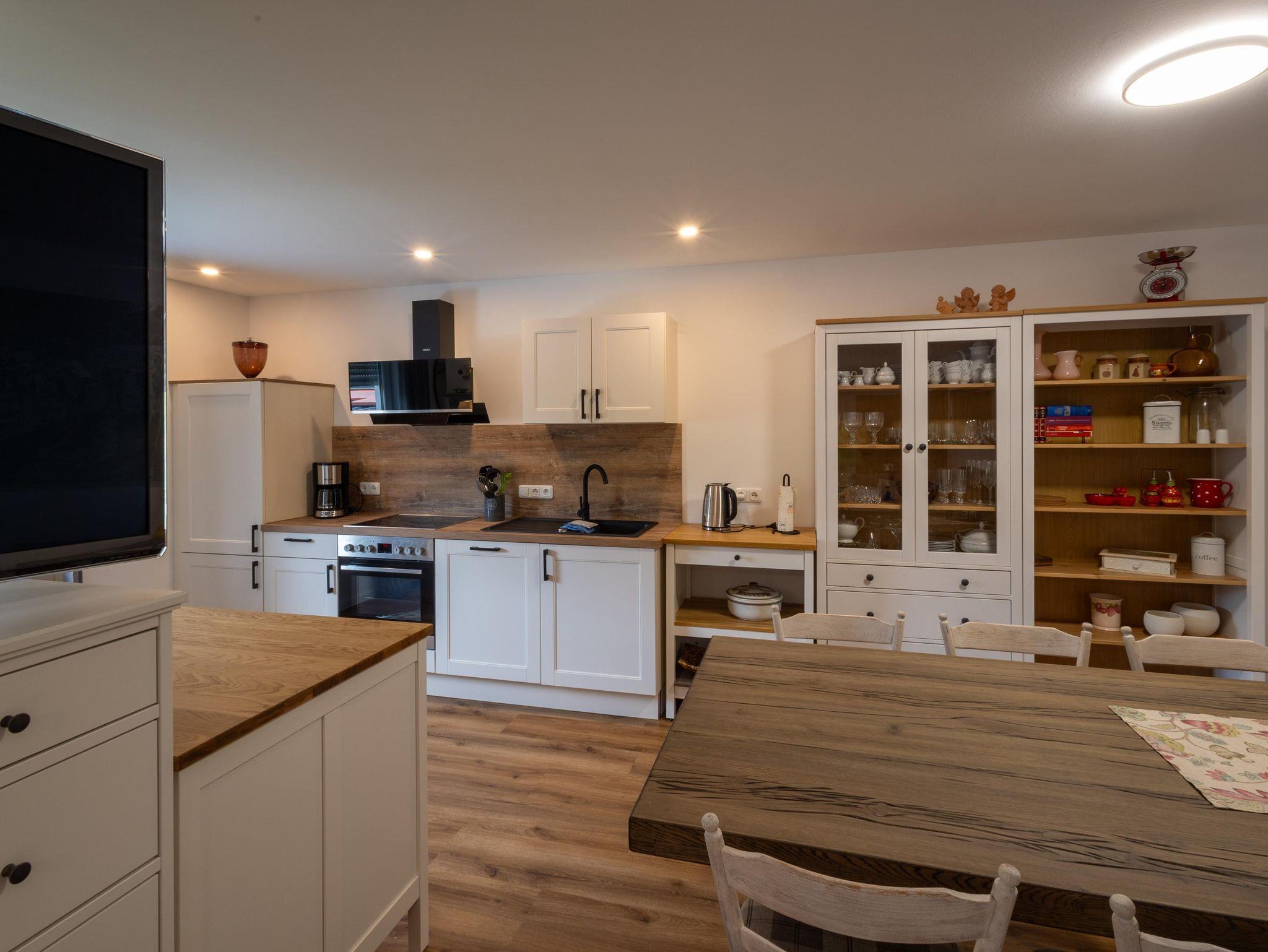 Der große Wohn- und Essbereich lädt zum Verweilen ein – mit gemütlicher Couch, Fernseher und einem großzügigen Esstisch. Die voll ausgestattete Küche verfügt unter anderem über eine Kaffeemaschine, einen Herd und einen Toaster – ideal für gemeinsame Mahlzeiten und einen gelungenen Start in den Tag. Das geräumige Badezimmer ist mit einer ebenerdigen Dusche ausgestattet. WLAN steht kostenfrei zur Verfügung.