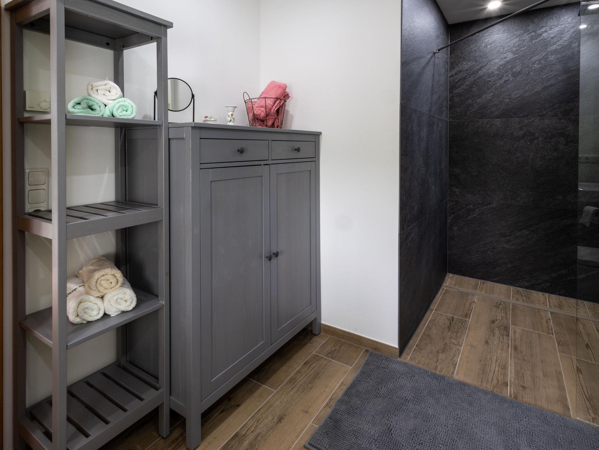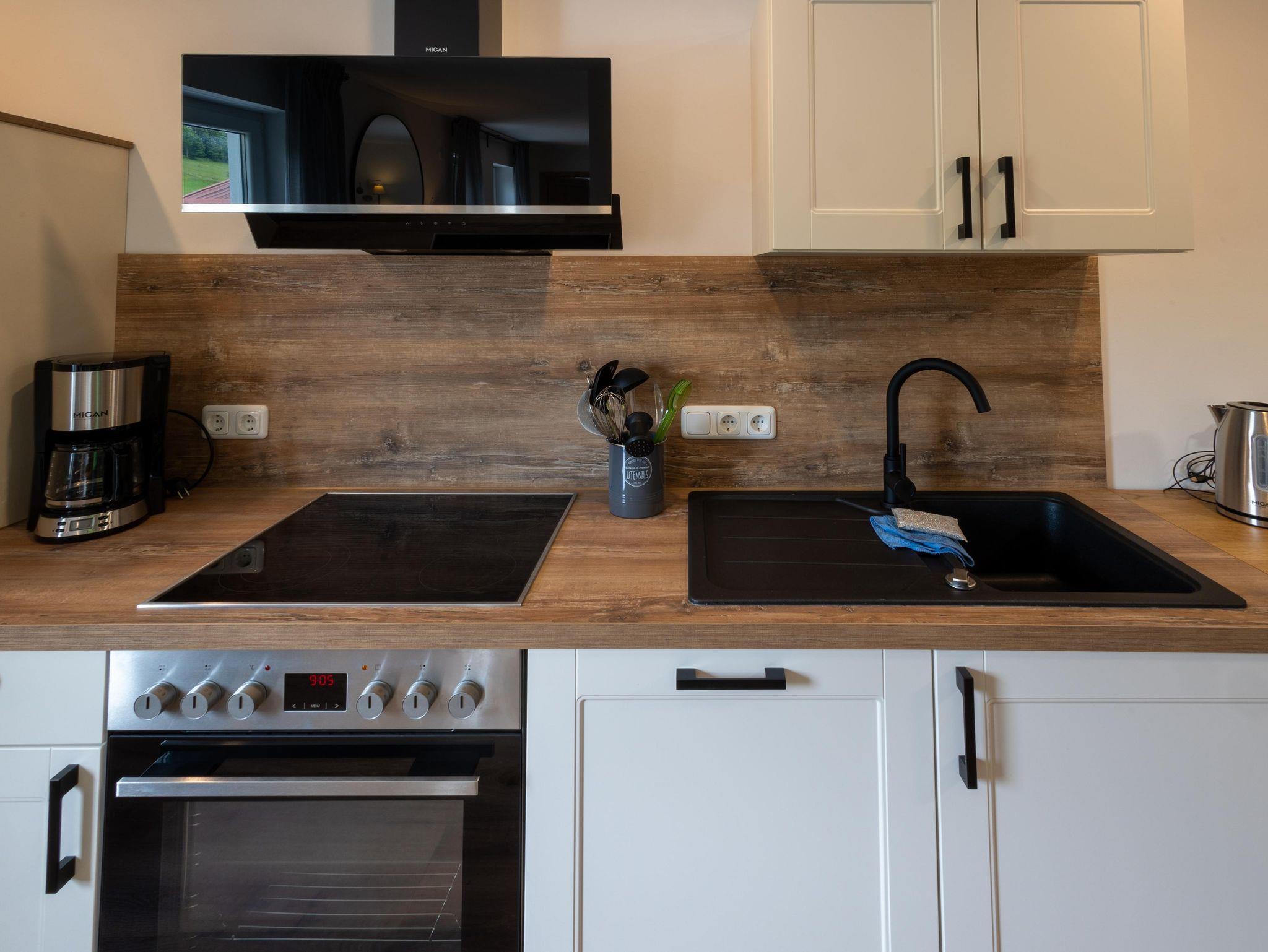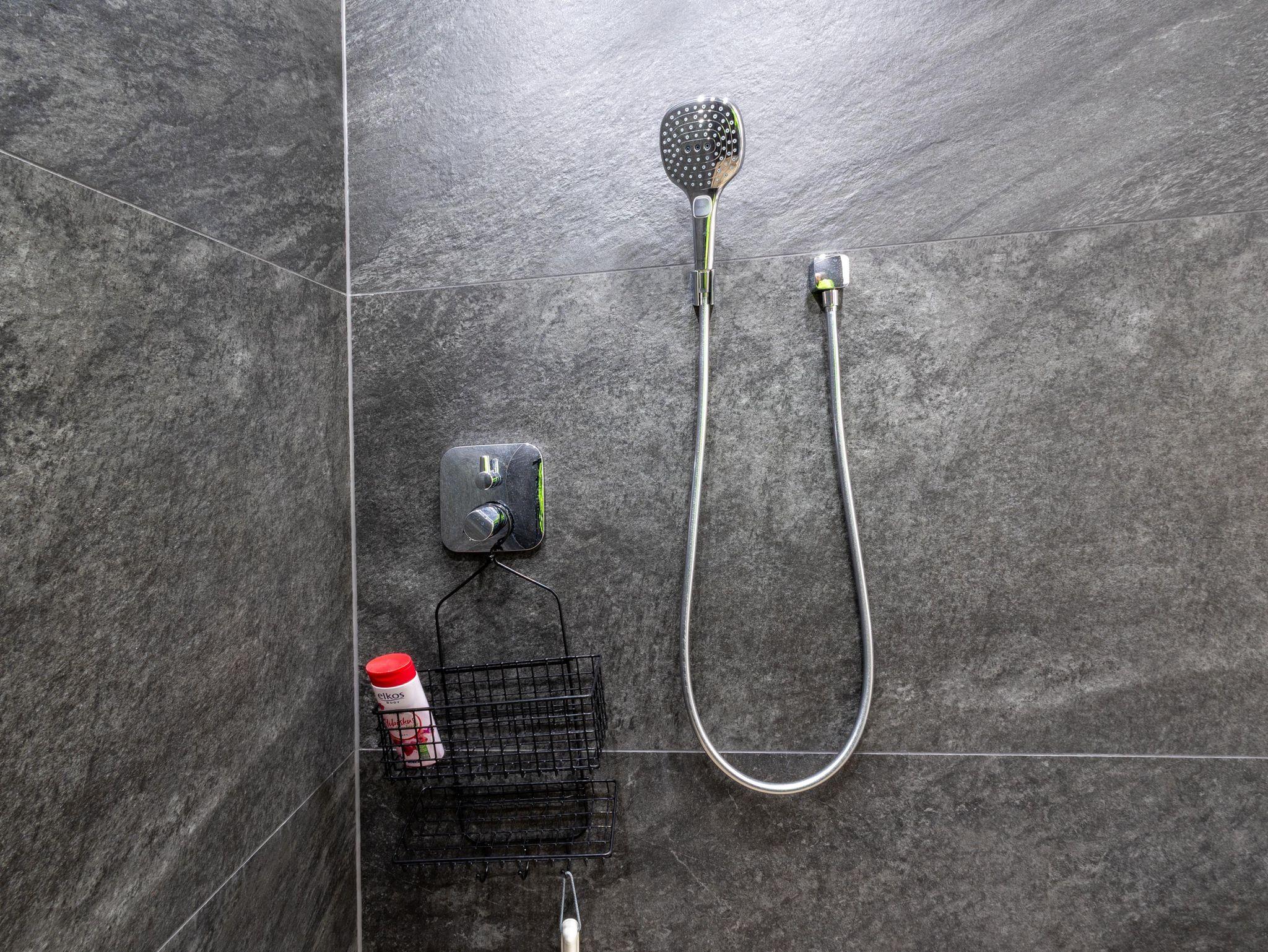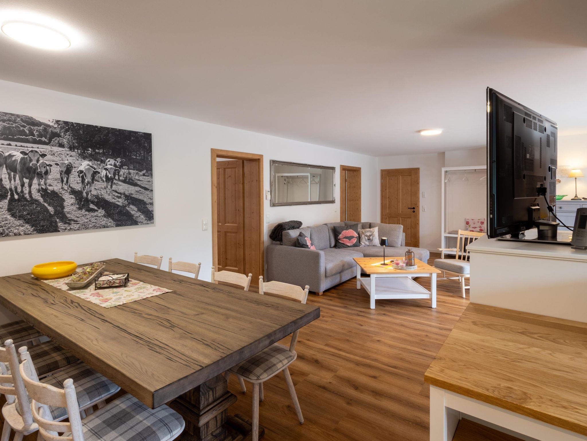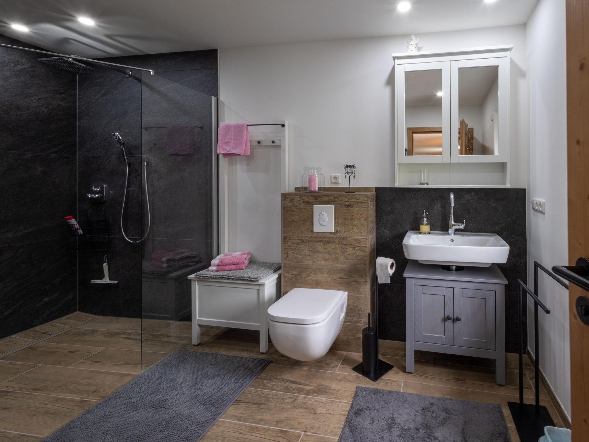 Der große Wohn- und Essbereich lädt zum Verweilen ein – mit gemütlicher Couch, Fernseher und einem großzügigen Esstisch. Die voll ausgestattete Küche verfügt unter anderem über eine Kaffeemaschine, einen Herd und einen Toaster – ideal für gemeinsame Mahlzeiten und einen gelungenen Start in den Tag. Das geräumige Badezimmer ist mit einer ebenerdigen Dusche ausgestattet. WLAN steht kostenfrei zur Verfügung.