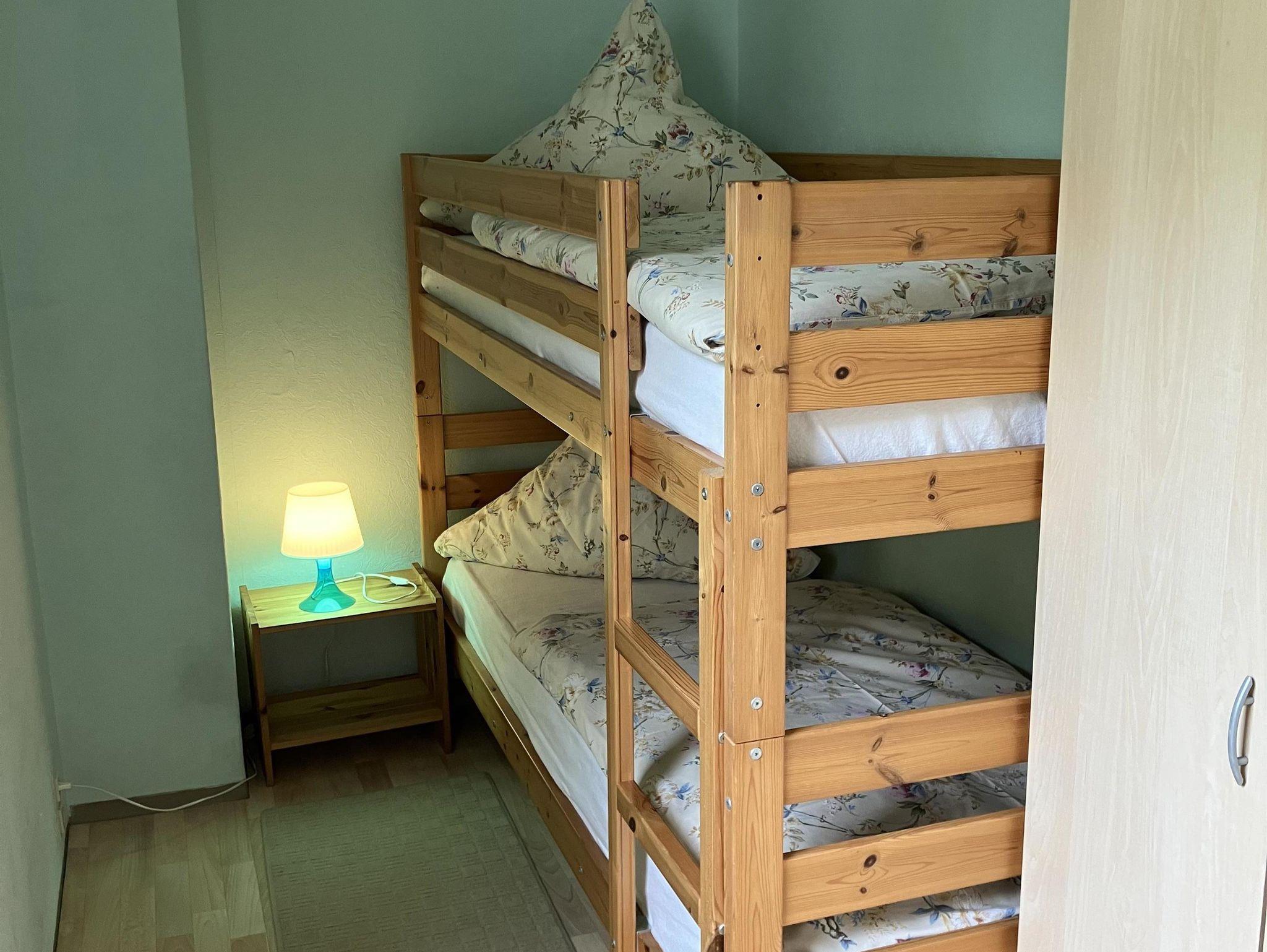 Die Ferienwohnung liegt im Erdgeschoss, ist eine Nichtraucherwohnung und bietet auf 60 Quadratmetern Platz für bis zu 4 Personen. Sie verfügt über einen offenen Wohn- und Kochberreich. Die Kochnische bietet 2 Herdplatten, Toaster, Kaffeemaschiene, Mikrowelle, Kühlschrank und Wasserkocher. Ihnen stehen 2 separate Schlafzimmer zur Verfügung, davon ist ein Schlafzimmer mit einem Doppelbett ausgestattet und das andere Schlafzimmer mit einem Etagenbett. Das Badezimmer ist mit Dusche, Waschbecken und WC ausgestattet. Handtücher und Bettwäsche sind kostenfrei vorhanden, ebenso wie WLAN und Parkplatz.