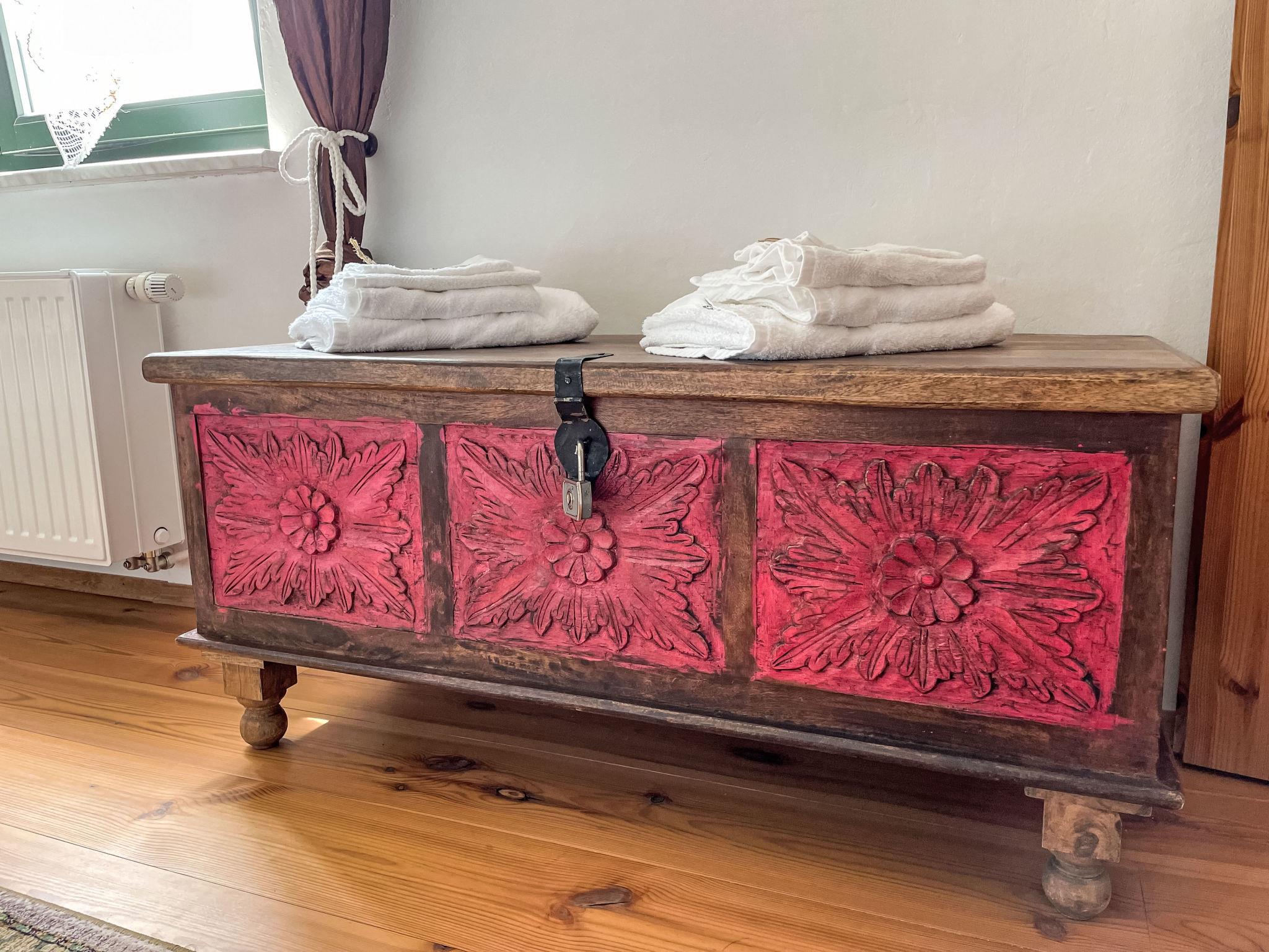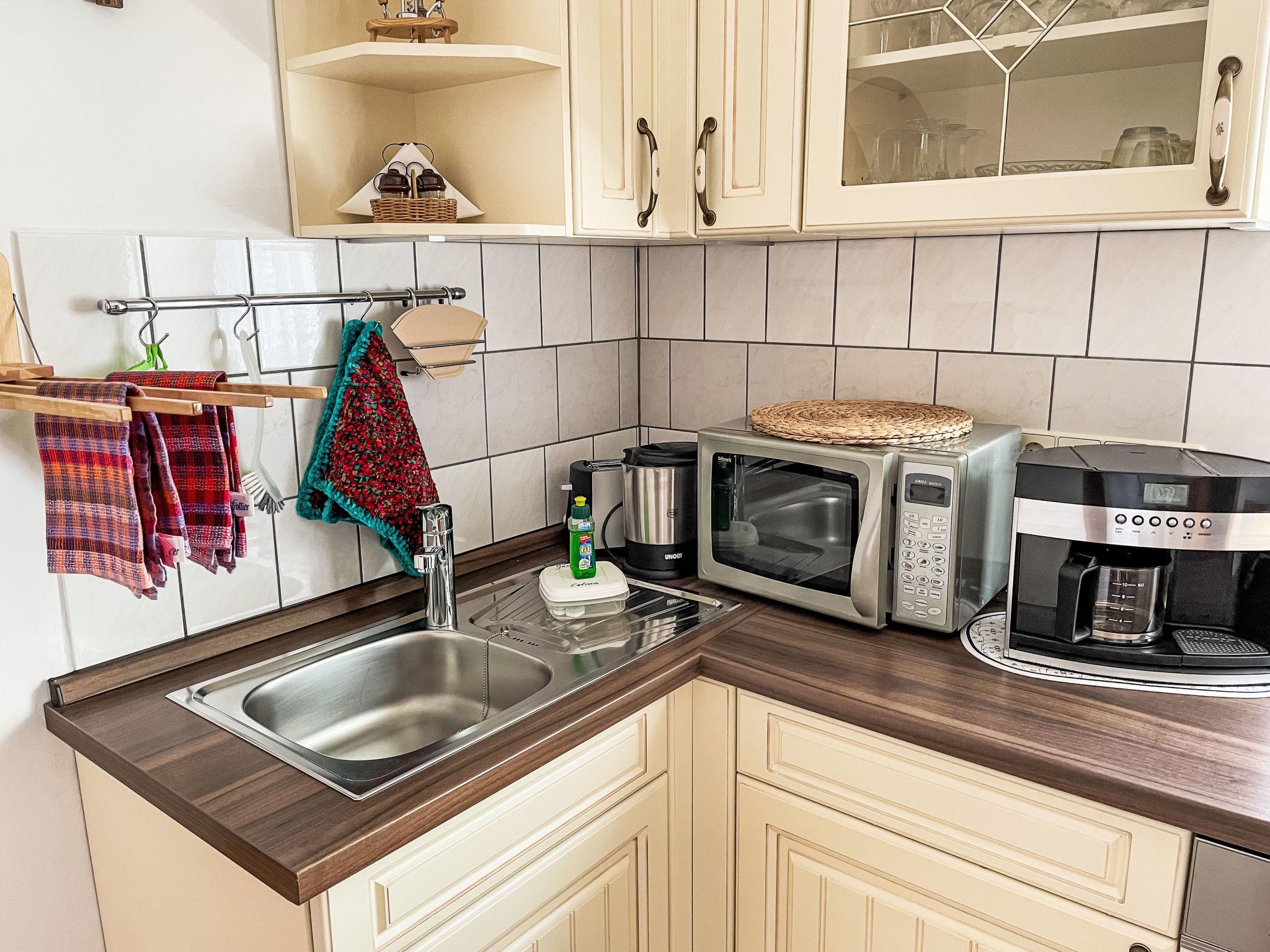 "Speicher", 2-room apartment 58 m2 on 1st floor. Comfortable and stylish furnishings: living/dining room with satellite TV (flat screen), radio. 1 room with 1 double bed. Open kitchen (oven, dishwasher, 4 ceramic glass hob hotplates, toaster, kettle, microwave, electric coffee machine). Shower/WC. Oil heating. Wooden floors. Patio. Terrace furniture. Facilities: Internet (WiFi, free). Please note: non-smokers only. Smoke alarm, fire extinguisher.