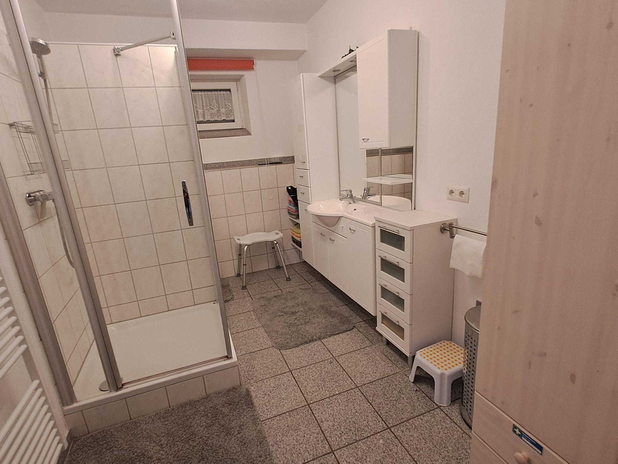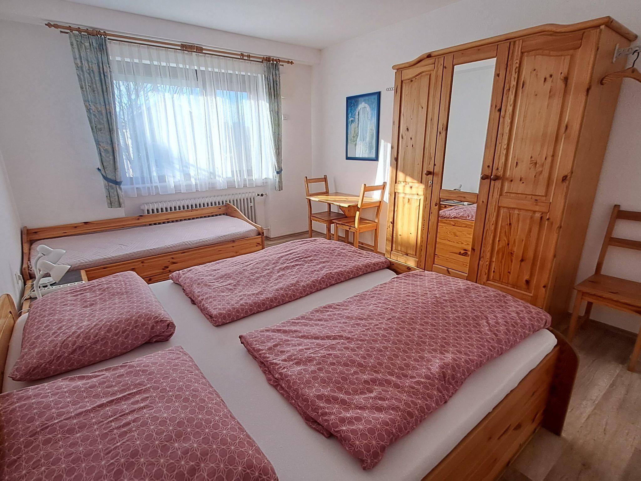 Ferienwohnung mit ca. 77 m2, Wohnraumbelüftung mit Wärmerückgewinnung, Küche, Wohn-Esszimmer, 2 Schlafzimmer, Bad mit Dusche. Die Küche ist mit folgenden Küchengeräten ausgestattet: Backofen mit Cerankochfeld, Mikrowelle, Kühlschrank mit Gefrierfach, Geschirrspüler, Kaffeemaschine, Toaster, Brotschneidemaschine, Wasserkocher, Eierkocher, sämtliches Geschirr und Besteck, Töpfe und Pfannen. Im Wohn-Esszimmer befinden sich zwei Ledersofas und Wohnzimmertisch, WLAN, SAT-TV, CD-Radio, Esszimmertisch mit 8 Stühlen. In der Ferienwohnung befinden sich zwei Schlafzimmer: 1 Zimmer mit einem Doppelbett u. einem Bett, 1 Zimmer mit einem Doppelbett, Betten mit Federkernmatratze, Nachttisch mit Leselampe, Kleiderschrank in jedem Zimmer.