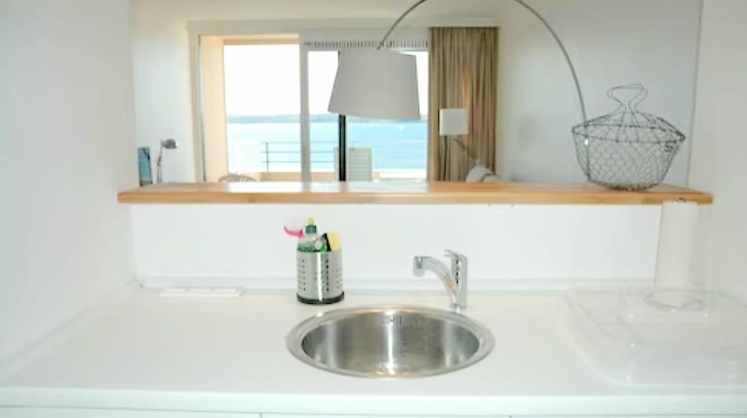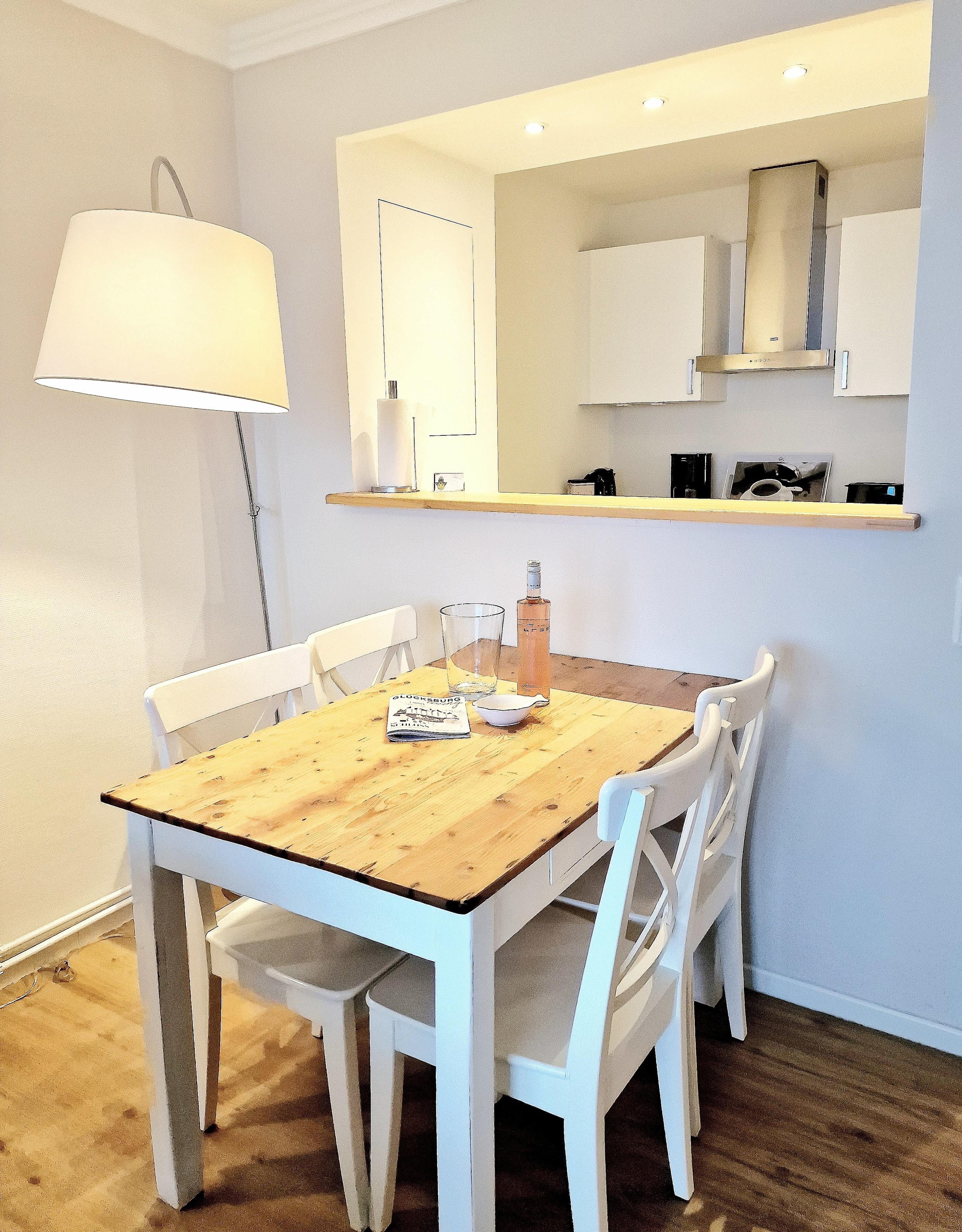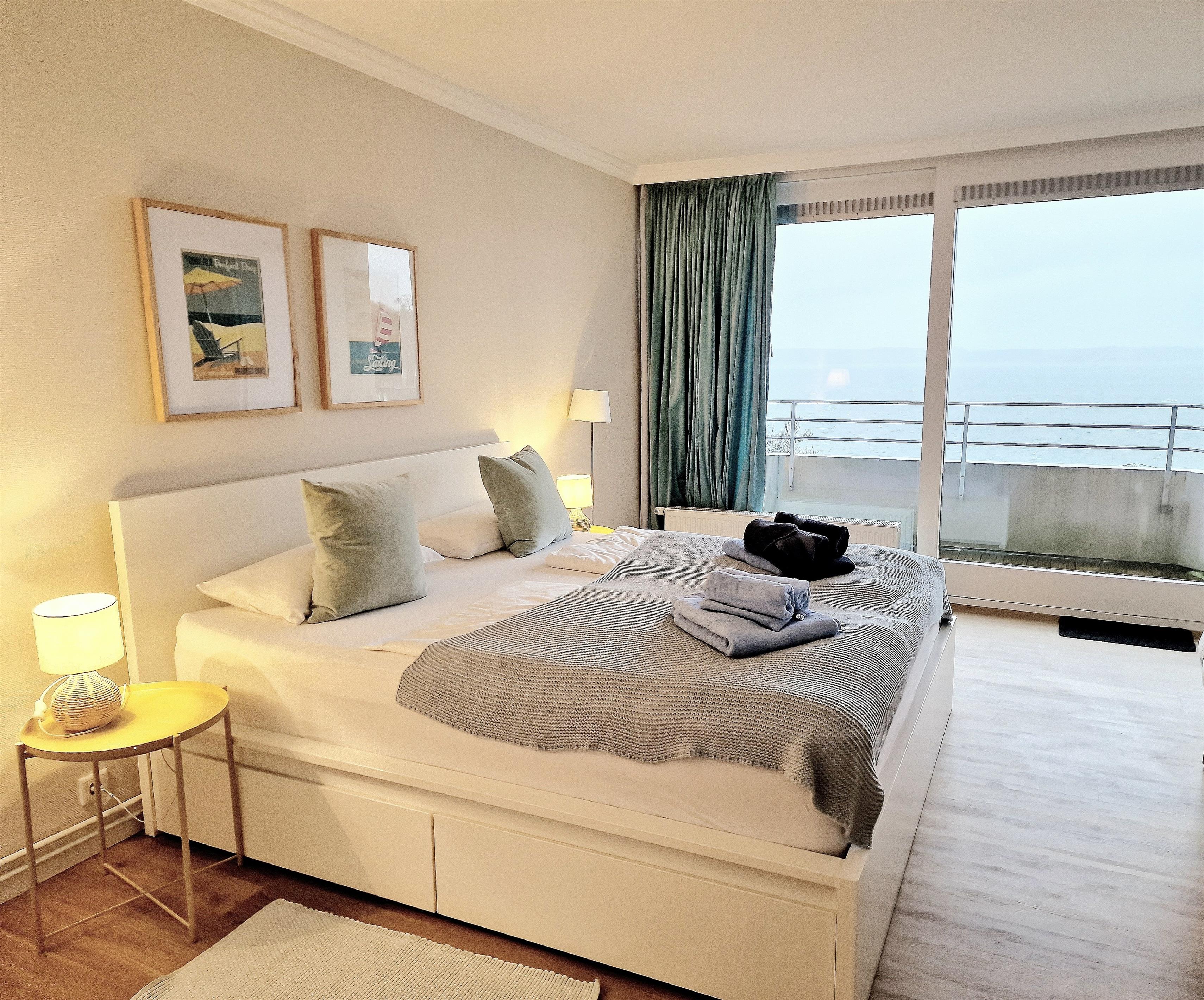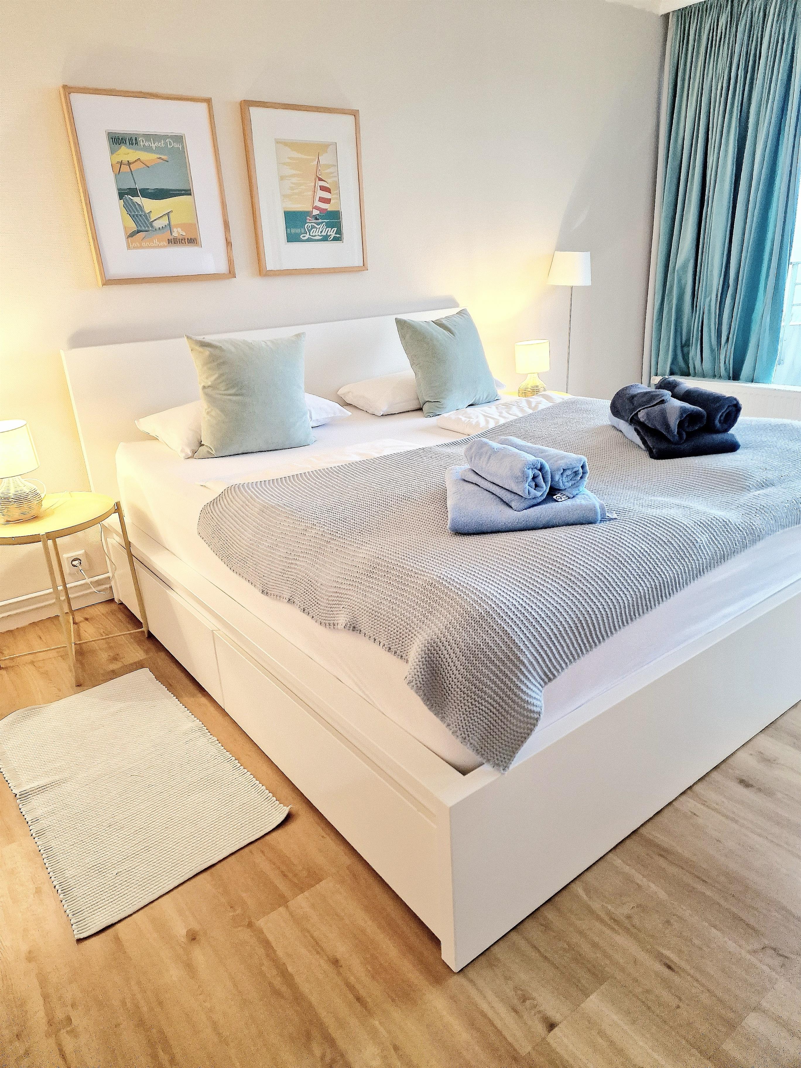 Das Schlafzimmer präsentiert sich in einem maritimen Stil, gehalten in Weiß und Türkis. Sowohl das Bett als auch die Matratzen sind brandneu. Die nagelneue Einbauküche ist komplett ausgestattet mit einem Geschirrspüler, einem Kühlschrank und einem Backofen mit Cerankochfeld. Von Ihrem Küchentresen aus können Sie den Blick ins Wohnzimmer genießen und weiter auf die Förde schweifen lassen.