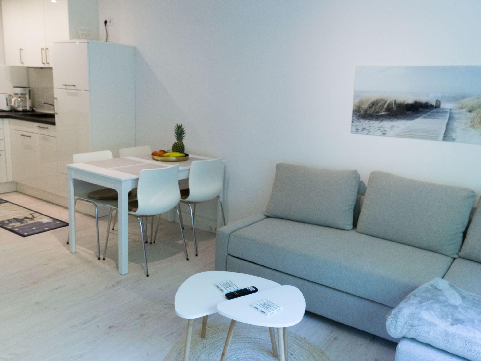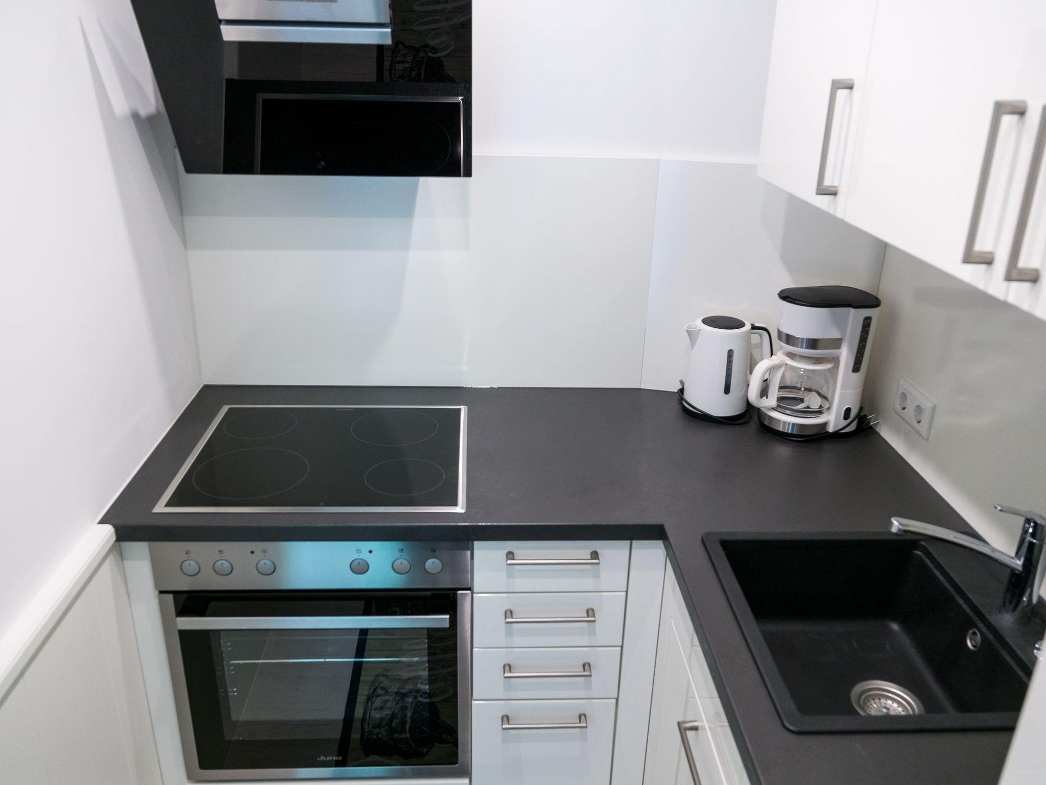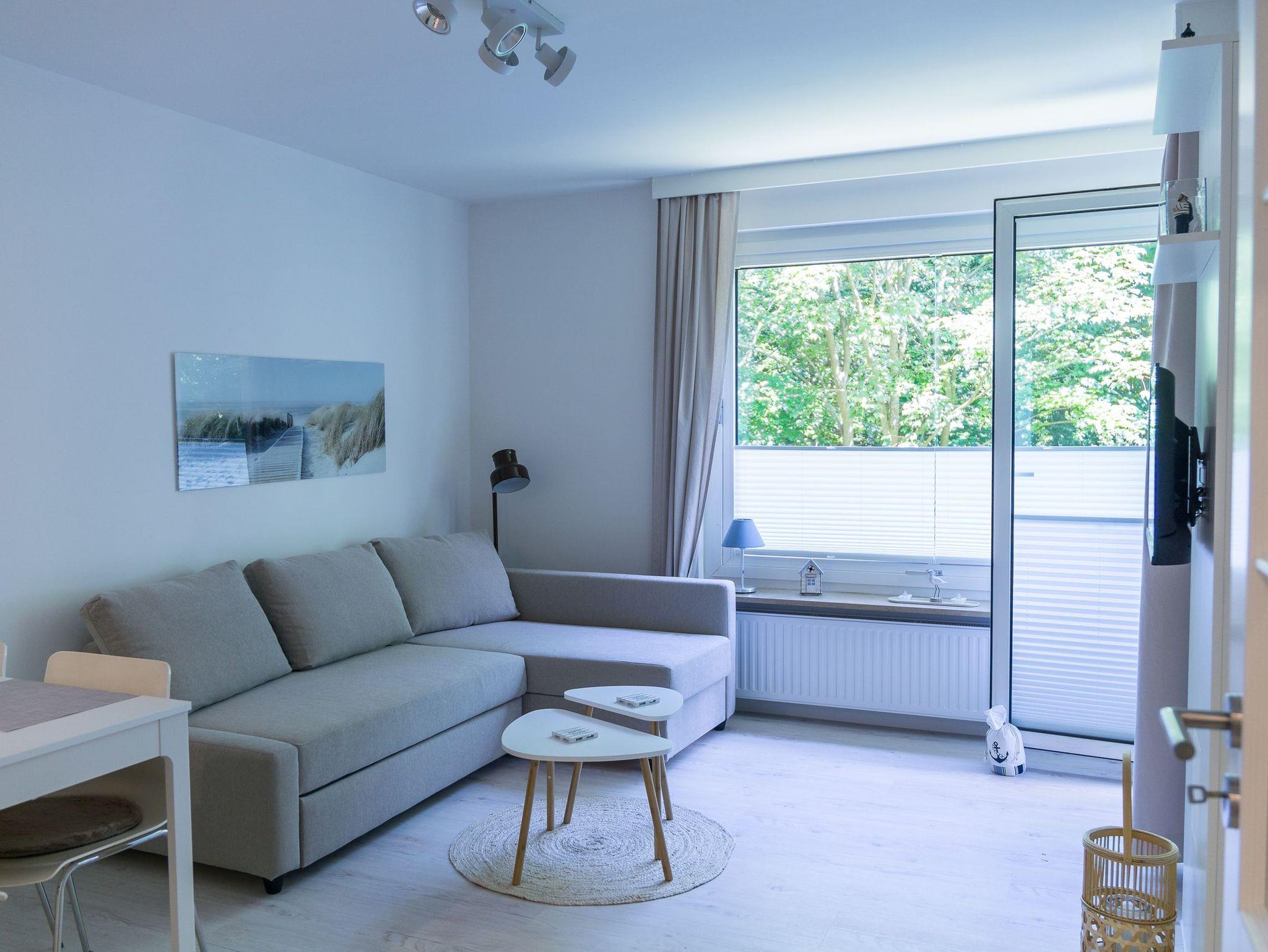 Sie verfügt über ein Wohnzimmer nit Schlafsofa und offener Küche, ein Schlafzimmer mit einem Doppelbett ( 2 x 0,80 x 2,00 m), ein Duschbad und einen Balkon.