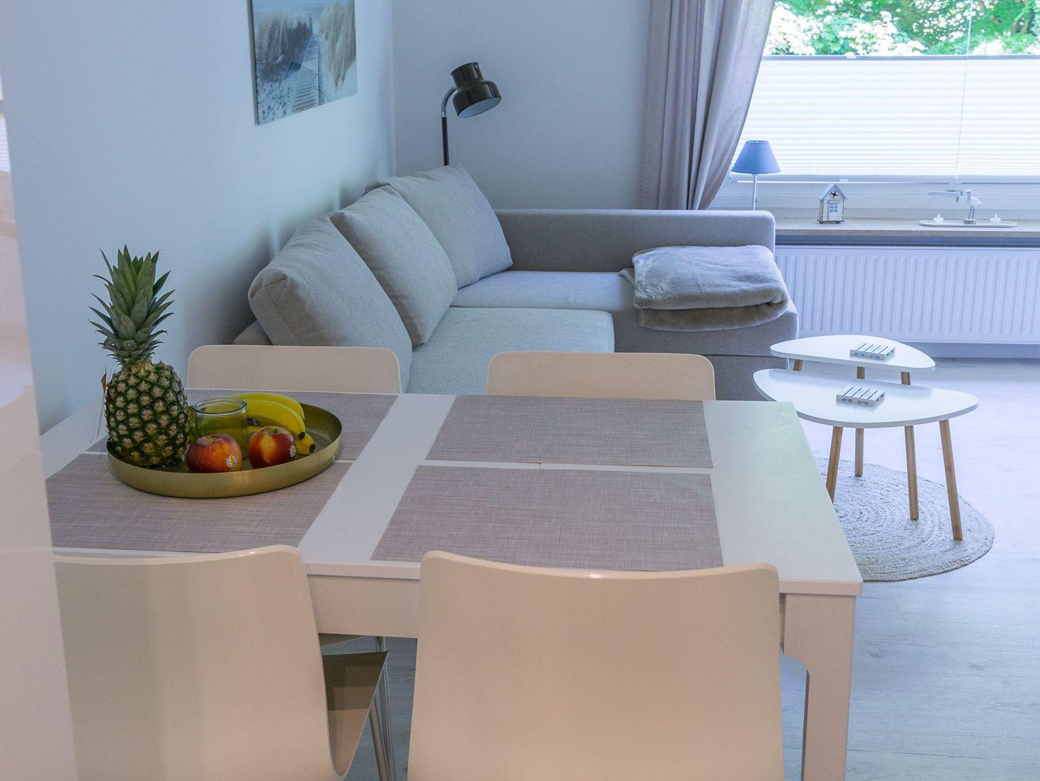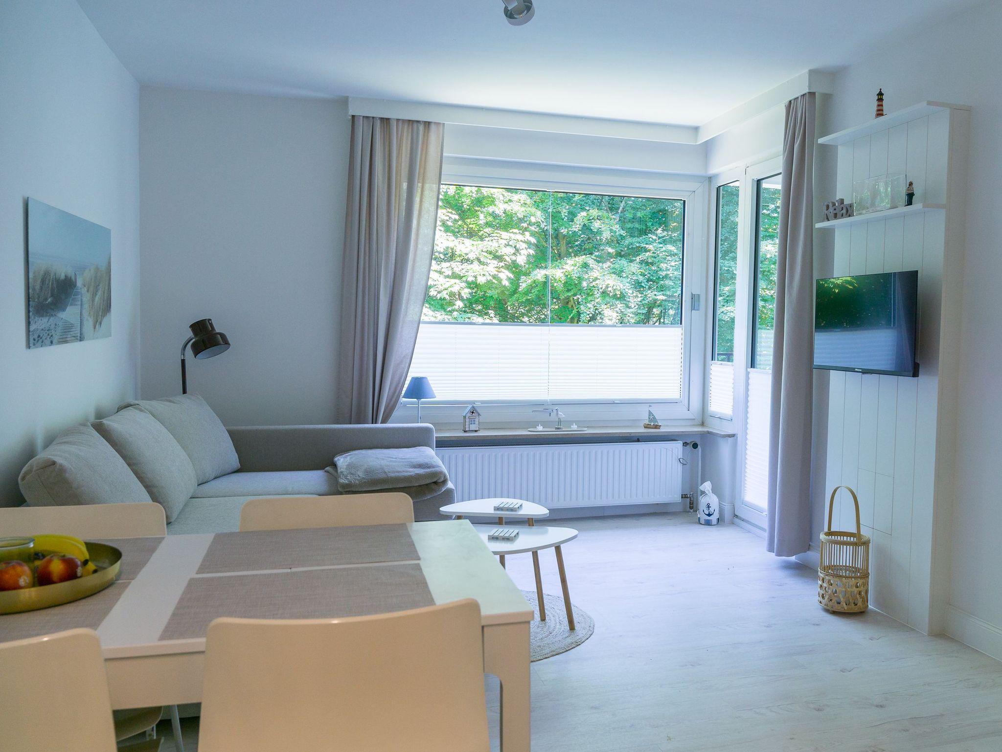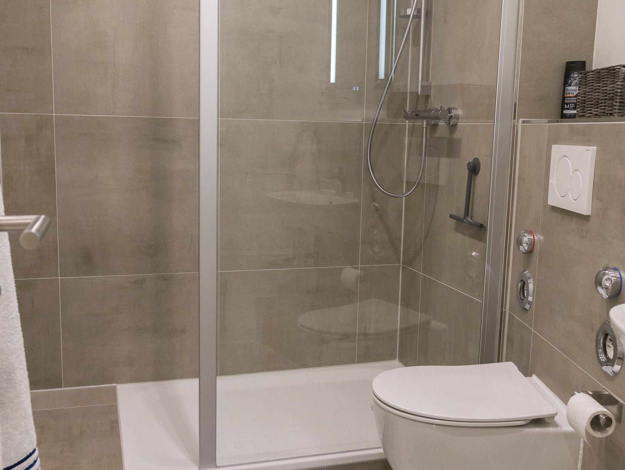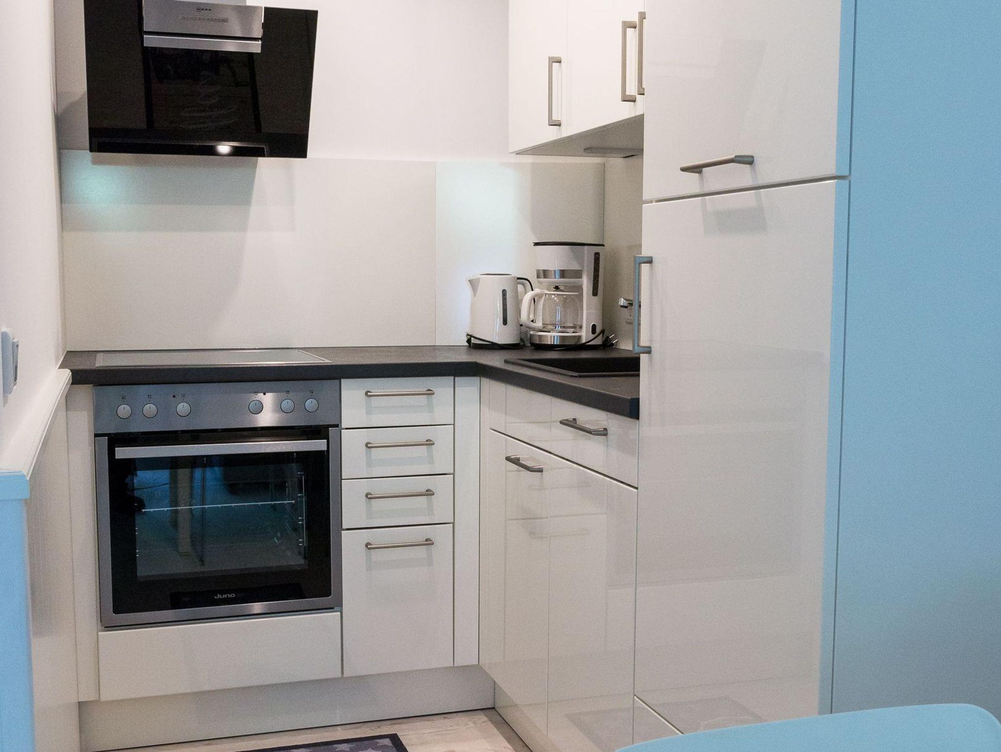 Sie verfügt über ein Wohnzimmer nit Schlafsofa und offener Küche, ein Schlafzimmer mit einem Doppelbett ( 2 x 0,80 x 2,00 m), ein Duschbad und einen Balkon.