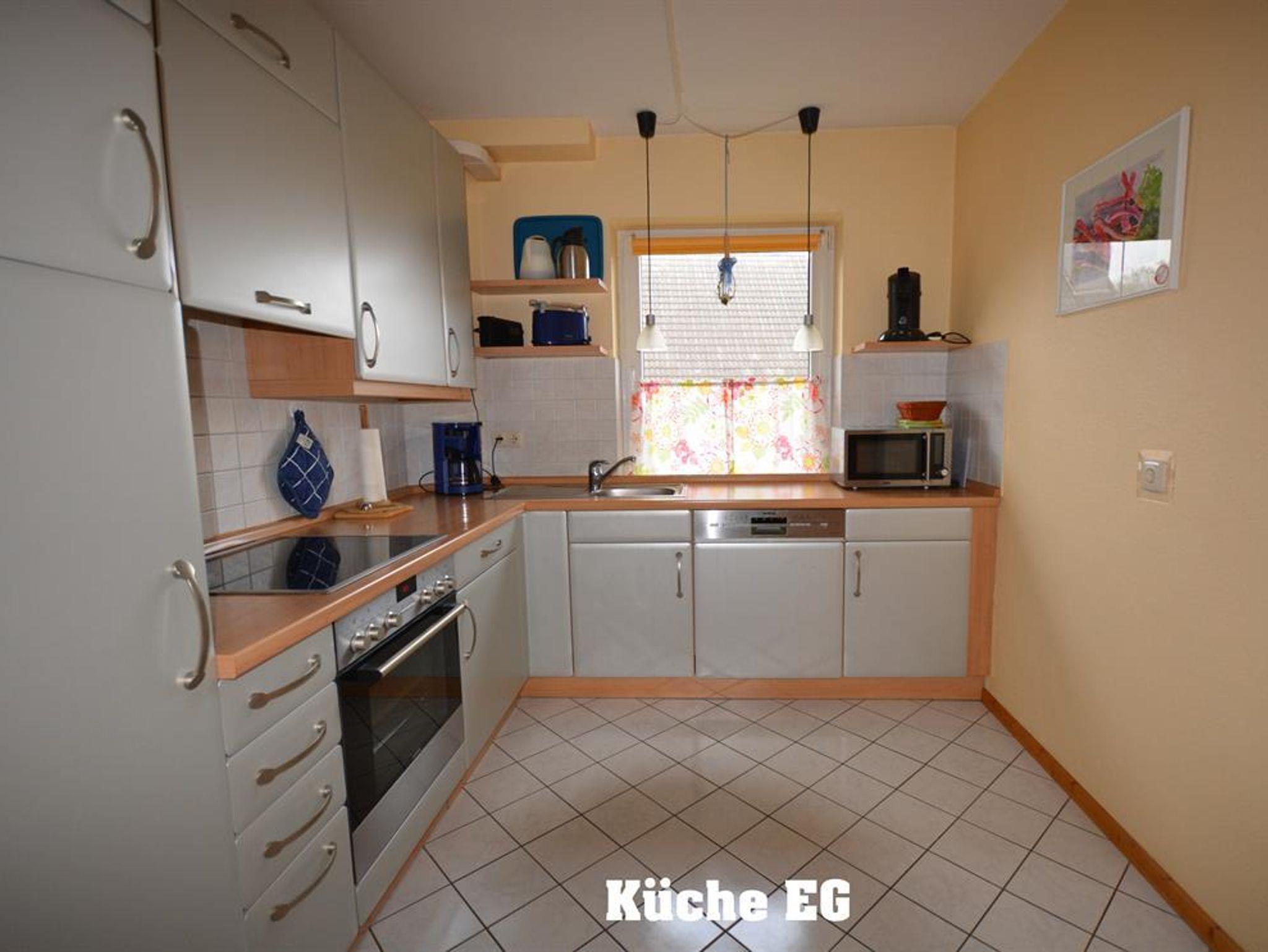 • 1 Küche mit Geschirrspüler, Mikrowelle, Kühl- Gefrierkombination, Herd, Backofen, Kaffeemaschine, Wasserkocher und Toaster