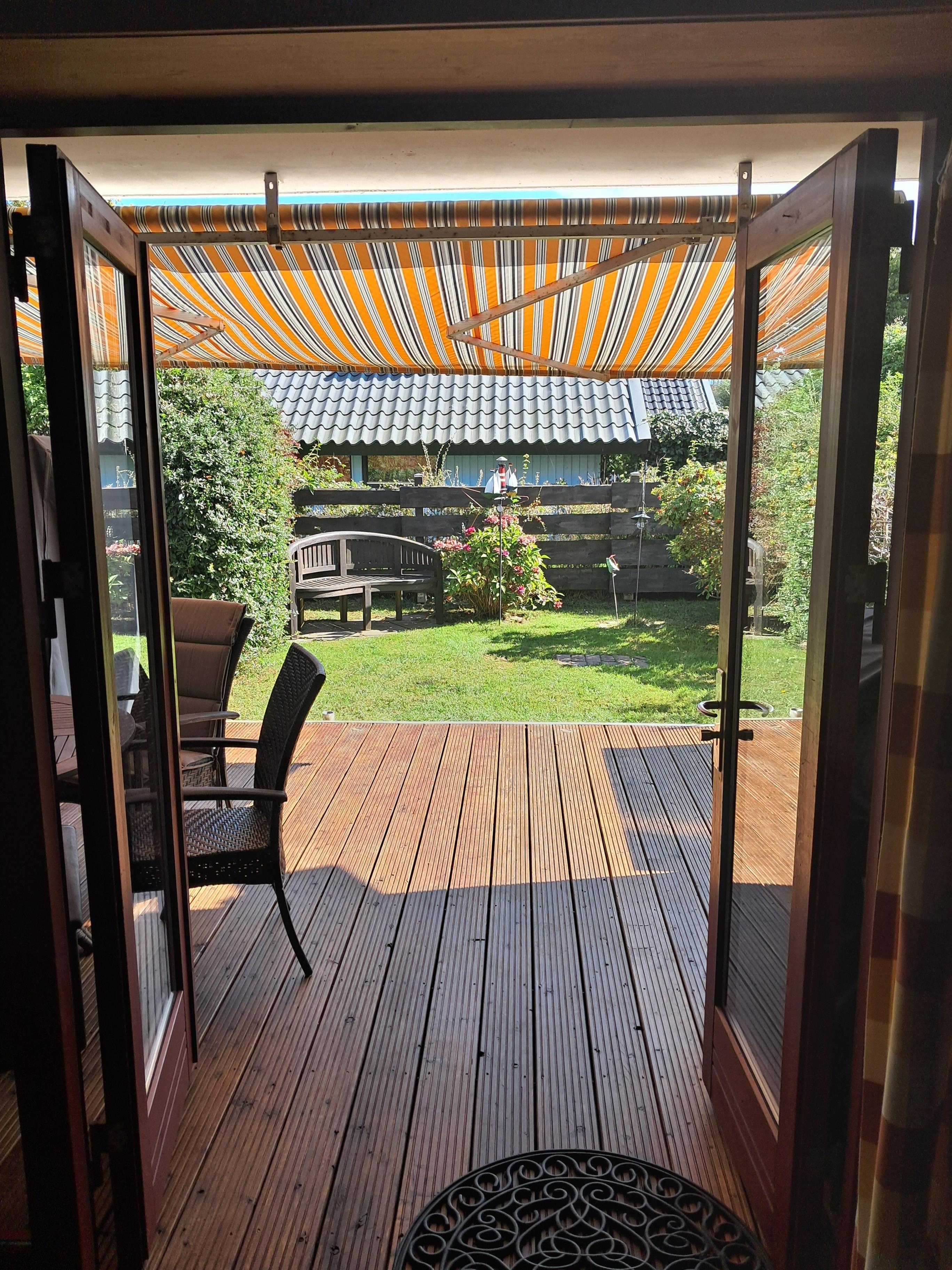 Besonders einladend sind die zwei sonnigen Terrassen. Die große Holzterrasse ist mit bequemen Gartenmöbeln, Sonnenliegen, einem modernen Gasgrill, einem gemütlichen Strandkorb und einer Markise ausgestattet. Hier können Sie entspannte Grillabende mit Familie und Freunden genießen oder den Tag bei einem Glas Wein auf der vorderen kleinen Terrasse gemütlich ausklingen lassen.