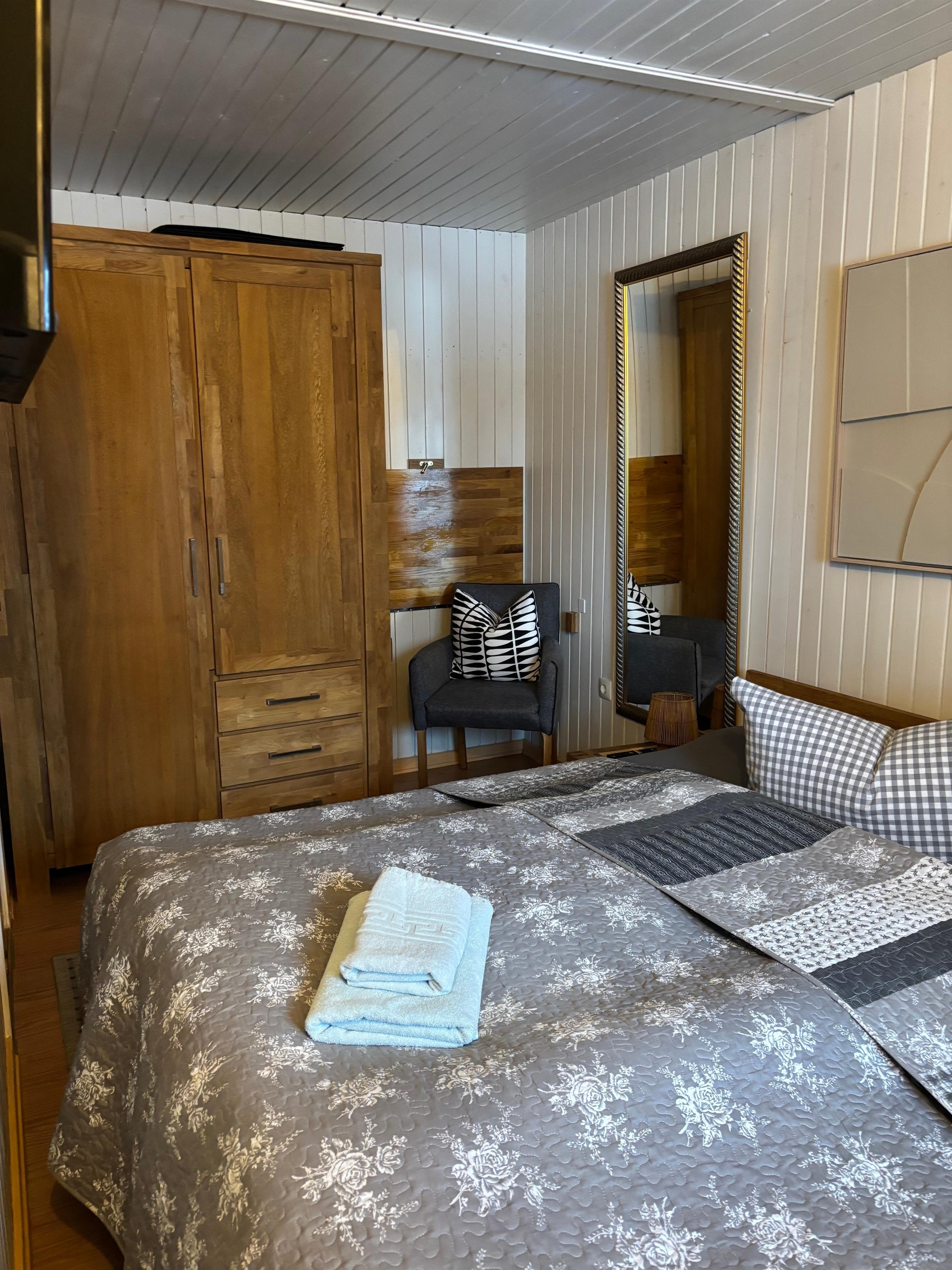 Für erholsame Nächte sorgen zwei gemütliche Schlafzimmer. Das größere Schlafzimmer ist mit einem komfortablen Doppelbett (180x200) sowie einem Kleiderschrank ausgestattet, während das zweite Schlafzimmer ein Boxspring-Doppelbett (160x200) bietet. Jedes Zimmer verfügt über hochwertige Matratzen, eigene Fernseher (1x Smart-TV) sowie jeweils einen eigenen Arbeitsbereich mit Schreibtisch und Stuhl (Homeoffice).