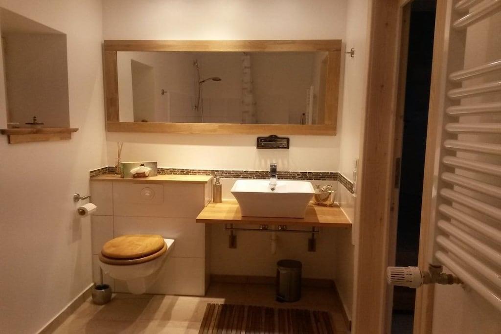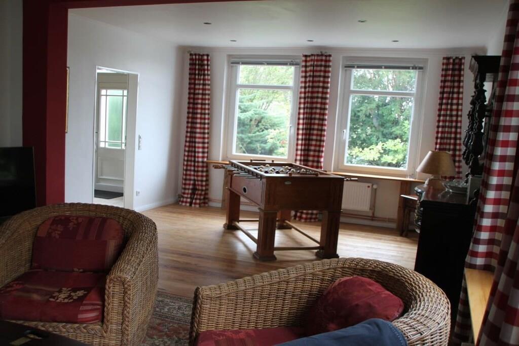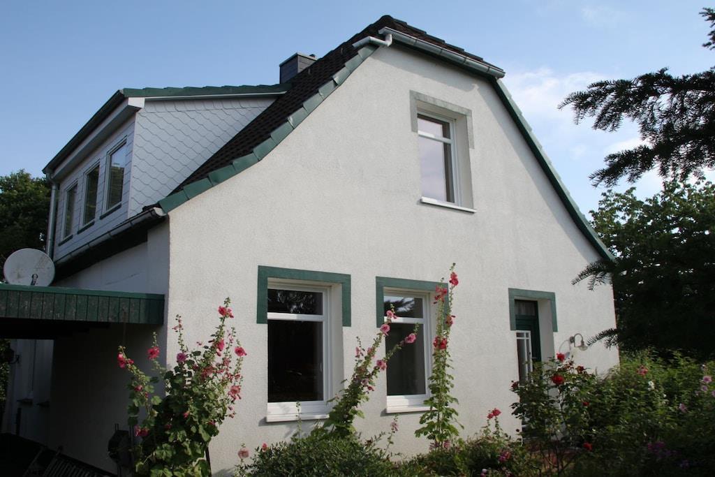 Vores feriehus er beliggende i en uspoleret beliggenhed på landet direkte ved Kremper Rhin. Huset (bygget i 1909) blev nænsomt restaureret, fuldstændig renoveret og moderniseret i 2015. 110 kvm boligareal er opdelt i to plan. I stueplan er der en stor stue (30 kvm) samt et køkken-alrum med spiseplads (14 kvm) og et moderne badeværelse med badekar og vaskemaskine. På 1. sal er der to rummelige soveværelser og et moderne brusebadeværelse. Derudover har huset en carport og et stort skur til opbevaring af cykler. Den store have med egen terrasse og ekstra grillplads samt adgang til floden er til rådighed for vores gæsters eksklusiv brug. Vandre- og cykelstier ligger direkte på ejendommen.