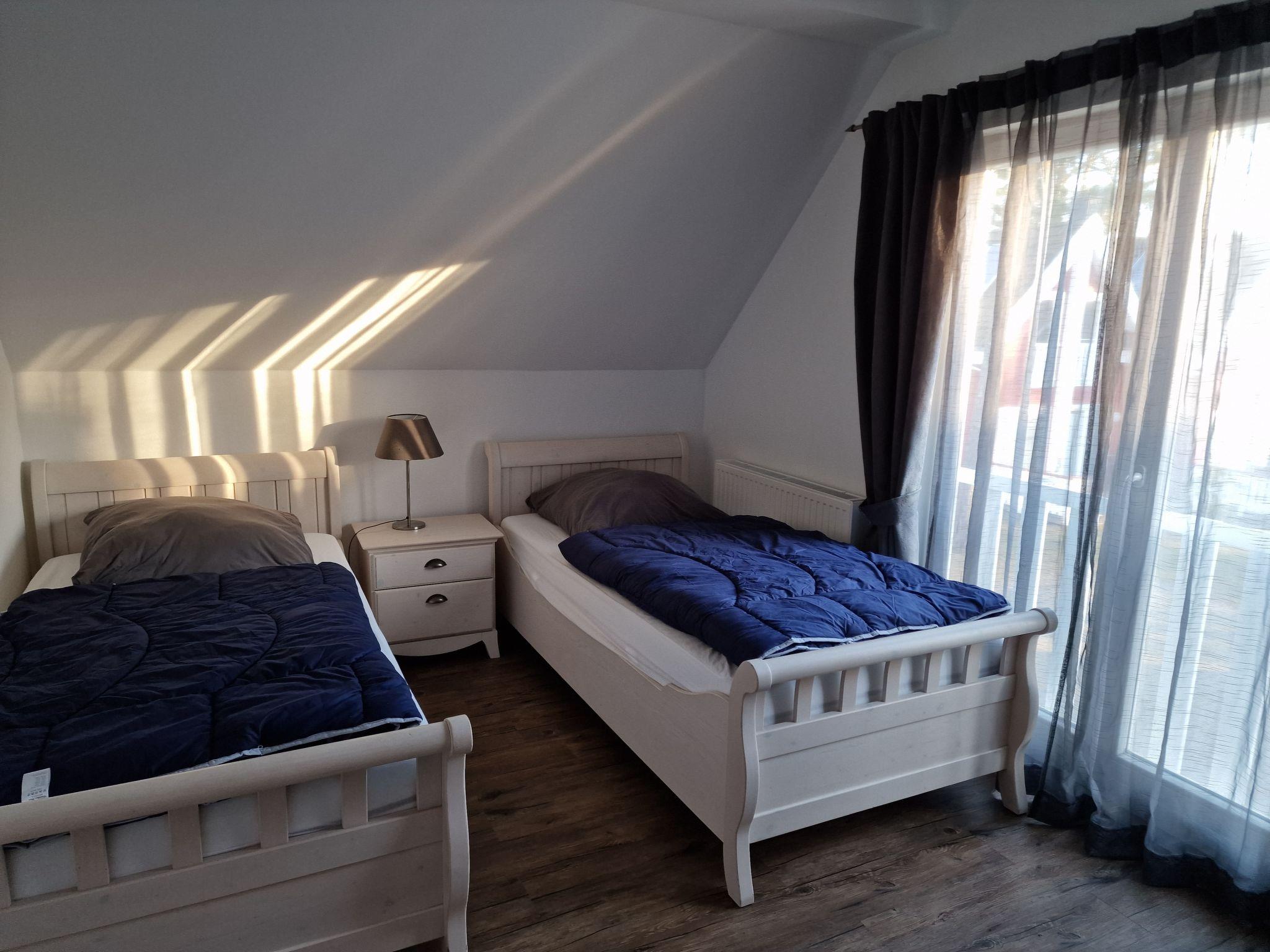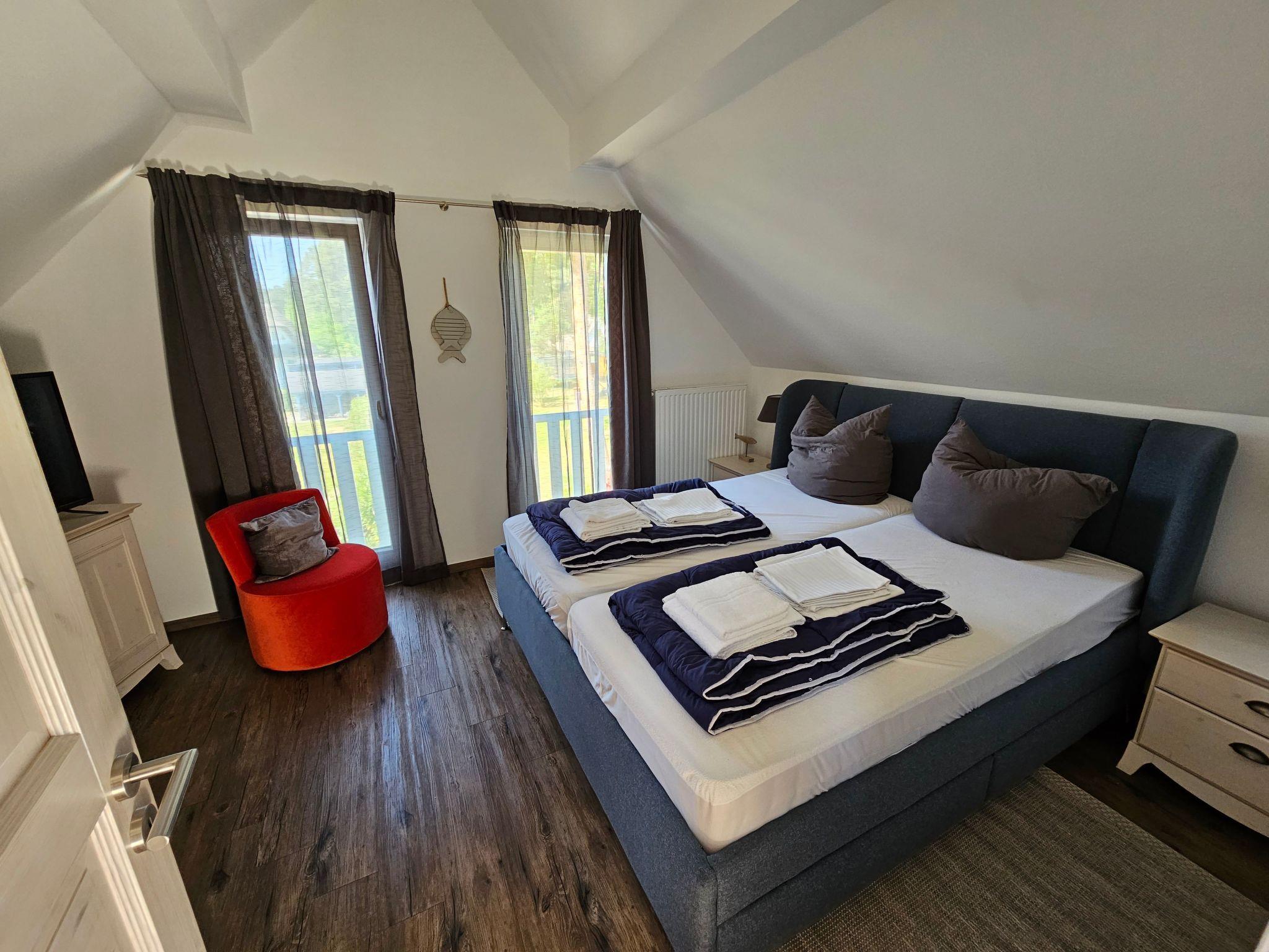 The house is charmingly furnished and provides around 78m² of living space on two floors, ample space for four adults and two children. The lower floor has a generous living room and kitchen and a big wellness bathroom with a whirlpool and sauna. The living room provides a sofa bed for two people. During the cold season on the island the fireplace stove and under-floor heating ensure pleasant warmth in the house. The floor-to-ceiling panoramic windows open up towards the terrace and garden, allowing the holiday sun to shine right into the house. Lovely wooden stairs lead to the upper floor. The hallway provides access to two bedrooms, one with a double bed and the other with two single beds. Enjoy the whirlpool in the bathroom, with a view out onto greenery.