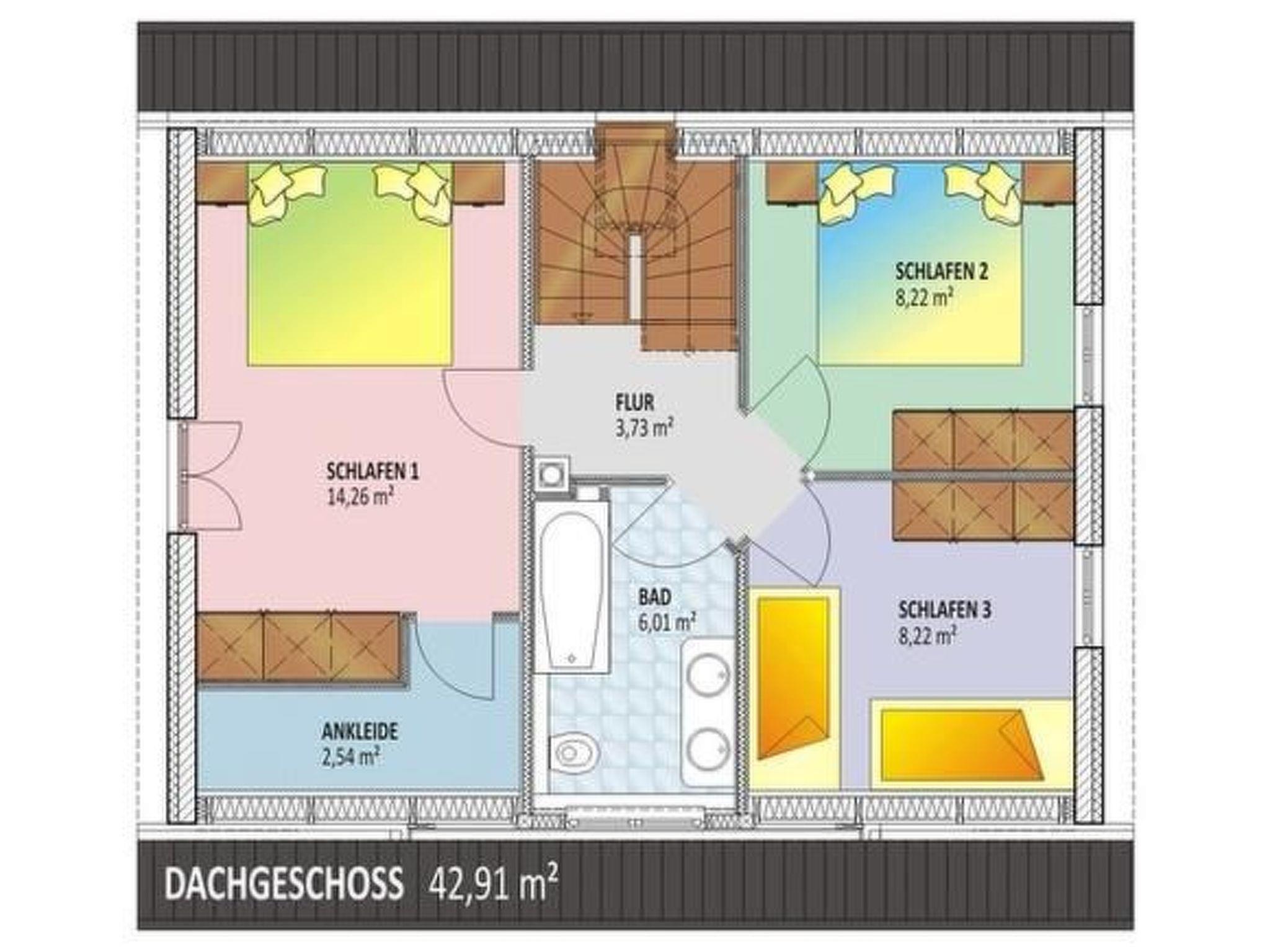 A cosy wood-burning stove and the tasteful furnishings of the light-flooded living area with open-plan kitchen and dining area on the ground floor will give you a warm welcome. The high-quality furnishings naturally also include a stereo system, LCD TV, DVD player and free Internet access via WLAN. Books and games for young and old will keep you entertained even when the weather is not so nice. On the ground floor there is also a shower room with adjoining sauna and a washing machine in the utility room. The upper floor has three bedrooms with a total of six beds for adults and an additional extra bed for a small child (travel cot, high chair available). One large bedroom is furnished with a double bed (180x200), a small music system and a second TV. Another bedroom has a double bed (160x200) and a small music system. The third bedroom has two single beds (90x200). A travel cot is available. All bedrooms are equipped with mosquito screens in front of the windows. The area is complemented by a spacious bathroom with bathtub, double washbasin and plenty of storage space.