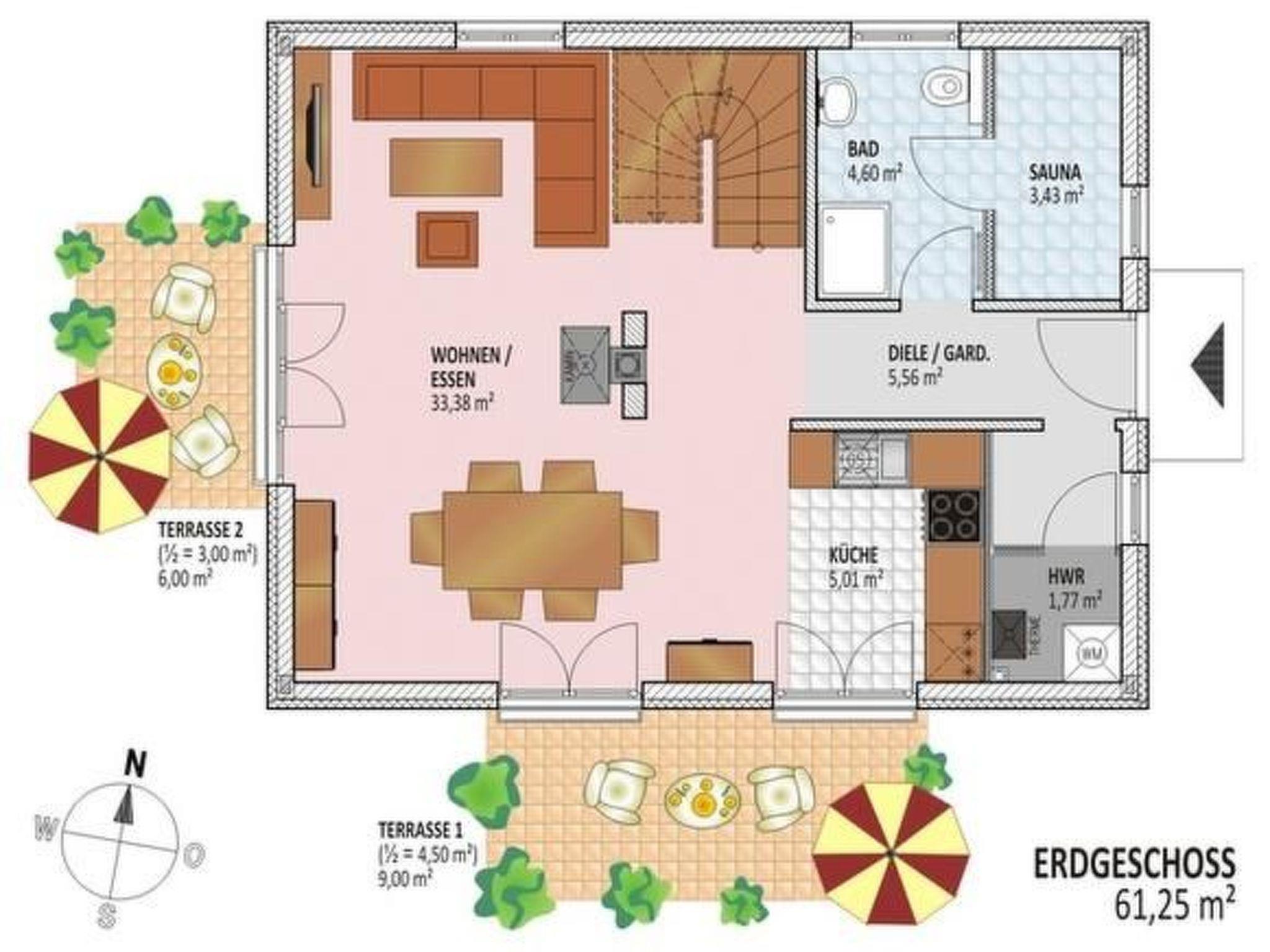 The Toddy holiday home has a south and west-facing terrace. Garden furniture, parasol, a beach chair and two sunbeds are available.