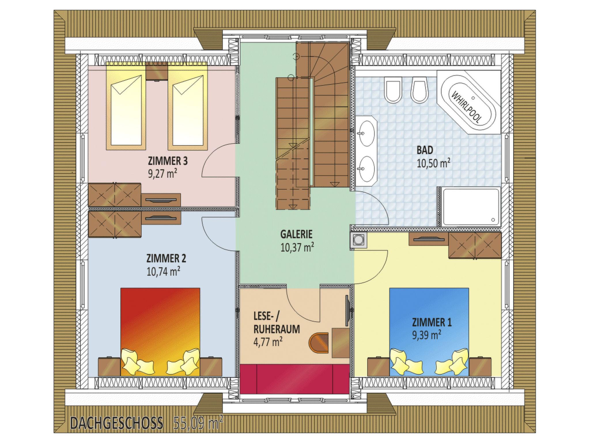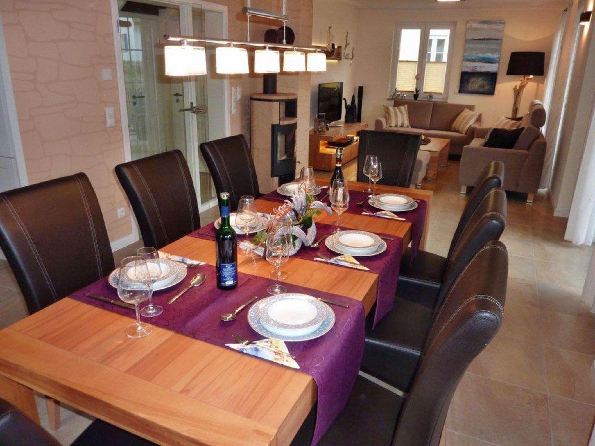 The holiday home has a living space of approx. 155 m² and is furnished in an individual, modern and family-friendly style. On the fully tiled ground floor is the spacious living and dining area with two sofas, a coffee table, a satellite TV, a long dining table with seating for eight people and a fireplace. Relax in the cold seasons with a warming open fire. The adjoining open-plan kitchen is fully equipped with an oven, fridge with freezer compartment, induction hob, dishwasher, microwave, toaster, kettle, waffle iron, ice cream maker, fully automatic coffee machine and coffee machine, leaving nothing to be desired. The landlord is happy to provide you with a children's high chair and board games for young and old free of charge. In the bathroom on the ground floor, you will find a separate toilet with a small washbasin, a spacious rain shower with a Kneipp hose, a washbasin, a hairdryer and a separate bio-sauna with colour light therapy and relaxing music. The upper floor, which is also fully tiled, has three bedrooms. Two of the three bedrooms have a double bed (1.60 m wide), while the third bedroom has two single beds (each 0.90 m wide). An additional cot/baby bed for a small child can be added free of charge. Relax in a separate, light-flooded gallery room, listen to your favourite music all to yourself or read an interesting book without being disturbed by other family members or friends. Features of the spacious bathroom on this floor include a rain shower, a double washbasin, a toilet, a bidet and a comfortable bathtub with whirlpool functions to gently relax your stressed muscles. In the converted attic there are two further bedrooms, each with two single beds (0.90 m wide). The rooms are partitioned off to protect your privacy. A further guest WC rounds off this living area. All windows are fitted with pleated blinds and fly screens, as are the exit doors to the terrace. The high-quality and modern equipment naturally also includes a stereo system, a Blu-Ray player, several LCD TVs, free Internet access via WLAN, (underfloor) heating throughout the house, as well as a washing machine and tumble dryer.