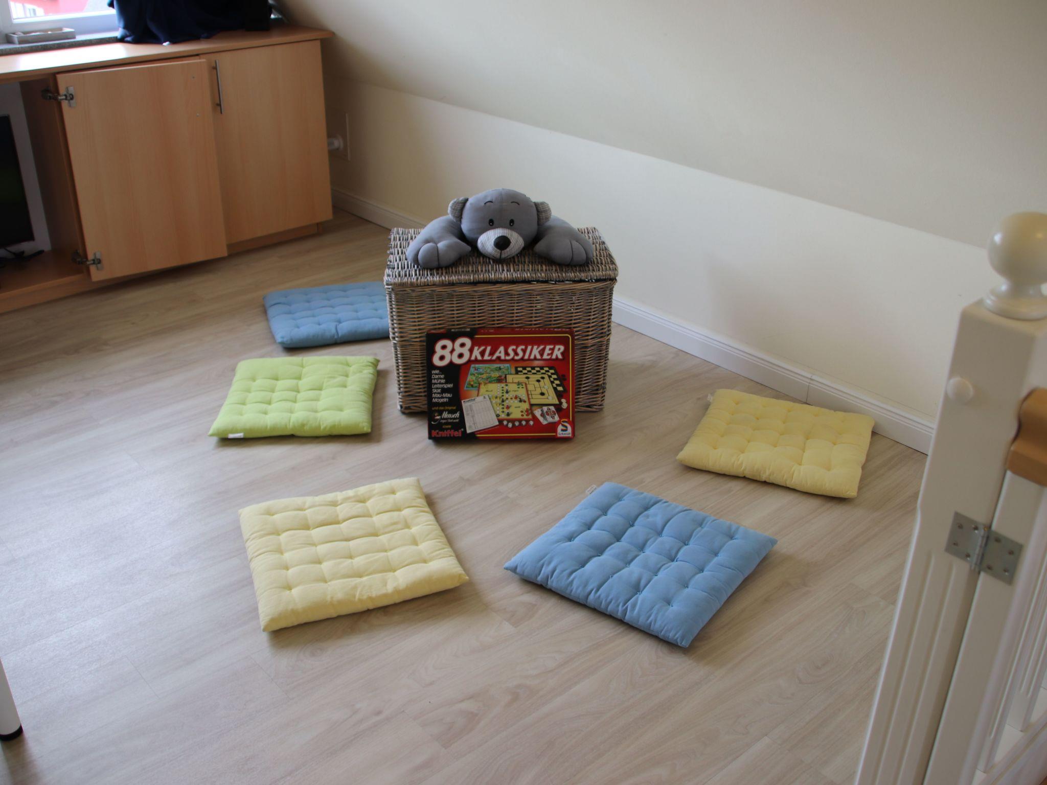 The converted attic flooded with daylight has an exclusive big room with two single beds and a playing corner with games and children’s books. There is also an LCD TV with a BluRay system, a radio and Apple docking station. The stairs in the attic are fitted with a safety gate, so small children can play safely. It is an ideal room for children to play in when the weather is inclement. The windows here also have insect screens and darkening curtains.