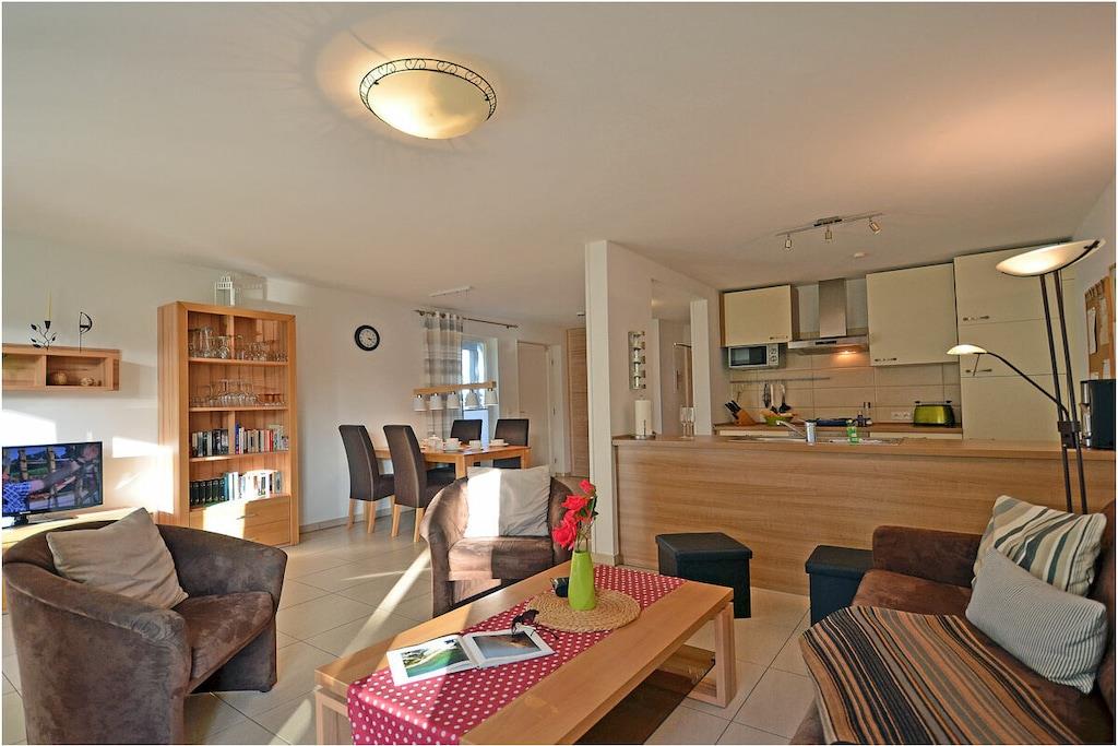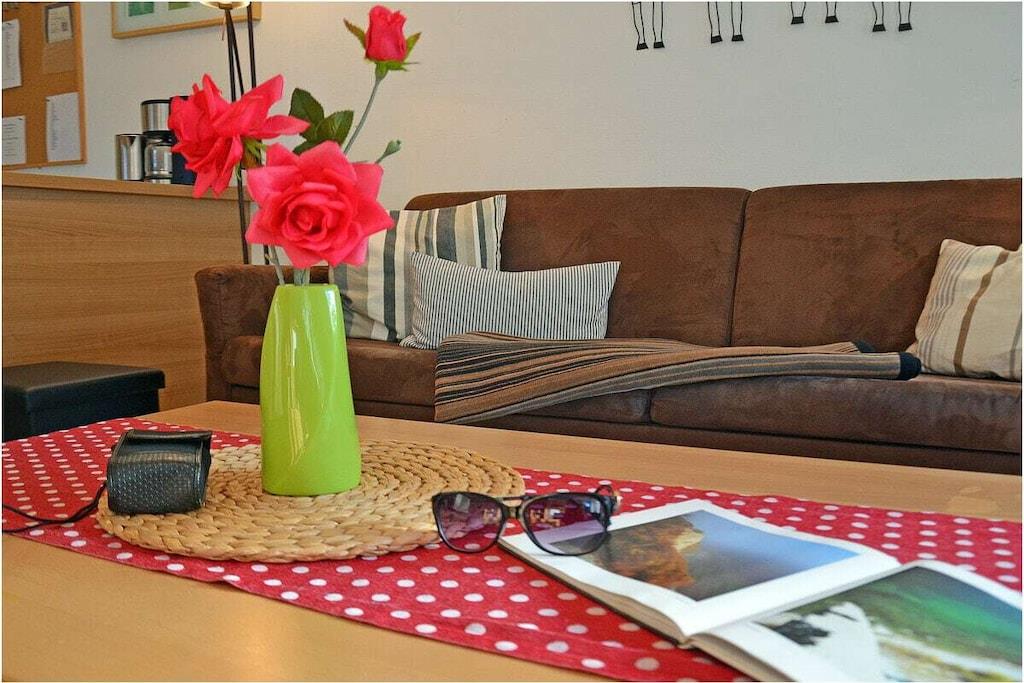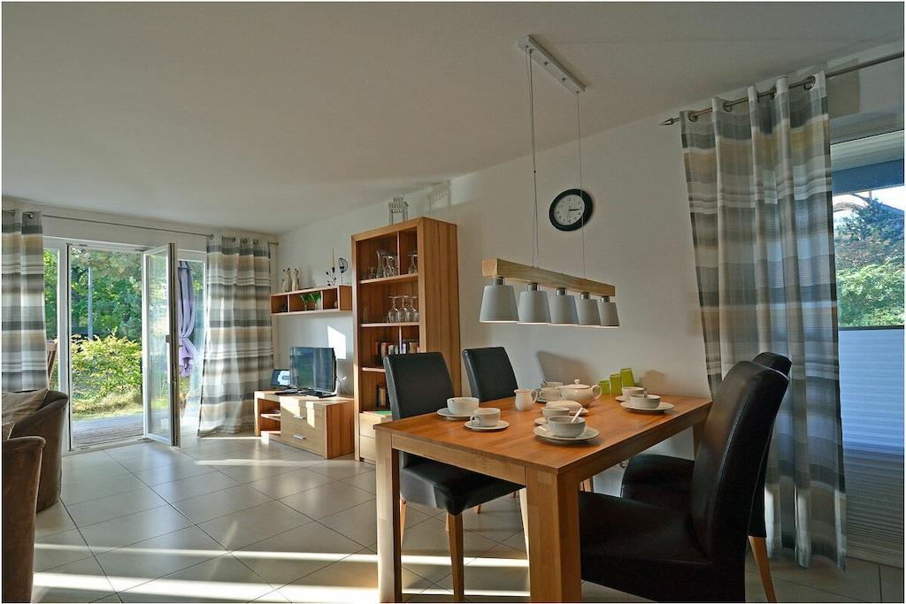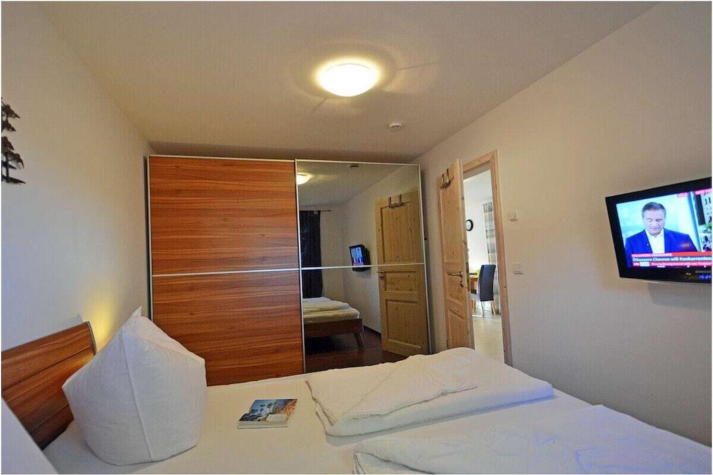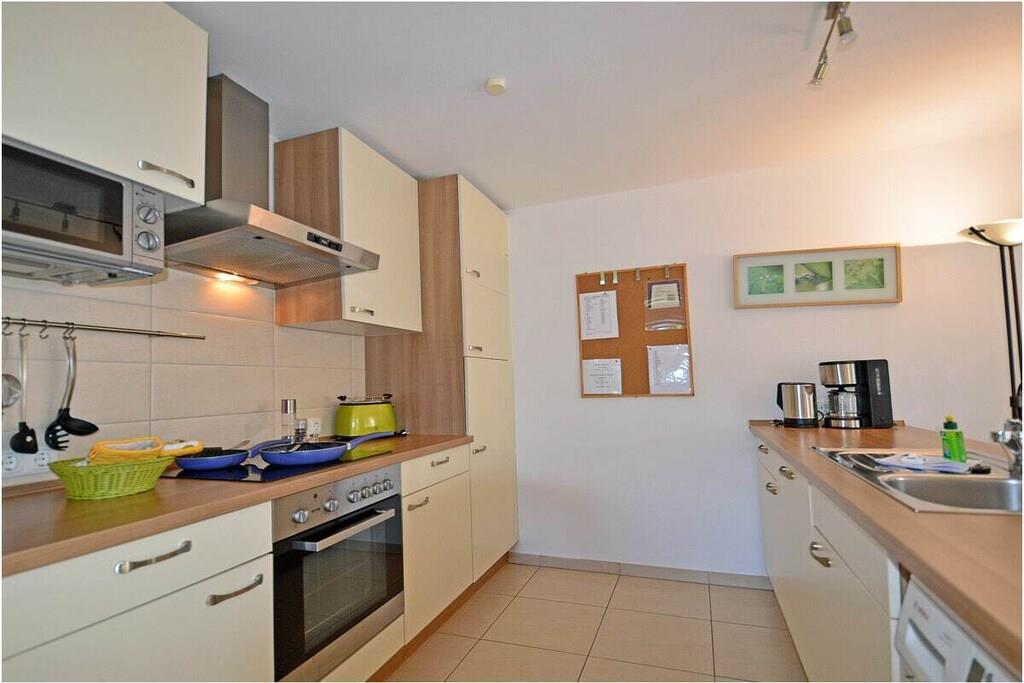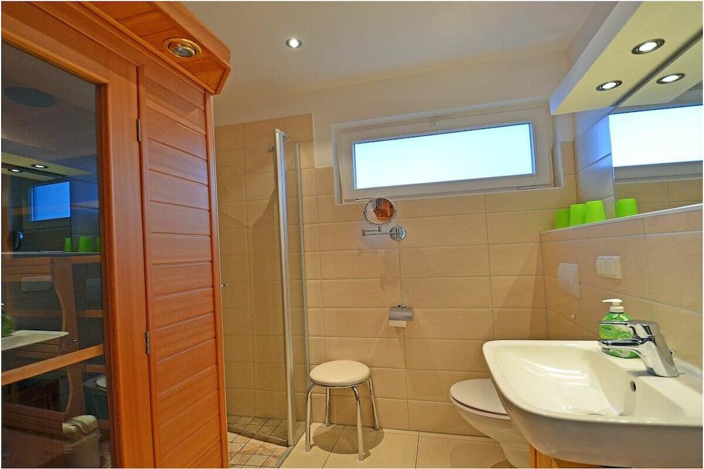 Ground floor: Living-dining area with comfortable pull-out sofa bed that offers sleeping space for 2 people (160×200), fireplace, dining table, TV/satellite (flat screen) with Bluray player, books and board games for cozy evenings are available, radio/CD player, open fully equipped fitted kitchen with 4-burner stove, oven, washing machine, refrigerator with small freezer compartment, microwave, dishwasher and various electrical appliances, bathroom with floor-level shower and toilet, infrared sauna (up to 60 °C), hairdryer and cosmetic mirror available, bedroom with double bed (2 single mattresses each 90×200), wardrobe and TV/satellite (flat screen) Outside area: Terrace with patio furniture for 4 people and parasol