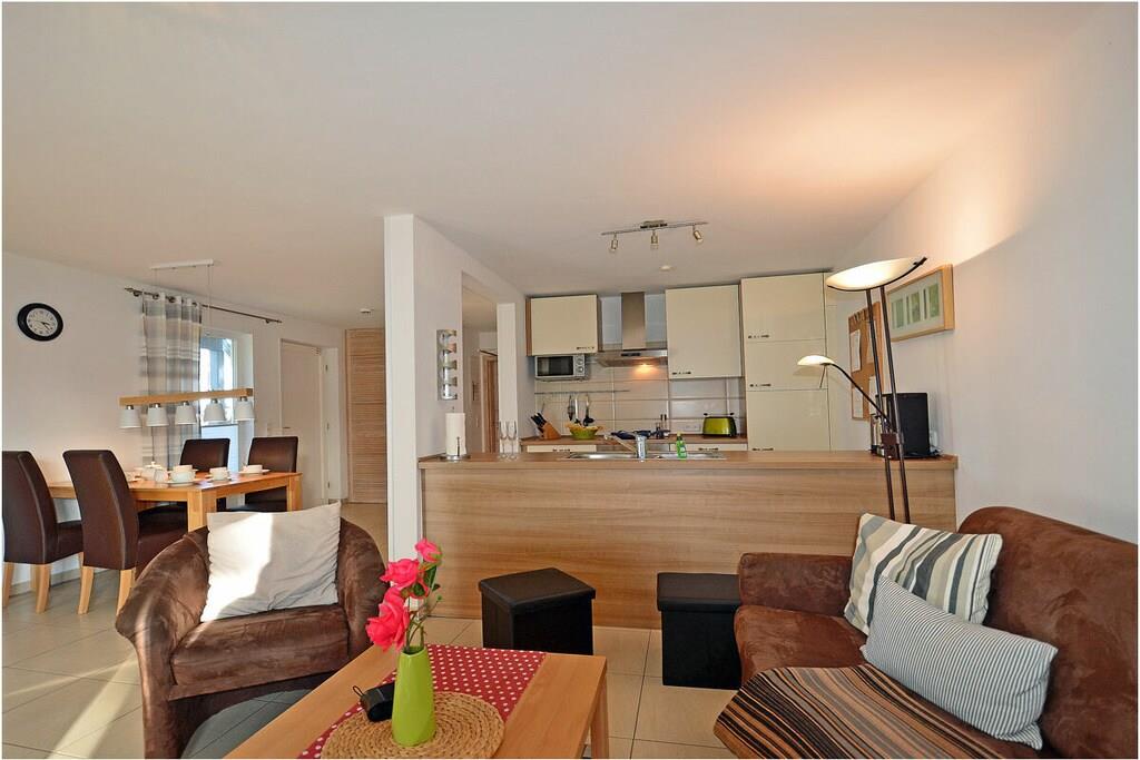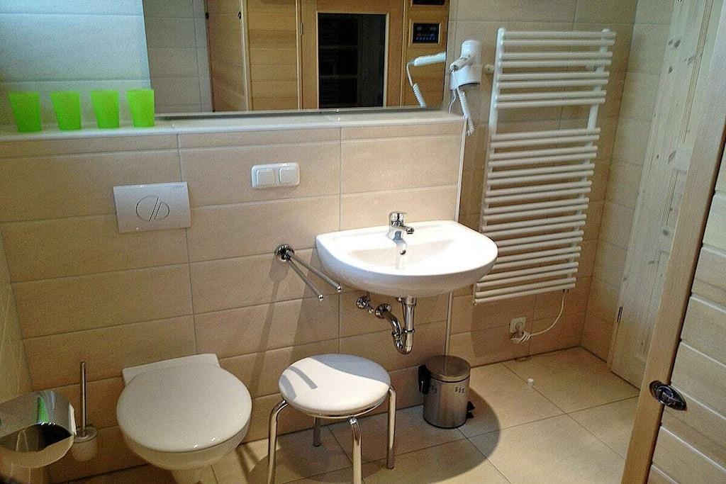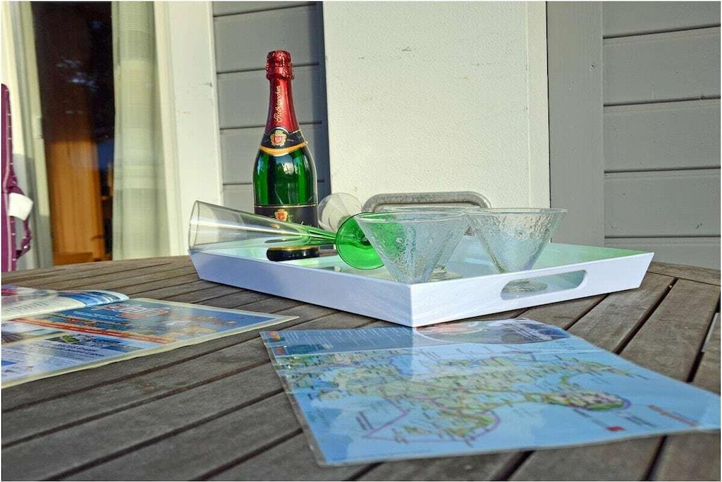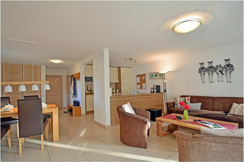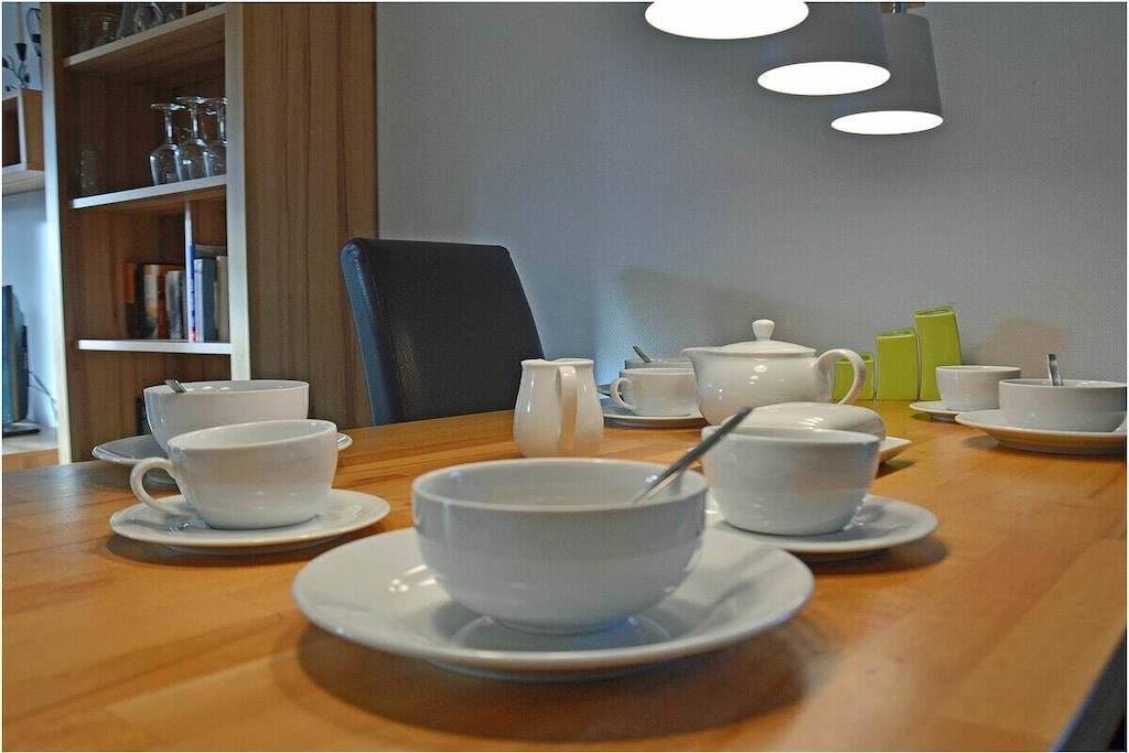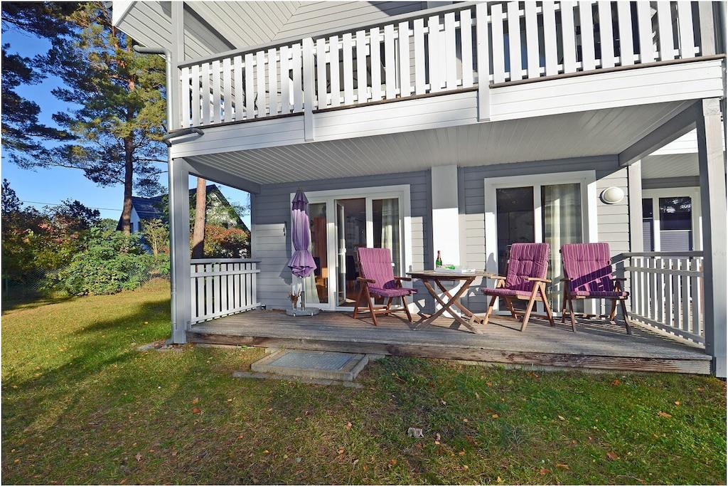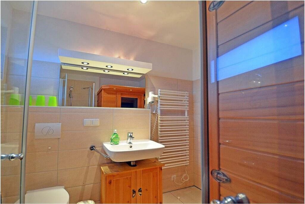 Ground floor: Living-dining area with comfortable pull-out sofa bed that offers sleeping space for 2 people (160×200), fireplace, dining table, TV/satellite (flat screen) with Bluray player, books and board games for cozy evenings are available, radio/CD player, open fully equipped fitted kitchen with 4-burner stove, oven, washing machine, refrigerator with small freezer compartment, microwave, dishwasher and various electrical appliances, bathroom with floor-level shower and toilet, infrared sauna (up to 60 °C), hairdryer and cosmetic mirror available, bedroom with double bed (2 single mattresses each 90×200), wardrobe and TV/satellite (flat screen) Outside area: Terrace with patio furniture for 4 people and parasol