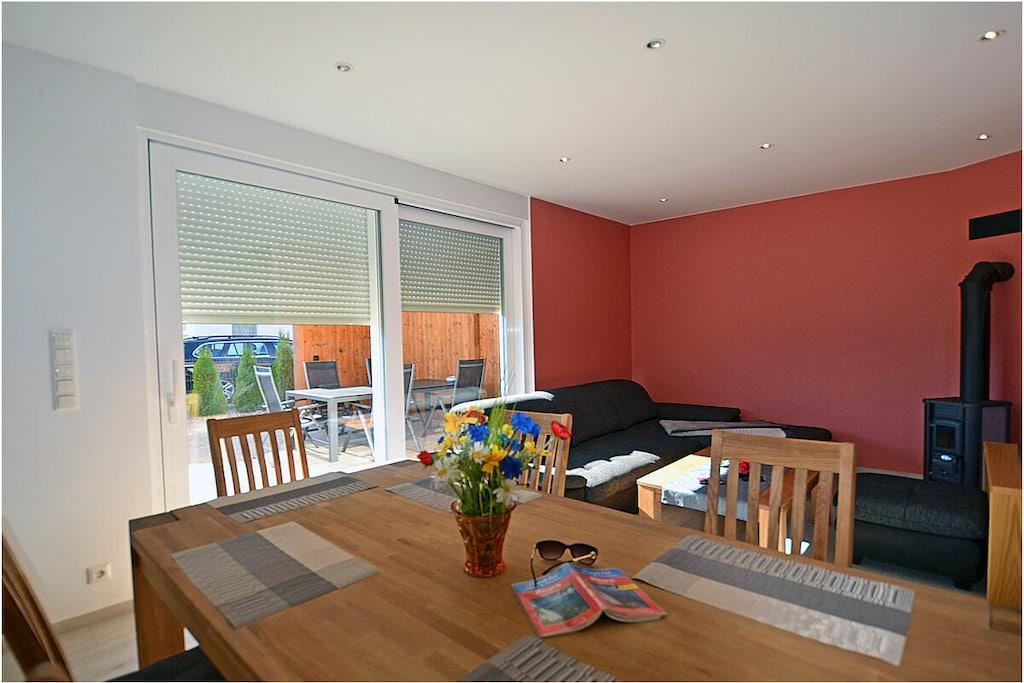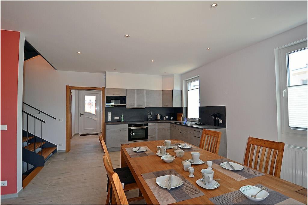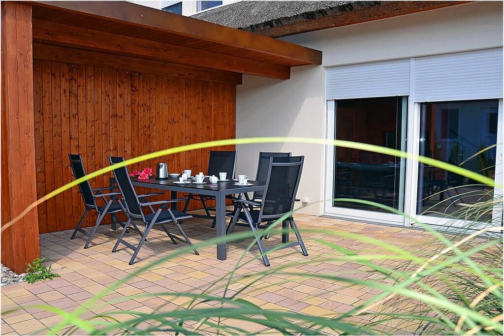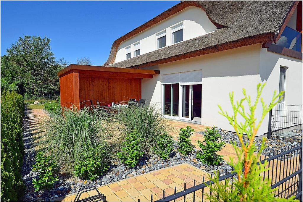 Erdgeschoss: modern und elegant eingerichteter Wohnbereich mit gemütlicher Couchlandschaft und Sessel, TV Sat/Kabel (Flatscreen), Radio, Internet-WLAN, Gesellschaftsspiele, komplett ausgestattete hochwertige Einbauküche, großer Esstisch für 5 Personen, 4-Plattenherd (Induktionsherd), Backofen, Kühlschrank mit einem kleinem Gefrierfach, Geschirrspüler, Mikrowelle und diversen Elektrogeräten, 1. Schlafzimmer mit einem Einzelbett (90 x 200) mit Kleiderschrank und Schreibtisch, 1. großes Bad mit ebenerdiger Dusche, Badewanne, WC und Föhn Obergeschoss: 2. Schlafzimmer mit Zugang zum Balkon, Doppelbett (2 einzelne Matratzen je 80 x 200), Kleiderschrank und Schreibtisch, 3. Schlafzimmer mit Zugang zum Balkon, 2 Einzelbett (90 x 200), Kleiderschrank und Schreibtisch, 2. Badezimmer mit ebenerdiger Dusche, WC und Föhn Souterrain: Waschmaschine, Bügelbrett, Bügeleisen, Wäscheständer und Billardtisch Außenbereich: gepflegtes Grundstück, Terrasse mit bequemen Gartenmöbeln (5 Gartenstühle), Grillmöglichkeit besteht (Grill vorhanden), verschließbare Fahrradabstellmöglichkeit im Garten vorhanden Zeit für Erholung! – Genießen Sie traumhafte Urlaubstage – Erstvermietung 01.07.2021 Das schöne neuerbaute Reetgedeckte Doppelhaus „Kliffrand“ ist modern und mit viel Liebe zum Detail eingerichtet. Das gepflegte Grundstück mit Liegewiese ist komplett umzäunt und lädt zum Entspannen ein. Internet (WLAN) steht Ihnen kostenfrei zur Verfügung. Wohnzimmer, Küche und die Bäder haben Fußbodenheizung. Alle anderen Räume haben Heizkörper. Die Fenster sind mit elektrischen Außenjalousien und teilweise mit Insektenschutz ausgestattet. Das Ferienhaus „Kliffrand“ ist ein Nichtraucherquartier. Für Spiel und Spaß steht Ihnen ein Billardtisch zur Verfügung. Am Objekt befinden sich 2 PKW-Stellplätze und verschließbare Fahrradabstellmöglichkeiten im Garten. Einkaufsmöglichkeiten, Bäcker, Restaurants und ein Getränkemarkt finden Sie in naher Umgebung. Optimale Rad- und Wandermöglichkeiten um die schöne Insel zu erkunden, runden das Angebot ab. Haustiere sind nicht erwünscht.