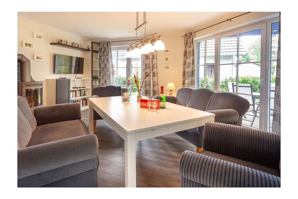 Erholungsort Glowe, über 2 Etagen, ruhige Lage, ca. 200 m zum 8 km langen Sandstrand Schaabe, ca. 800 m zum Bodden Erdgeschoss: großzügiger Wohn- Essbereich mit Fußbodenheizung und Kamin, gemütliche Couchlandschaft, TV/ Sat (Flatscreen), Blu-ray Player, Radio/CD, offene komplett ausgestattete moderne Einbauküche mit 4- Plattenherd (Ceranfeld), Backofen, Kühlschrank mit großem Gefrierfach, Mikrowelle, Geschirrspüler und diversen Elektrogeräten, 1. Bad mit Dusche und WC, Waschtisch, Kosmetikspiegel und Fön, 3. Schlafzimmer mit Tagesbettgestell (ausziehbar 160x200) und Kleiderschrank, Obergeschoss: 1.Schlafzimmer mit Doppelbett (180x200), TV (Flachbild) , Sitzecke mit Tisch und 2 Sesseln, großer Kleiderschrank, 2. Schlafzimmer mit zwei Einzelbetten, Kommode, 1 Tisch mit 2 Sitzsäcken, Insektenschutzgitter in den Schlafräumen vorhanden, 2. Bad mit Badewanne, Dusche mit Sitzplatz und WC, 2 Waschtische, Kosmetikspiegel und Fön, 2 Terrassen mit jeweils 6 Gartenstühlen, 2 Gartenliegen und 1 großer Sonnenschirm, Grill vorhanden Einen perfekten Urlaubstraum erleben - unmittelbar am Ostseesandstrand Grundstück ca. 505 qm, Nichtraucher, kostenloses W-Lan, Waschmaschine und Trockner vorhanden, Bügelbrett und Bügeleisen, Wäscheständer, Fahrradabstellmöglichkeit (Gartenhaus), Fahrradständer, 2 PKW- Stellplätze am Haus, Kinderspielplatz, Einkaufsmöglichkeiten, Bäcker und Restaurant in unmittelbarer Nähe, optimale Rad- und Wandermöglichkeiten
