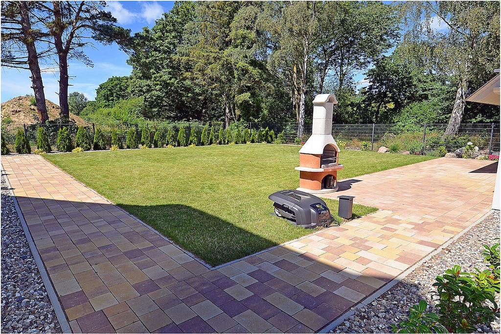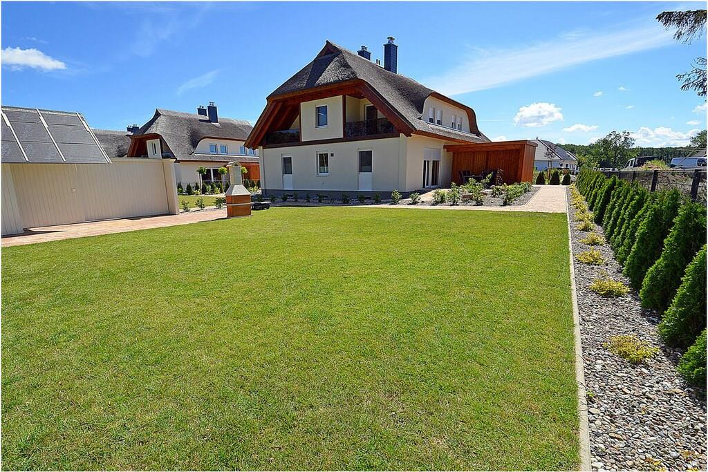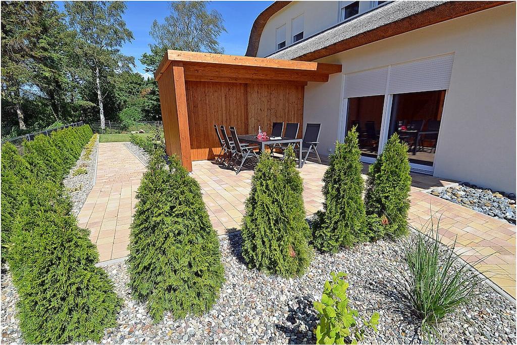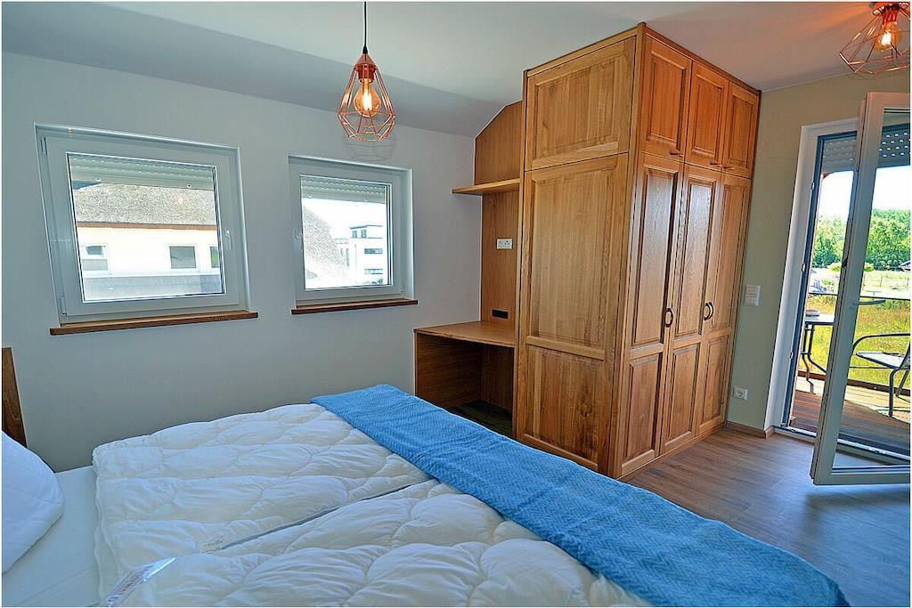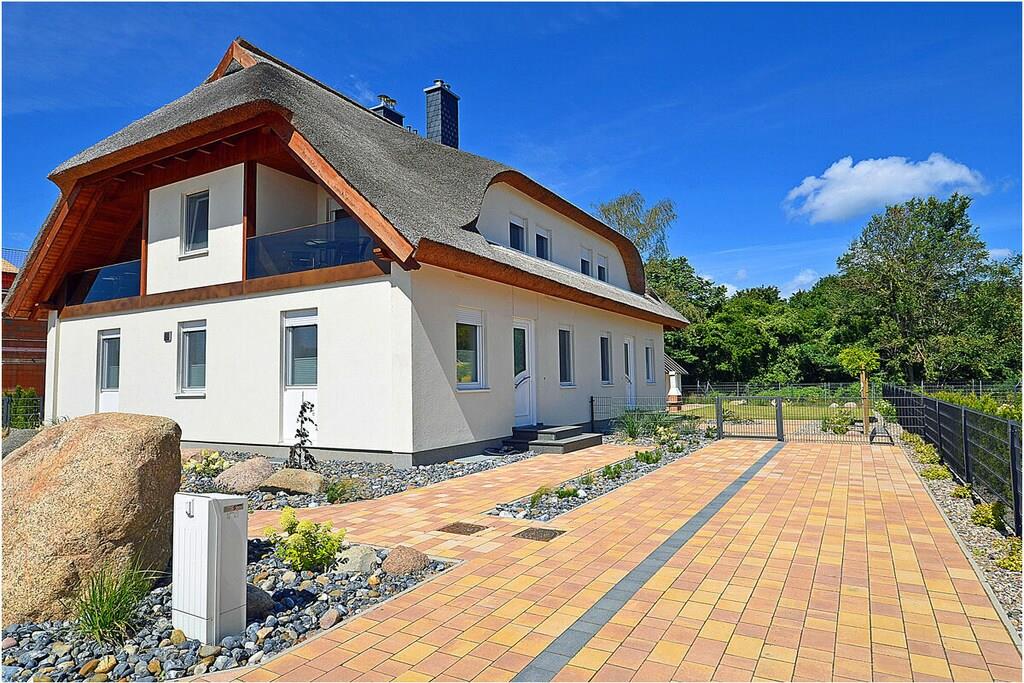 Erdgeschoss: modern und elegant eingerichteter Wohnbereich mit gemütlicher Couchlandschaft und Sessel, der Kamin spendet Wohlfühlatmosphäre an kalten Tagen, TV Sat/Kabel (Flatscreen), Radio, komplett ausgestattete hochwertige Einbauküche mit Kochinsel, großer Esstisch für 6 Personen, 4-Plattenherd (Induktionsherd), Backofen, Kühlschrank mit einem kleinem Gefrierfach, Geschirrspüler, Mikrowelle und diversen Elektrogeräten, 1. Schlafzimmer mit einem Einzelbett (100 x 200) mit Kleiderschrank und Schreibtisch, 1. großes Bad mit ebenerdiger Dusche, Badewanne, WC und Föhn Obergeschoss: 2. Schlafzimmer mit Zugang zum Balkon, Doppelbett (zwei getrennte Matratzen je 80 x 200) und Kleiderschrank mit Schreibtisch, 3. Schlafzimmer mit Zugang zum Balkon, Doppelbett (zwei getrennte Matratzen je 80 x 200), ein Einzelbett (90 x 200 ) und Kleiderschrank mit Schreibtisch, 2. Badezimmer mit ebenerdiger Dusche, WC und Föhn, Souterrain: Waschmaschine, Bügelbrett und Bügeleisen, Wäscheständer und Billardtisch Außenbereich: gepflegtes Grundstück, Terrasse mit bequemen Gartenmöbeln (6 Gartenstühle), Grillmöglichkeit besteht (Grill vorhanden), Fahrradständer Zeit für Erholung! – Genießen Sie traumhafte Urlaubstage – Erstvermietung seit dem 01.08.2020 Das schöne neuerbaute Reetgedeckte Doppelhaus „Kliffrand“ ist modern und mit viel Liebe zum Detail eingerichtet. Das gepflegte Grundstück mit Liegewiese ist komplett umzäunt und lädt zum Entspannen ein. Wohnzimmer, Küche und die Bäder haben Fußbodenheizung. Alle anderen Räume haben Heizkörper. Die Fenster sind mit elektrischen Außenjalousien und teilweise mit Insektenschutz ausgestattet. Das Ferienhaus „Kliffrand“ ist ein Nichtraucherquartier. Für Spiel und Spaß steht Ihnen ein Billardtisch zur Verfügung. Am Objekt befinden sich 2 PKW-Stellplätze und eine Abstellmöglichkeiten für Fahrräder. Haustiere sind nicht erwünscht.
