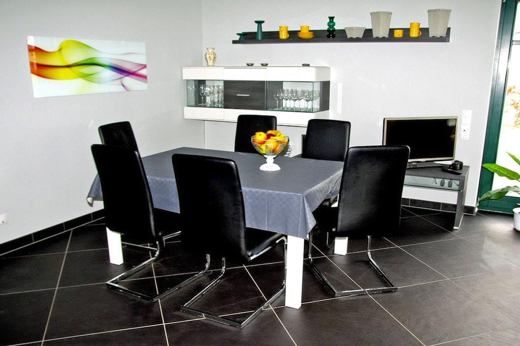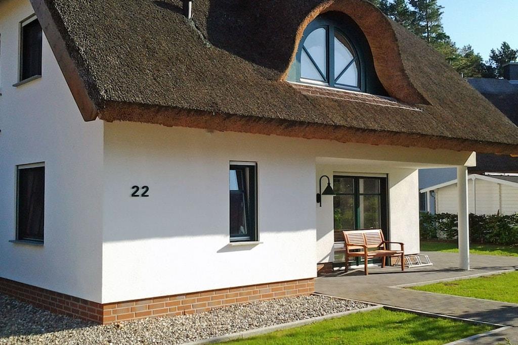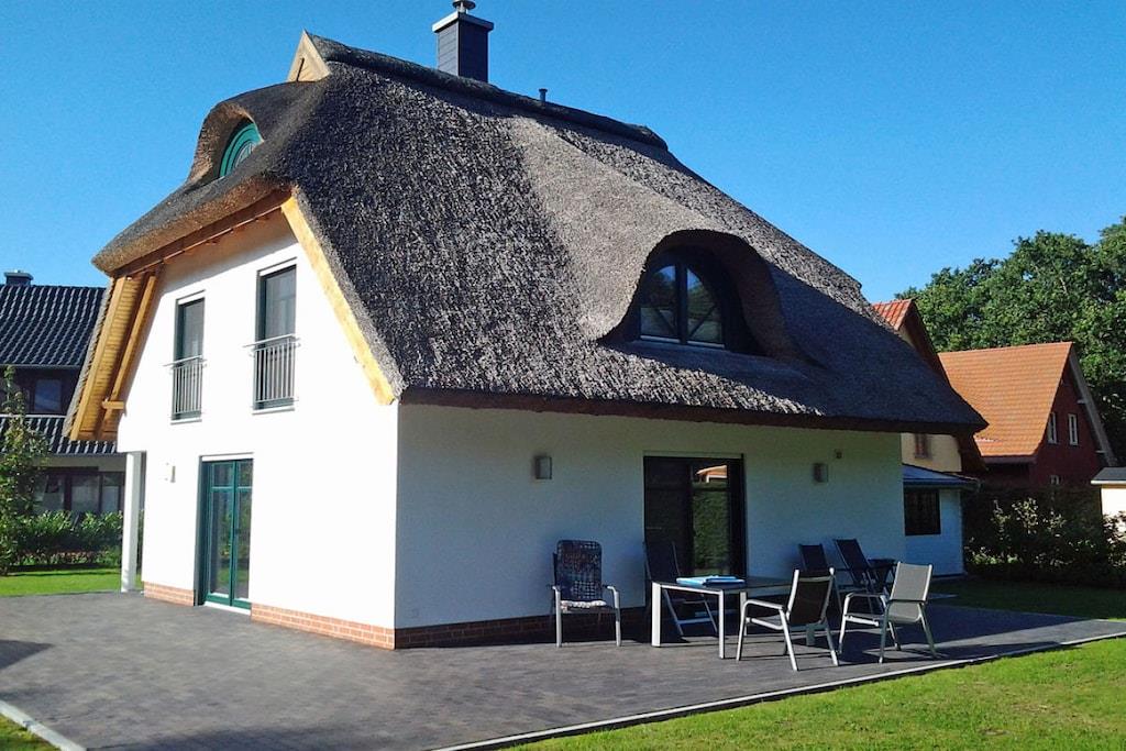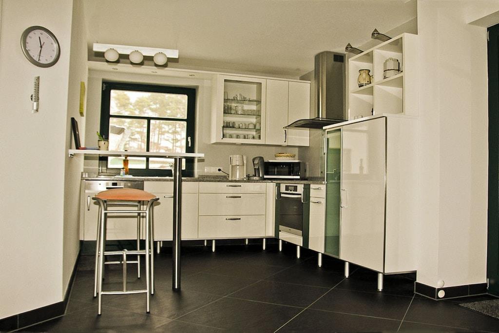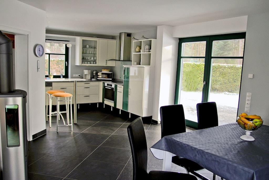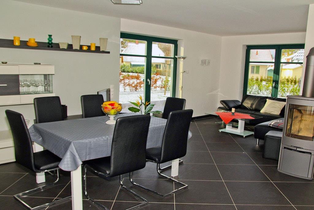 Erholungsort Glowe, über 3 Etagen, zentrale ruhige Lage, ca. 160 m zum feinsandigen Sandstrand (Ostsee), ca. 1 km zum Bodden Erdgeschoss: großzügiger Wohn- Essbereich mit Fußbodenheizung und Kaminofen, gemütliche Couchlandschaft, TV/ Sat (Flatscreen), Hifi-Anlage, WLAN vorhanden, offene komplett ausgestattete moderne Einbauküche mit großzügiger Sitzgruppe, Granit-Arbeitsplatte, 4- Plattenherd (Ceranfeld), Backofen, Kühlschrank mit kleinem Gefrierfach, Mikrowelle, Geschirrspüler und diversen Elektrogeräten, Bartresen mit 2 Hocker, Bad mit Dusche/ WC und Waschtisch, Wirtschaftsraum mit Waschmaschine und Trockner, Obergeschoss: 1. Schlafzimmer mit Doppelbett (1 Matratze 180x200), Kleiderschrank, Sitzgarnitur und TV (Flatscreen), 2. Schlafzimmer mit Doppelbett (1 Matratze 160x200) ebenfalls mit TV und Kleiderschrank, 3. Schlafzimmer mit Couch (Schlaffunktion) und Kleiderschrank, hochwertiges Bad mit Glas-Doppel-Waschtisch inkl. Beleuchtung, Badewanne, bodenebene Groß-Raum-Dusche und WC, Kosmetikplatz und Haartrockner vorhanden Dachgeschoss: hier kann man schlafen, spielen und ggf. auch arbeiten, Schreibtisch vorhanden Außenbereich: 2 Terrassen mit gemütlichen Gartenstühlen und 2 Liegestühle, Grillplatz Herzlich Willkommen im Ferienhaus-Rebecka- in der Dünenresidenz Glowe" ruhiges Waldgrundstück mit zwei durchgehenden Terrassen, Nichtraucher, Einzelraumregelung für Fußbodenheizung im gesamten Haus, Wirtschaftraum mit Waschmaschine und Trockner ohne Gebühr, Rollläden, Gartenhaus zum Unterstellen von Fahrrädern (2 Fahrräder zur Nutzung vorhanden), Liegewiese- Rasenfläche lädt zum Spielen und Erholen ein, 2 PKW- Stellplätze am Haus, Straßenunterführung zum Strand, Einkaufsmöglichkeiten, Kinderspielplatz, Bäcker und Restaurant in unmittelbarer Nähe, optimale Rad- und Wandermöglichkeiten, Haustiere sind nicht erwünscht!