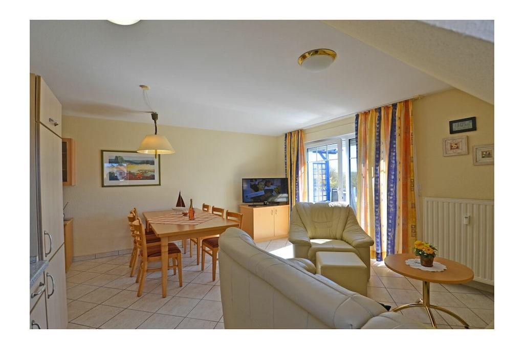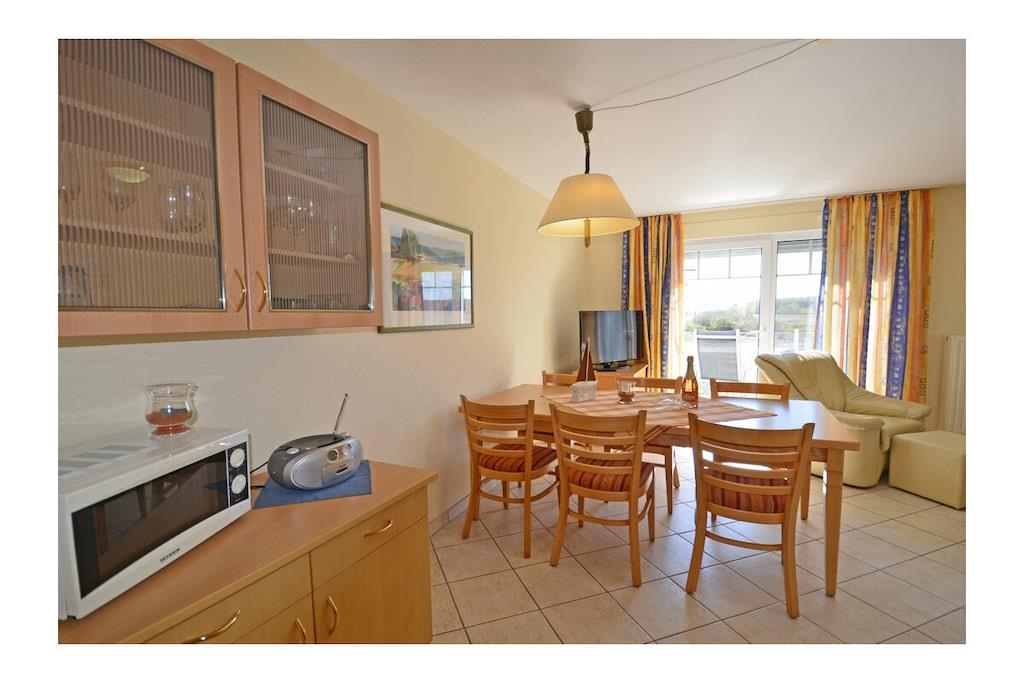 Die Ferienwohnung „Lotte“ bietet Ihnen auf ca. 78m² alles was das Herz begehrt. Die offene Wohnküche ist voll ausgestattet und grenzt an den Wohnbereich mit einer Essecke an. Drei separate Schlafzimmer stehen Ihnen zur Verfügung. Auf dem Südbalkon können Sie an sonnigen Tagen die Landschaft und die frische Seeluft genießen. Gemütlicher Wohn- & Essbereich mit bequemer Schlafcouch, Internet (WLAN), TV Digital & TV SAT/Kabel, Radio, die offene Wohnküche bietet Backofen, Kühlschrank mit kleinem Gefrierfach, Geschirrspüler, Mikrowelle und diverse Elektrogeräte, 1. Schlafzimmer mit Doppelbett (180 x 200) und Kleiderschrank, 2. & 3. Schlafzimmer mit je zwei Einzelbetten (90 x 200), Badezimmer mit Dusche und WC, Föhn Besonderes: An den Boddenwiesen- ruhig, idyllisch und familienfreundlich Die Ferienwohnung verfügt über einen Balkon. Das gemeinschaftlich genutzte Grundstück ist umzäunt. Sehr kinderfreundliche Einrichtung mit Kinderspielen, der Tischkicker bietet Spaß für Groß und Klein. Kinderbett, Kinderhochstuhl und Treppenschutzgitter sind vorhanden. Waschmaschine vorhanden (ohne Gebühr). Kostenfreies W-LAN ist ebenfalls verfügbar. Das Quartier bietet 2 PKW-Stellplätze und einen Fahrradständer (offen). Ein Schuppen bietet Platz für maximal 2 Fahrräder oder ein Kinderwagen. Ein Reiterhof ist in unmittelbarer Nähe. Der Spielplatz ist ca. 8 min Fußweg entfernt. Einkaufsmöglichkeiten, Bäcker und Restaurant befinden sich in unmittelbarer Nähe, optimale Anbindung an Radwanderwege. Genießen Sie vom Balkon den Blick über die Boddenwiesen bis hin zum Großen Jasmunder Bodden. Als Highlight des Abends (gegen 22.30 Uhr) können Sie das Feuerwerk der Störtebeker Festspiele bestaunen. Haustiere sind nicht erwünscht.