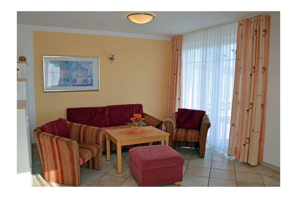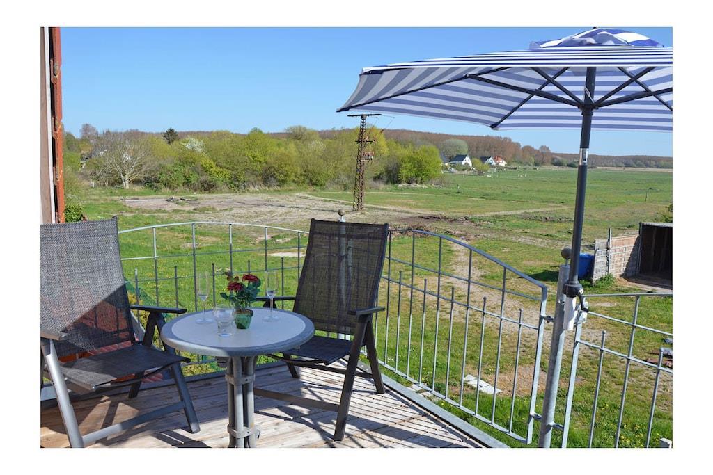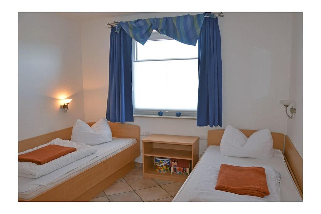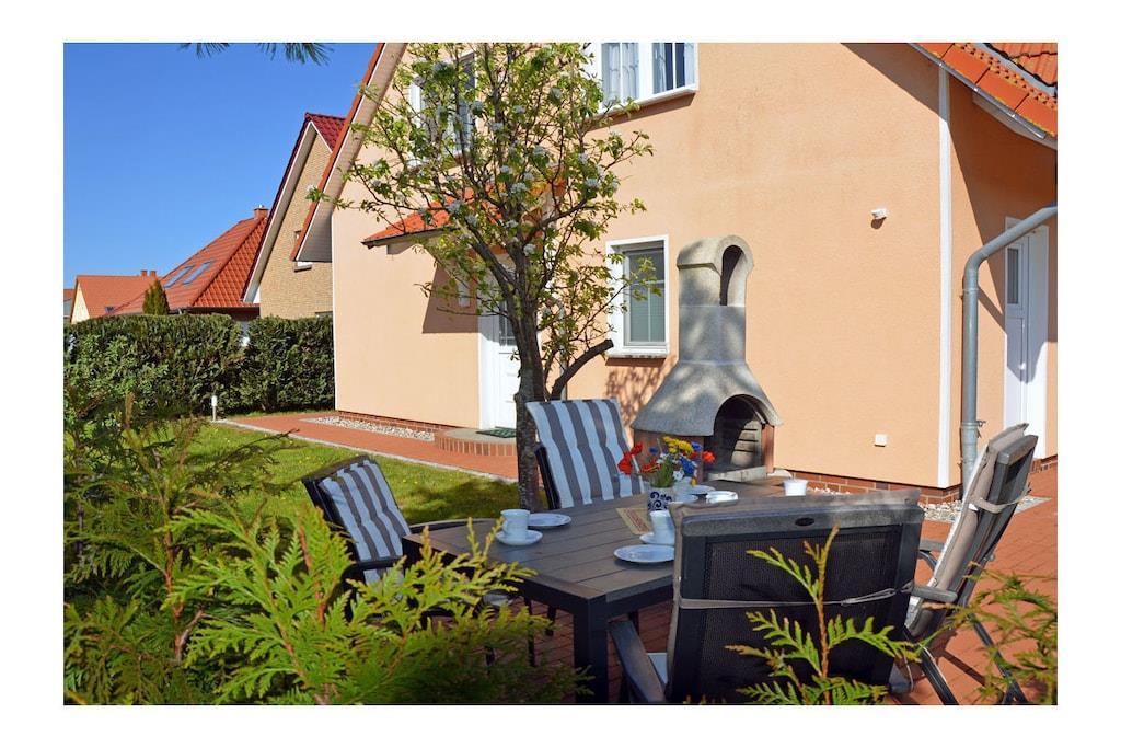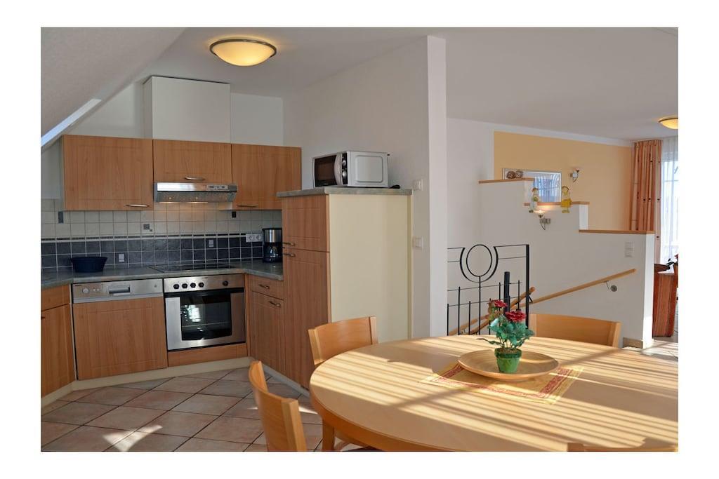 Erholungsort Glowe, über 2 Etagen, Haushälfte, sehr ruhige Lage, ca. 400 m zum Sandstrand (Ostsee), ca. 1 km zum Bodden Obere Etage: Wohn- Essbereich mit Sitzecke und gemütlicher Couch, TV/ Sat (Flatscreen) mit DVD-Player, Blu-ray Player, Radio/ CD, Fußbodenheizung im gesamtem Haus, offene komplett ausgestattete Einbauküche mit 4- Plattenherd (Ceranfeld), Backofen, Kühlschrank mit kleinem Gefrierfach, Mikrowelle, Geschirrspüler und diversen Elektrogeräten Parterre: Bad mit Dusche/ WC, 1. Schlafzimmer mit Doppelbett und Kleiderschrank, 2. Schlafzimmer mit 2 Einzelbetten und Kleiderschrank, Balkon mit Gartenmöbeln und Sonnenschirm An den Boddenwiesen- ruhig, idyllisch und familienfreundlich\" komplett umzäuntes Grundstück ca. 685 qm, Liegewiese mit Kinderspielplatz, Terrasse mit Gartenmöbel, Grill vorhanden, Waschmaschine ohne Gebühr, Kinderhochstuhl und Kinderreisebett vorhanden, Kinderspielplatz, kostenfrei Internet (WLAN & LAN), PKW- Stellplatz am Haus, abschließbare Fahrradabstellmöglichkeit, Einkaufsmöglichkeiten, Bäcker und Restaurant in unmittelbarer Nähe, optimale Rad- und Wandermöglichkeiten, Nichtraucherwohnung, Haustiere nach Absprache (Gebühr 8 Euro pro Haustier/ pro Tag) Genießen Sie vom Balkon den Blick über die Boddenwiesen bis hin zum Großen Jasmunder Bodden. Als Highlight des Abends können Sie das Feuerwerk der Störtebeker Festspiele bestaunen. Gehört zu Objekt Nummer 163873 und kann zusammen gemietet werden.
