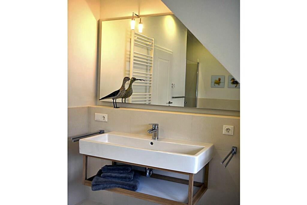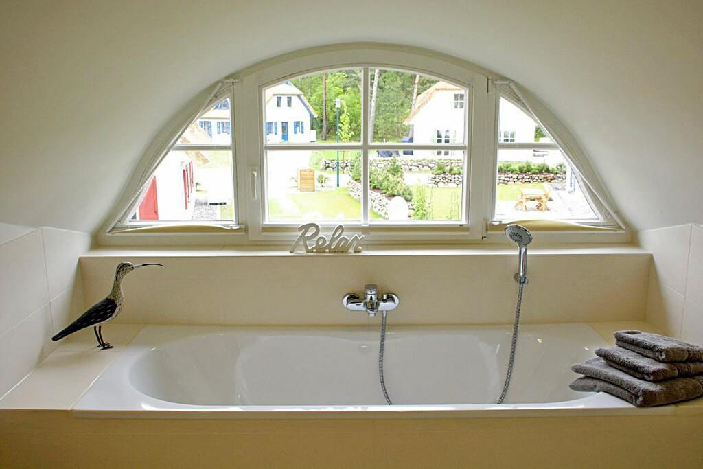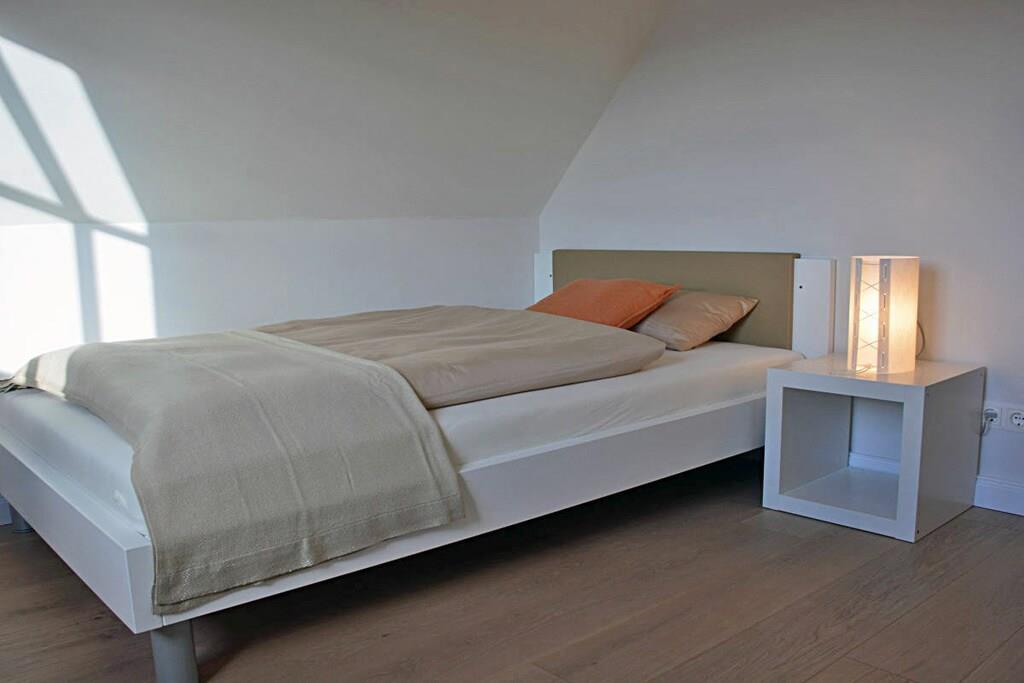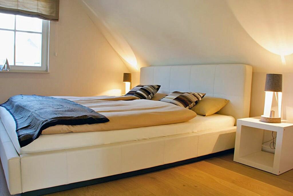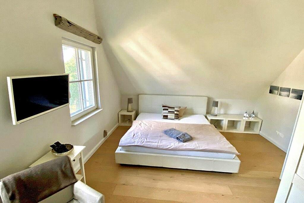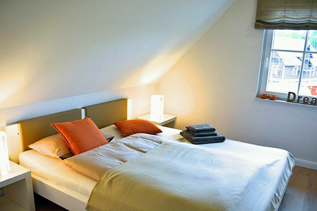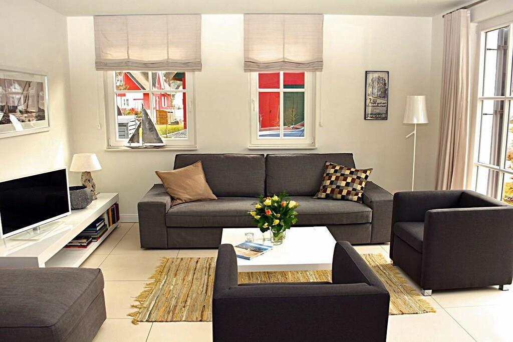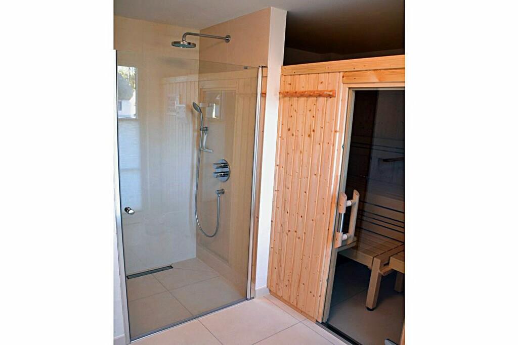 Erdgeschoss Wohn-Essbereich: großzügiger Wohnbereich mit Kamin und Fußbodenheizung, gemütliche Couchlandschaft und Sessel, TV-Sat (Flatscreen), Musikanlage und Blu-ray Player vorhanden, Gesellschaftsspiele und Bücher für gemütliche Abende; offene komplett ausgestattete hochwertige Bulthaup-Einbauküche mit 4-Plattenherd (Induktion), Backofen, Kühlschrank mit kleinem Gefrierfach, Geschirrspüler und diversen Elektrogeräten; Saunabereich: mit ebenerdiger Dusche, separates WC mit Waschbecken und Spiegel; Hauswirtschaftsraum: mit Waschmaschine, Wäscheständer und Staubsauger, Bügeleisen und Bügelbrett vorhanden Flur mit Garderobe und Spiegel, Fliegenschutzgitter in allen Räumen (außer im oberen Bad) Obergeschoss 1. Schlafzimmer: mit einem Doppelbett (getrennte Matratzen je 90 x 200), Kleiderschrank, Kommode und TV-Sat (Flatscreen) 2. Schlafzimmer: mit einem Doppelbett (getrennte Matratzen je 80 x 200) und Kleiderschrank 3. Schlafzimmer: mit einem Doppelbett (durchgehende Matratze 160 x 200) und Kleiderschrank großes Badezimmer: mit Badewanne, Dusche und WC, Föhn, Kosmetikspiegel und Handtuchwärmer Außenbereich Terrasse: mit Gartenmöbeln, 2 Sonnenliegen und Sonnenschirm, Grillmöglichkeit besteht (Kohlegrill und Gasgrill vorhanden (Gasflaschen sind im Baumarkt Glowe käuflich zu erwerben)) Gartenhaus: abschließbare Fahrradabstellmöglichkeit vorhanden