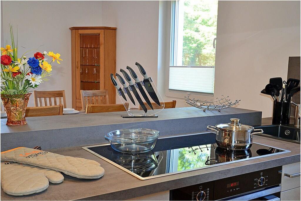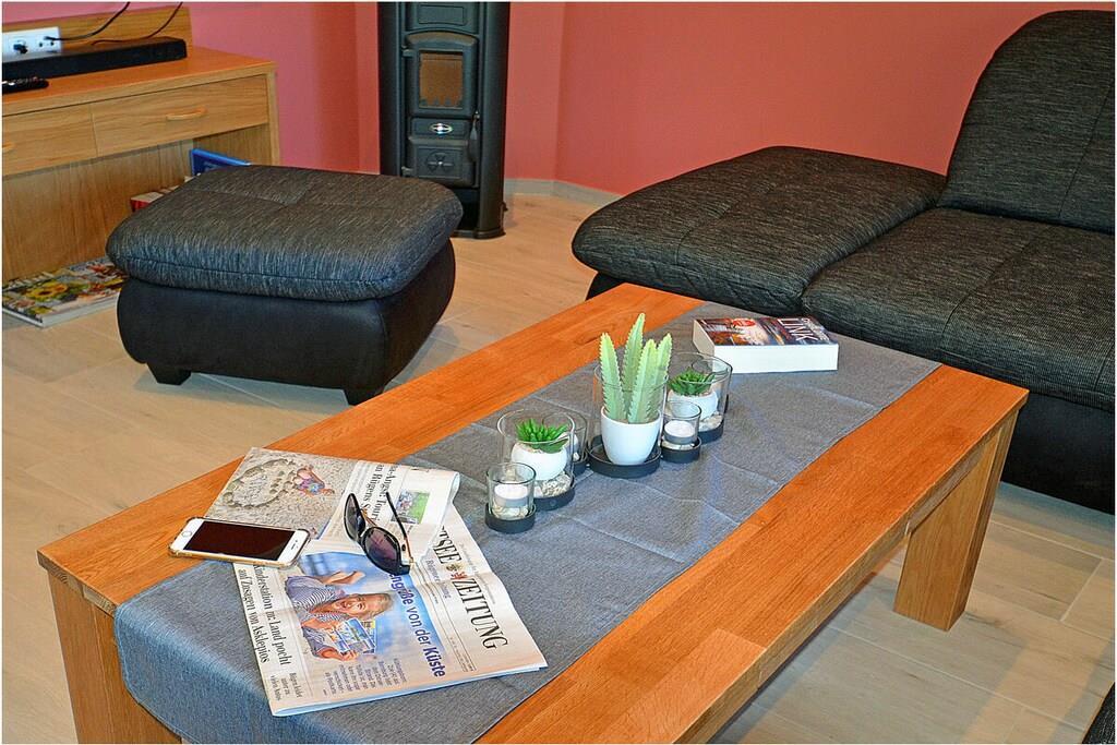 Erdgeschoss: modern und elegant eingerichteter Wohnbereich mit gemütlicher Couchlandschaft und Sessel, der Kamin spendet Wohlfühlatmosphäre an kalten Tagen, TV Sat/Kabel (Flatscreen), Radio, komplett ausgestattete hochwertige Einbauküche mit Kochinsel, großer Esstisch für 6 Personen, 4-Plattenherd (Induktionsherd), Backofen, Kühlschrank mit einem kleinem Gefrierfach, Geschirrspüler, Mikrowelle und diversen Elektrogeräten, 1. Schlafzimmer mit einem Einzelbett (100 x 200) mit Kleiderschrank und Schreibtisch, 1. großes Bad mit ebenerdiger Dusche, Badewanne, WC und Föhn Obergeschoss: 2. Schlafzimmer mit Zugang zum Balkon, Doppelbett (zwei getrennte Matratzen je 80 x 200) und Kleiderschrank mit Schreibtisch, 3. Schlafzimmer mit Zugang zum Balkon, Doppelbett (zwei getrennte Matratzen je 80 x 200), ein Einzelbett (90 x 200 ) und Kleiderschrank mit Schreibtisch, 2. Badezimmer mit ebenerdiger Dusche, WC und Föhn, Souterrain: Waschmaschine, Bügelbrett und Bügeleisen, Wäscheständer Außenbereich: gepflegtes Grundstück, Terrasse mit bequemen Gartenmöbeln (6 Gartenstühle), Grillmöglichkeit besteht (Grill vorhanden), Fahrradständer Zeit für Erholung! – Genießen Sie traumhafte Urlaubstage – Erstvermietung seit dem 01.08.2020 Das schöne neuerbaute Reetgedeckte Doppelhaus „Kliffrand“ ist modern und mit viel Liebe zum Detail eingerichtet. Das gepflegte Grundstück mit Liegewiese ist komplett umzäunt und lädt zum Entspannen ein. Internet (WLAN) steht Ihnen kostenfrei zur Verfügung. Wohnzimmer, Küche und die Bäder haben Fußbodenheizung. Alle anderen Räume haben Heizkörper. Die Fenster sind mit elektrischen Außenjalousien und teilweise mit Insektenschutz ausgestattet. Das Ferienhaus „Kliffrand“ ist ein Nichtraucherquartier. Am Objekt befinden sich 2 PKW-Stellplätze und eine Abstellmöglichkeiten für Fahrräder. Haustiere sind nicht erwünscht.