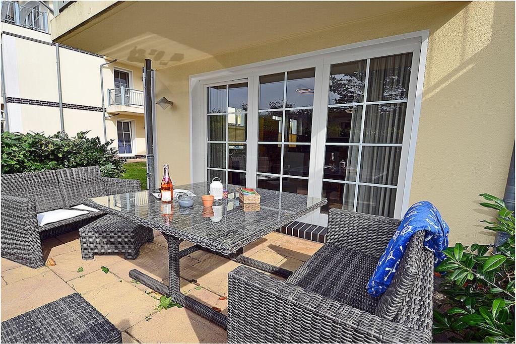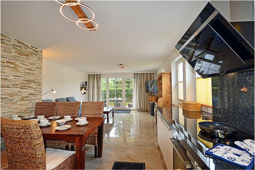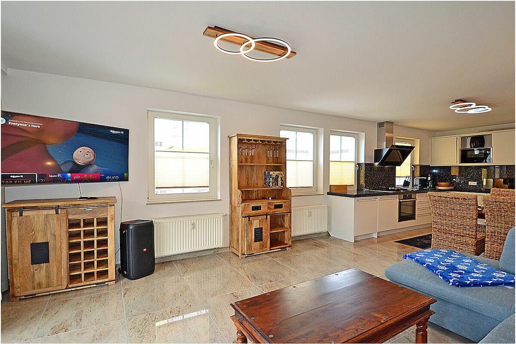 Erdgeschoss: moderner großzügiger Wohn- Essbereich, gemütliche Ausziehcouch mit Schlaffunktion, TV/ Sat (Smart-TV) und Bluray-Player vorhanden, HiFi-Anlage, Bluray´s/ DVD`s, kostenfreies Internet (WLAN), Bücher und Gesellschaftsspiele für gemütliche Abende, komplett ausgestattete Einbauküche mit hochwertigen Geräten, 5- Plattenherd (Induktionsherd), Backofen, Kühlschrank und Gefriertruhe, Geschirrspüler, Mikrowelle und diversen Elektrogeräten, großzügiges Bad mit Dusche und Badewanne, WC, Föhn, 1. Schlafzimmer mit Doppelbett (1 durchgehende Matratze 140×200) und Kleiderschrank, 2. Schlafzimmer mit Doppelbett (1 durchgehende Matratze 140x200) und Kleiderschrank, separater Abstellraum mit Waschtrockner, Staubsauger Terrasse mit Gartenmöbeln (6 Gartenstühle), Grillmöglichkeit besteht und ein Grill ist vorhanden Besonderes: Traumurlaub in der – Villa Böck 9 – direkt am Ostseestrand! Die Ferienwohnung ist liebevoll eingerichtet. Die voll ausgestattete Küche lässt keine Wünsche offen. Die Terrasse (Zugang vom Wohn- und Küchenbereich) lädt mit gemütlichen Sitzgelegenheiten zum Verweilen ein. Die Ferienwohnung Villa Böck ist ein Nichtraucherquartier. Waschtrockner steht Ihnen kostenfrei zur Verfügung. Der PKW-Stellplatz mit der Nr. 9 befindet sich direkt am Objekt. Abstellmöglichkeiten (Gemeinschaftskeller) für Fahrräder sind vorhanden. Einkaufsmöglichkeiten, Bäcker, Restaurant und einen Fahrradverleih sind in unmittelbarer Nähe. Der Hafen Glowe ist nur 3 min Fußweg von der Ferienwohnung entfernt. Optimale Rad- und Wandermöglichkeiten um die Insel zu erkunden, runden das Angebot ab. Bei uns ist ein mittelgroßer Hund willkommen! (Gebühr Euro 5,-/ pro Hund/ pro Nacht).