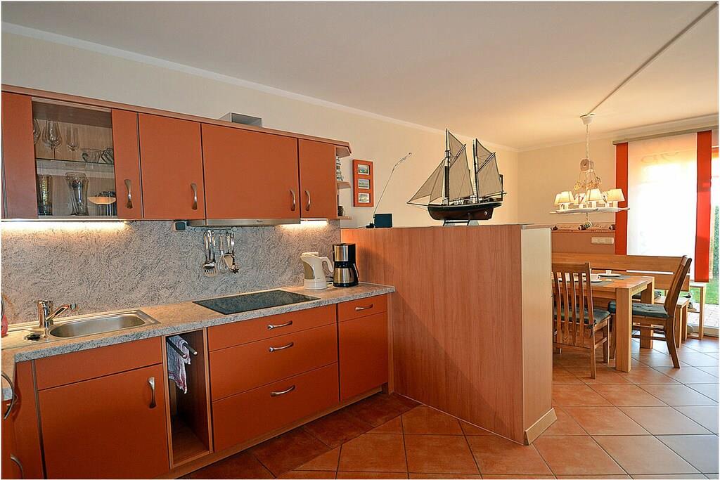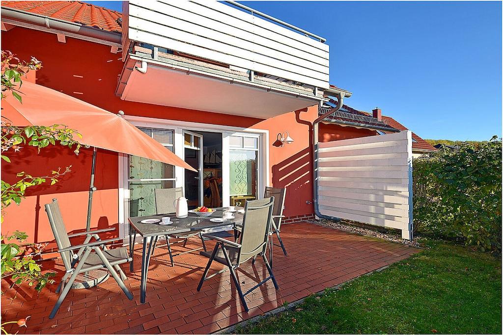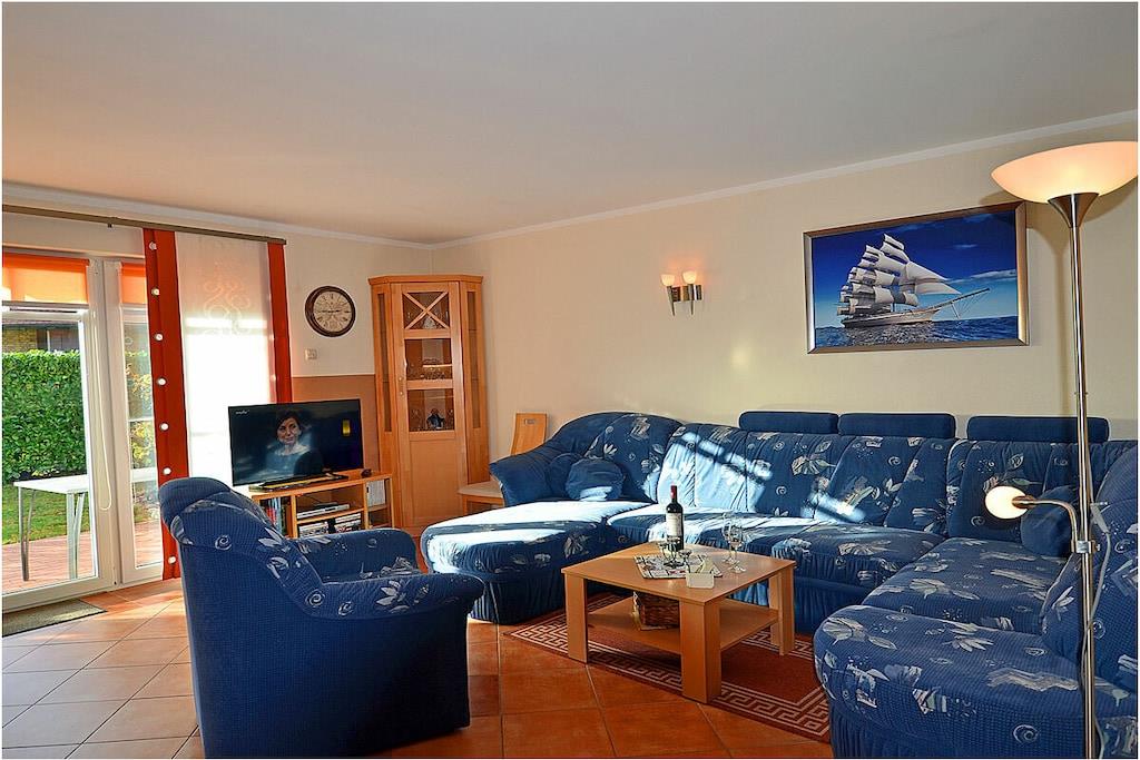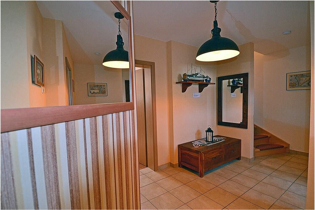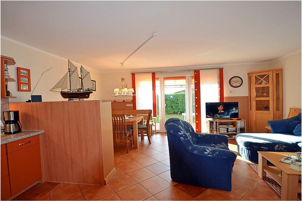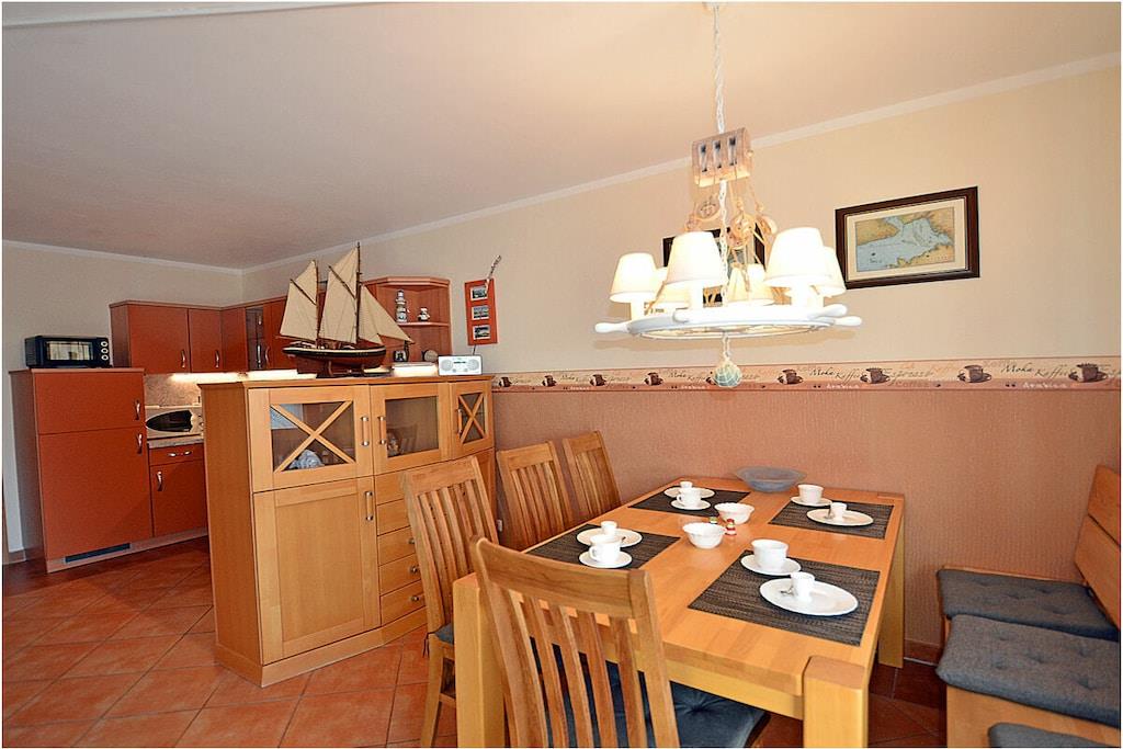 Erdgeschoss: großzügiger Wohn-, Essbereich mit Fußbodenheizung, gemütlicher Couchlandschaft und TV-Sat (Flatscreen), Musikanlage/CD-Player, DVD-Player, Blu-ray Player, Internet (WLAN), Gesellschaftsspiele und Bücher für gemütliche Abende, komplett ausgestattete moderne Einbauküche mit Esstisch, Ceranherd, Kühlschrank mit kleinem Gefrierfach, Geschirrspüler, Mikrowelle und diversen Elektrogeräten, großem Badezimmer mit Dusche/WC/Föhn. Obergeschoss: 2. Schlafzimmer mit je einem Doppelbett (getrennte Matratzen jeweils 90 x 200), Balkon und Kleiderschrank, 1. Kinderzimmer mit einem Einzelbett (90 x 200) und 1 Tandembett (90 x 2,00) (Einzelbett mit Ausziehfunktion (80 x 1,90)und Kleiderschrank, kleines Badezimmer mit Dusche und WC. Außenbereich: Terrasse mit gemütlichen Gartenmöbeln (6 Gartenstühle) und großem Sonnenschirm lädt zum Relaxen ein, Grillmöglichkeit besteht (Grill vorhanden), 1 PKW Stellplatz direkt am Objekt, Fahrradabstellmöglichkeiten (abschließbar) vorhanden.