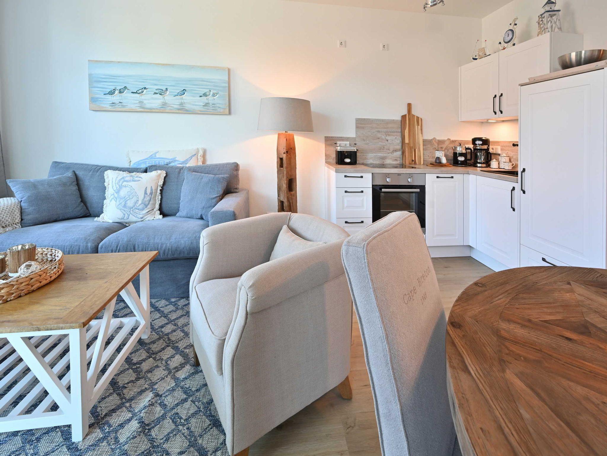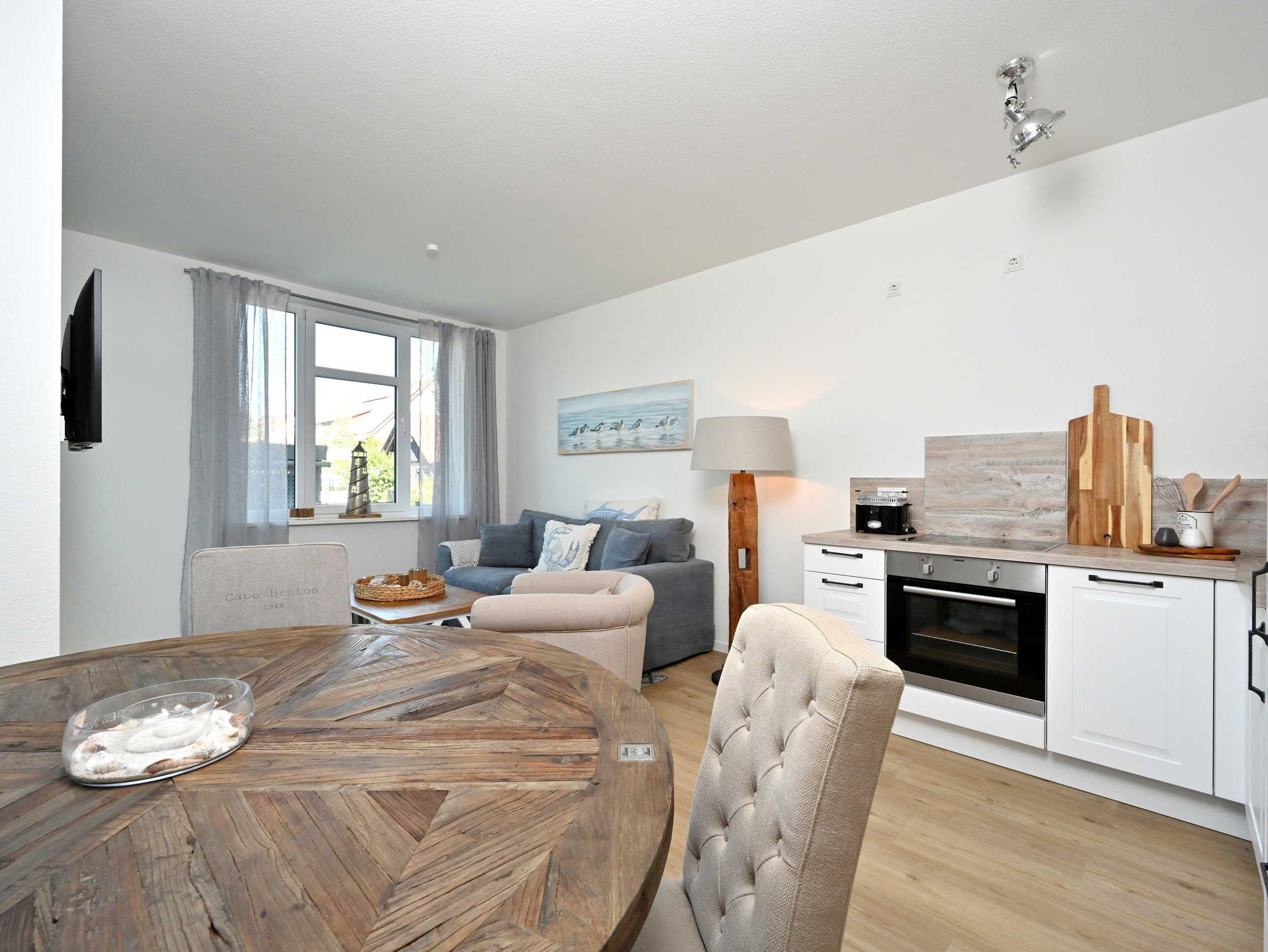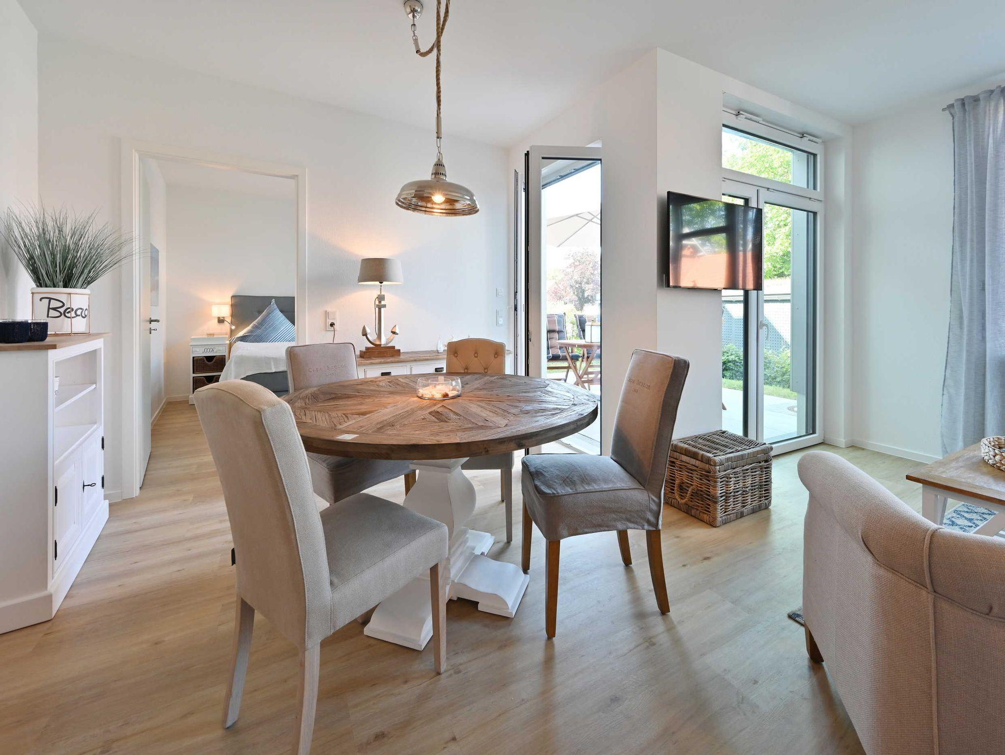 Der große Wohnbereich mit integrierter Küche und angeschlossener Terrasse lässt keine Wohnwünsche offen. Das Schlafzimmer verfügt über ein großes Doppelbett (durchgehende Matratze) sowie einen Kleiderschrank für Ihre Urlaubsgarderobe. Die Couch im Wohnbereich verfügt über eine Schlaffunktion.
