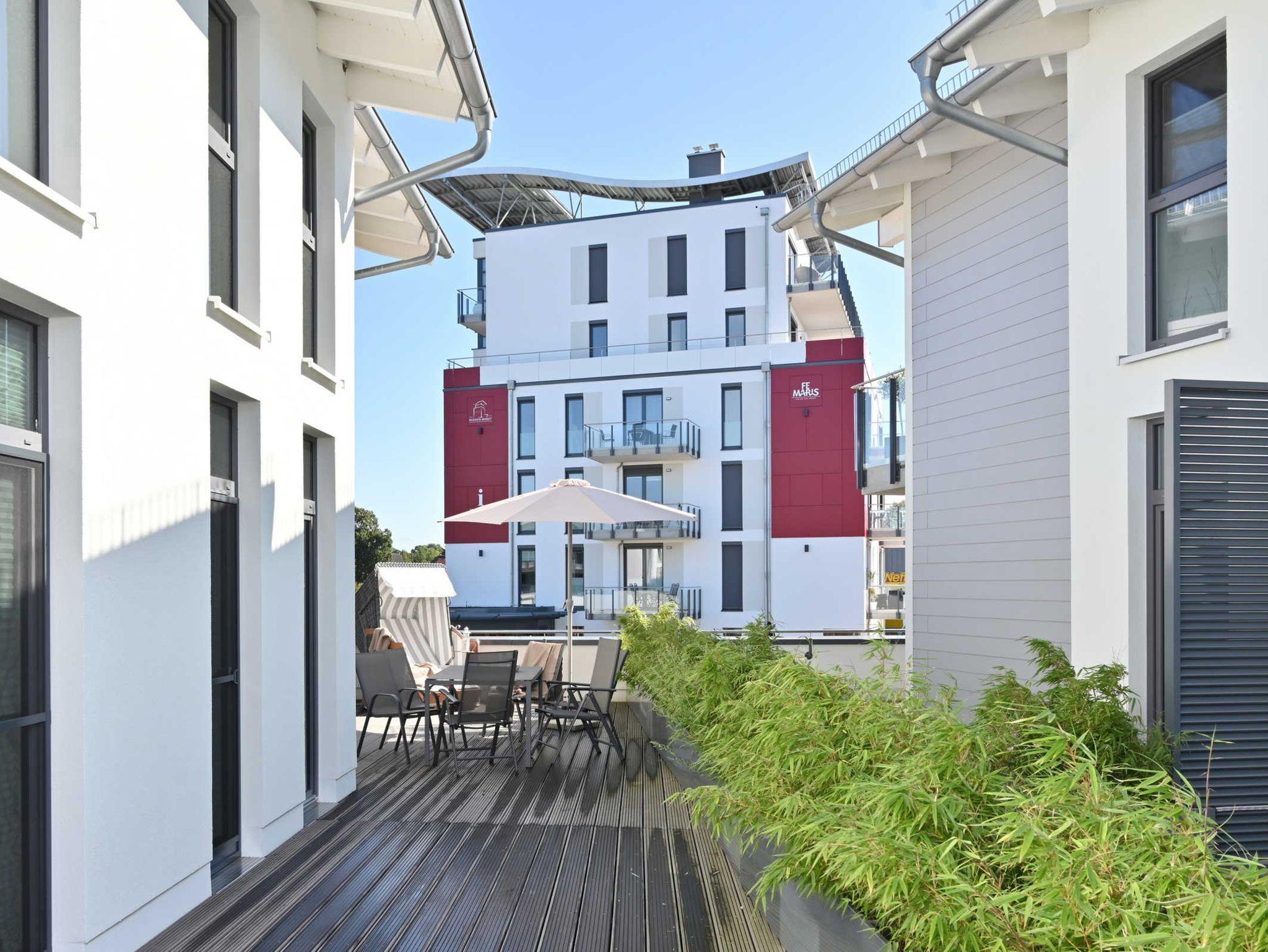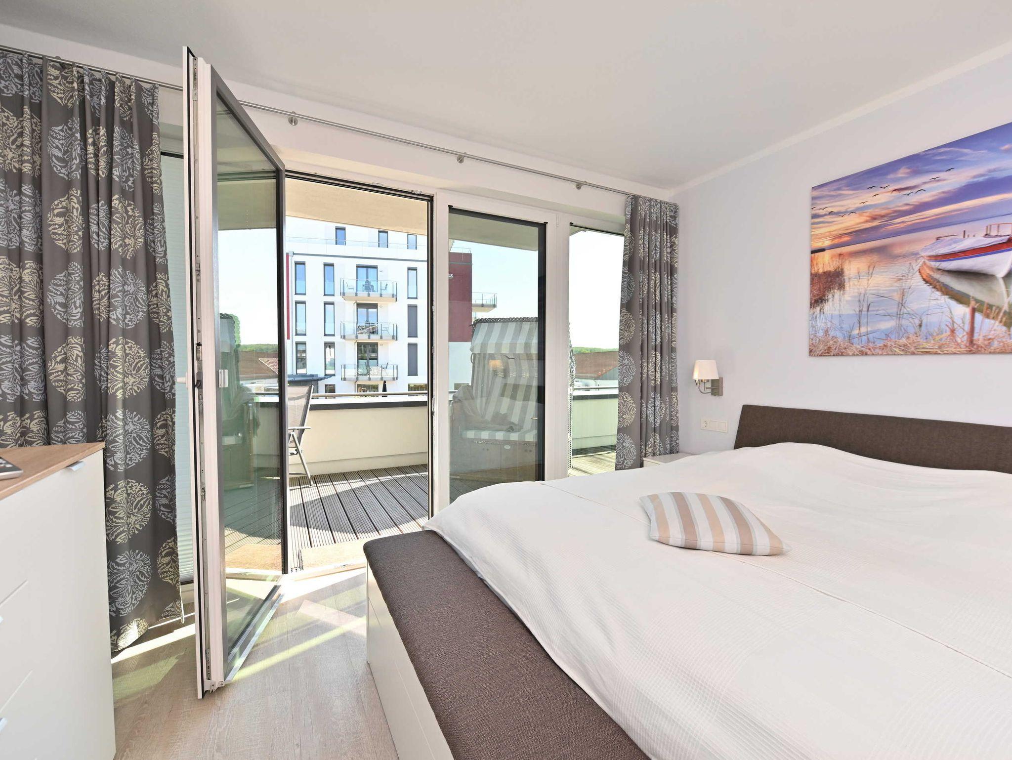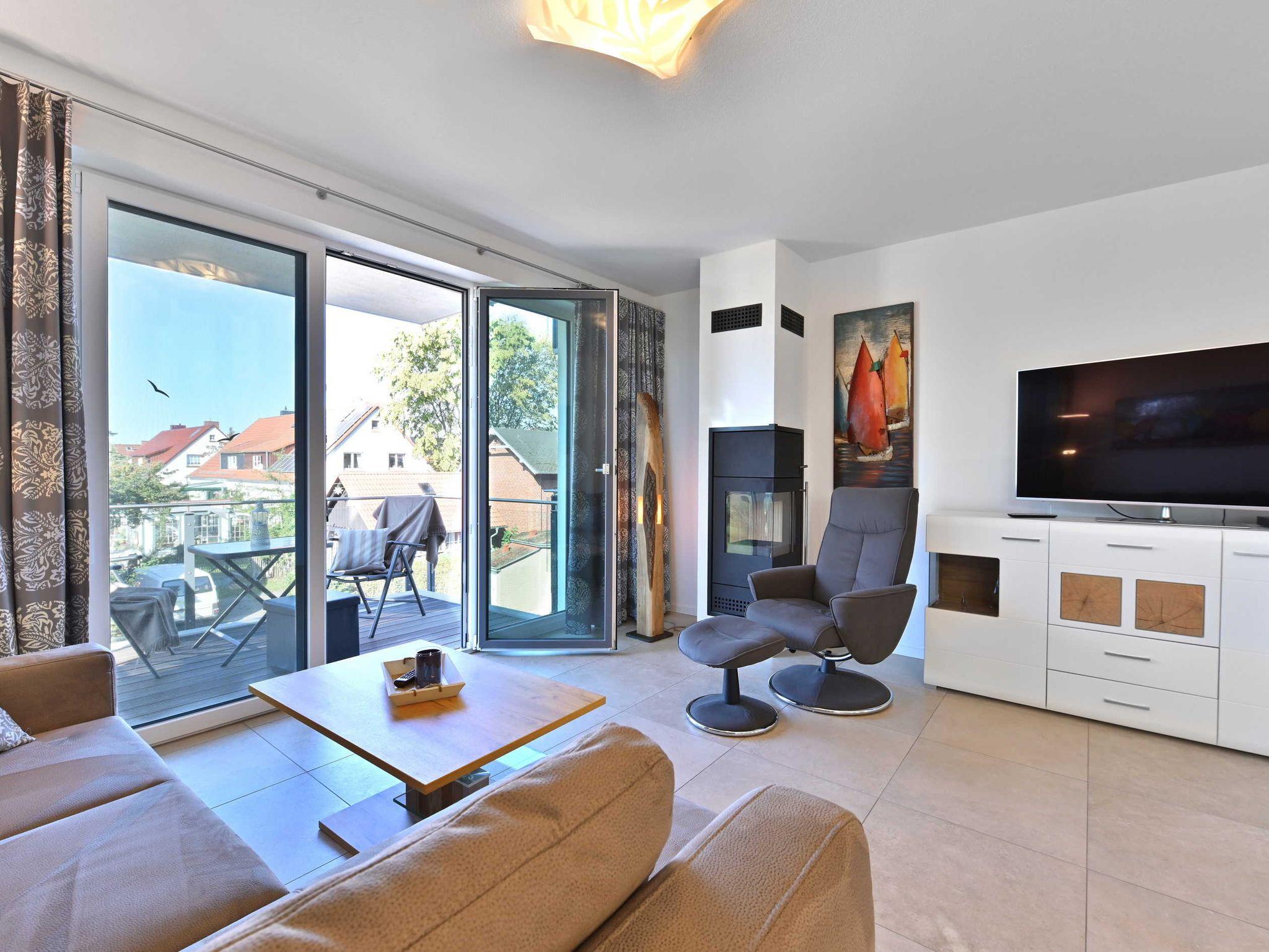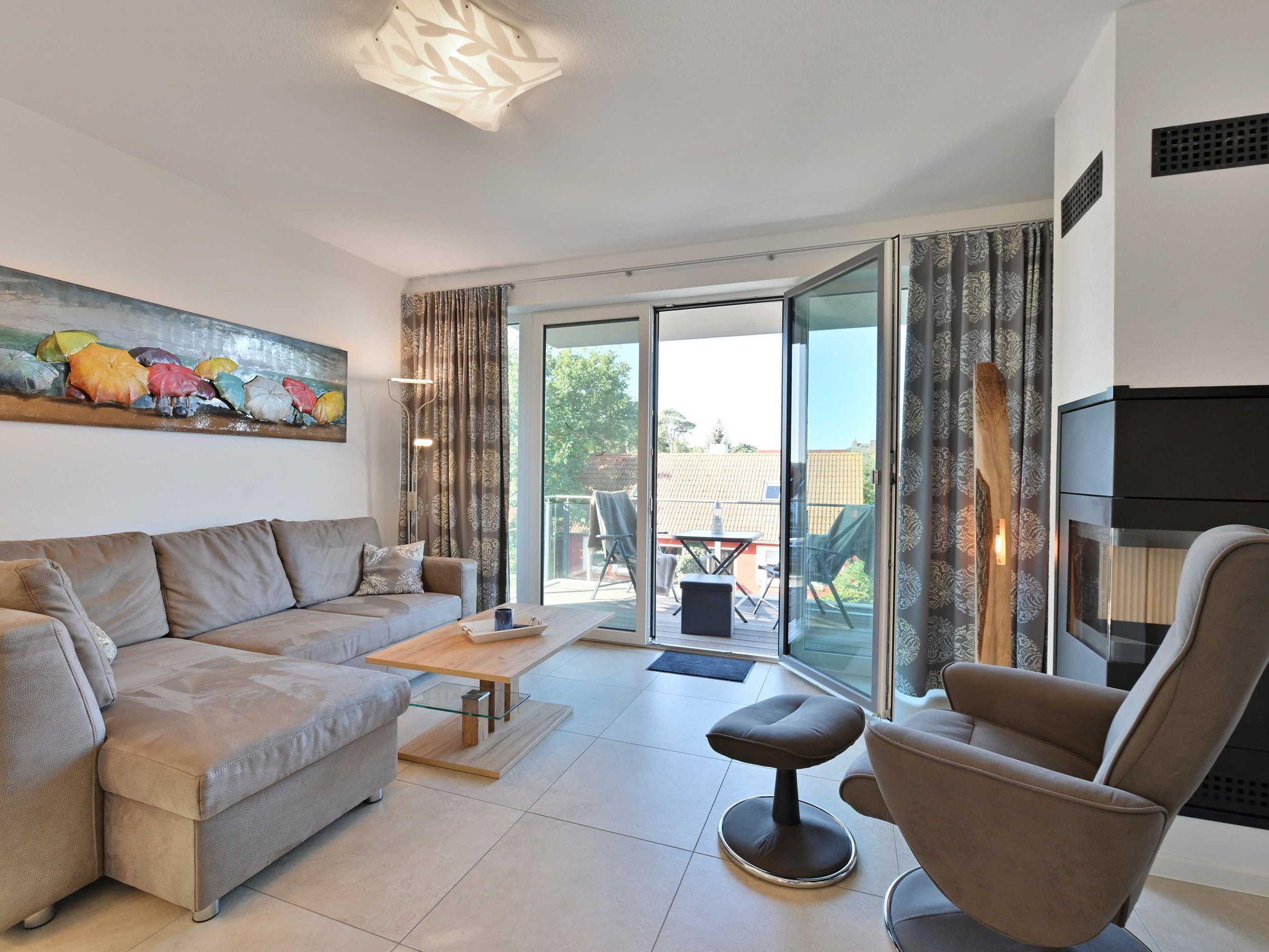 Das Sonnendeck bietet Platz für bis zu 6 Personen (4 Erwachsene und 2 Kinder). Die Wohnung bietet auf 96qm Wohnfläche einen gemütlichen Wohnraum mit integrierter Küche, zwei Schlafräume mit jeweils einem Doppelbett, ein Bad mit Dusche und ein Gäste-WC. Aus allen Räumen erreichen Sie entweder die Terrasse oder den Balkon. Im großzügigen Wohnbereich mit Couchlandschaft mit Schlaffunktion, TV-Gerät und Kamin für gemütliche Stunden ist der Essbereich und eine komfortable Küche integriert. Auf der großen Dachterrasse (61m²) mit Süd-West-Ausrichtung lassen Sie die Seele im Strandkorb baumeln.