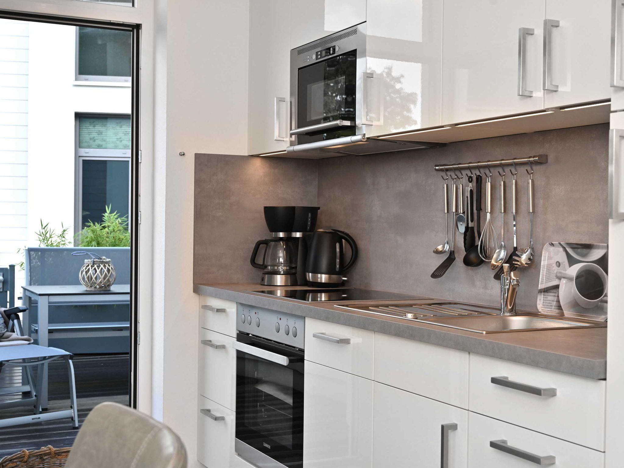 Küche mit Spülmaschine, Herd mit Backofen, Kühlschrank mit Gefriermöglichkeit,